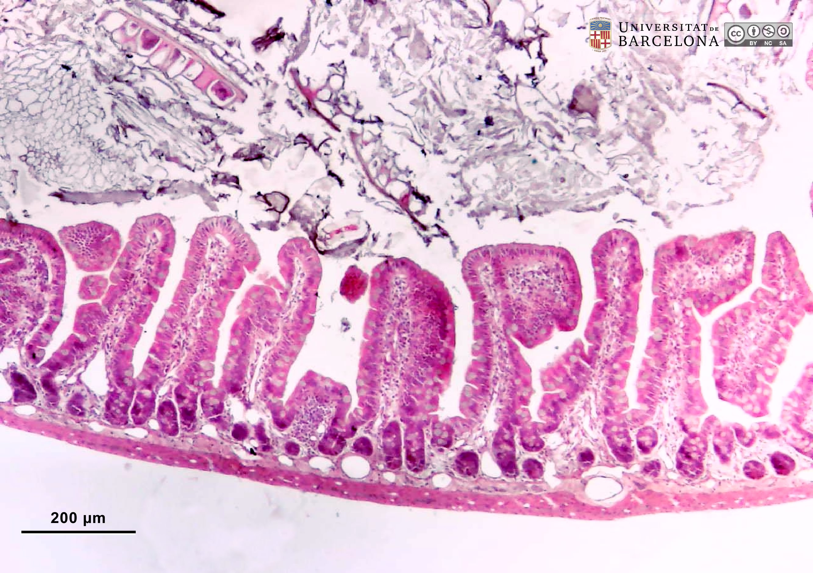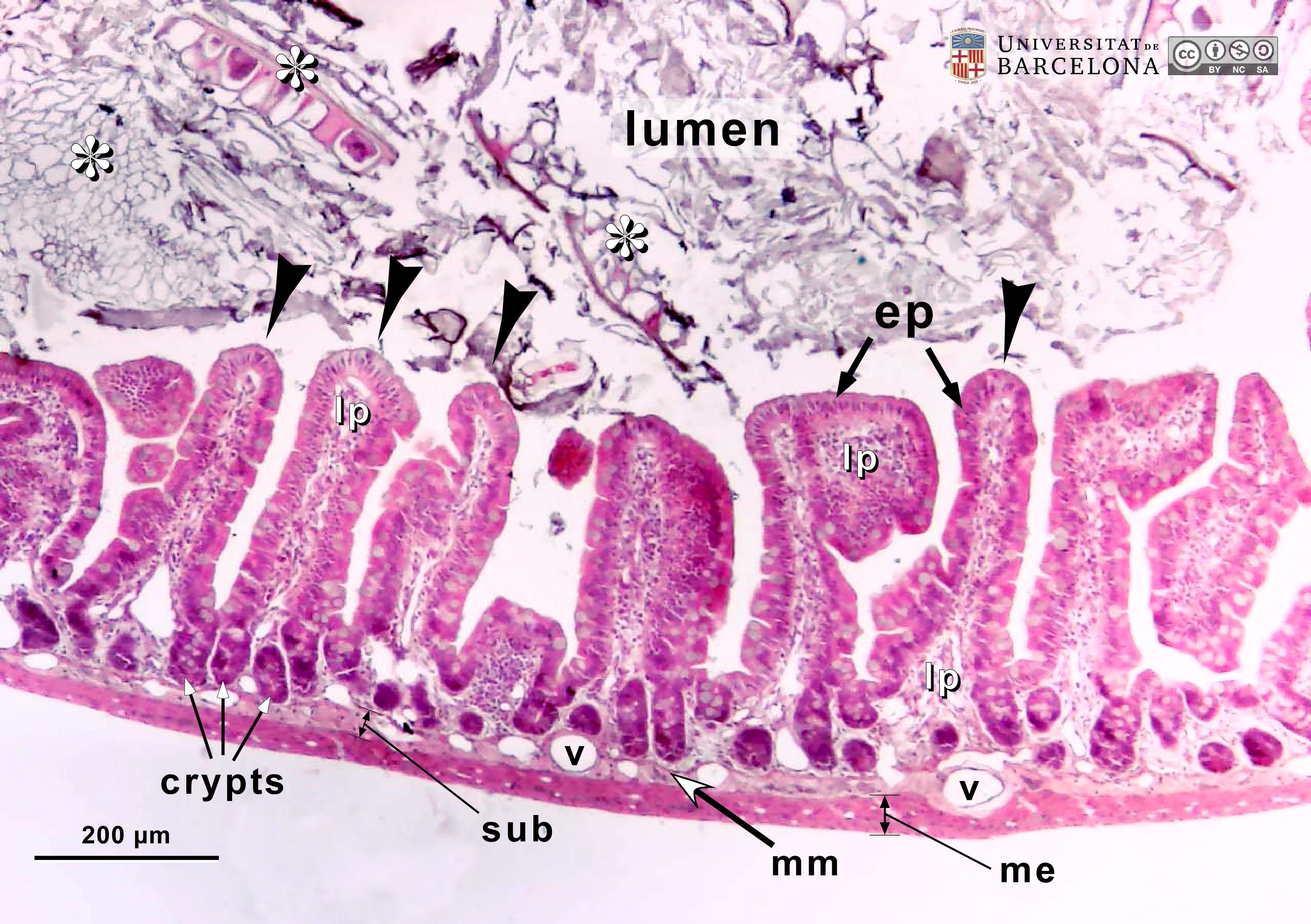 P_intestine_Heosin_ 4x_01_LETTERS.jpg | Wall of the small intestine in mice. Folds of the mucosa form finger-shaped projections termed villi (black arrowheads). These consist of a thin epithelium (ep), stained pink, and loose connective tissue within: the lightly stained lamina propria (lp). The epithelium invaginates into the wall, forming pit-like structures: the crypts. The muscularis mucosæ (mm), the deepest layer of the mucosa, is a thin strip of smooth muscle cells, and is just perceptible at this magnification. Beneath the muscularis mucosæ lies a thin submucosa (sub) and the muscularis externa (me). In the lumen of the intestine, partially digested food is visible, including portions of vegetables with polygonal cell walls (asterisks). Paraffin section, hæmatoxylin-eosin stain. v, blood vessels. | 980.66 kB | JPEG | ![]() View/Open |