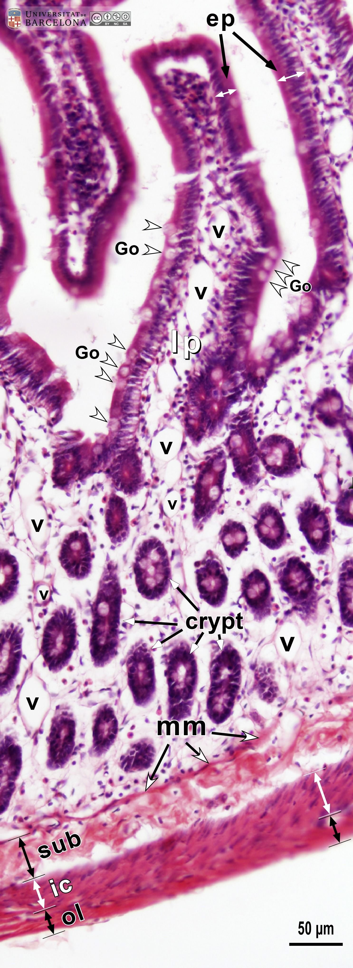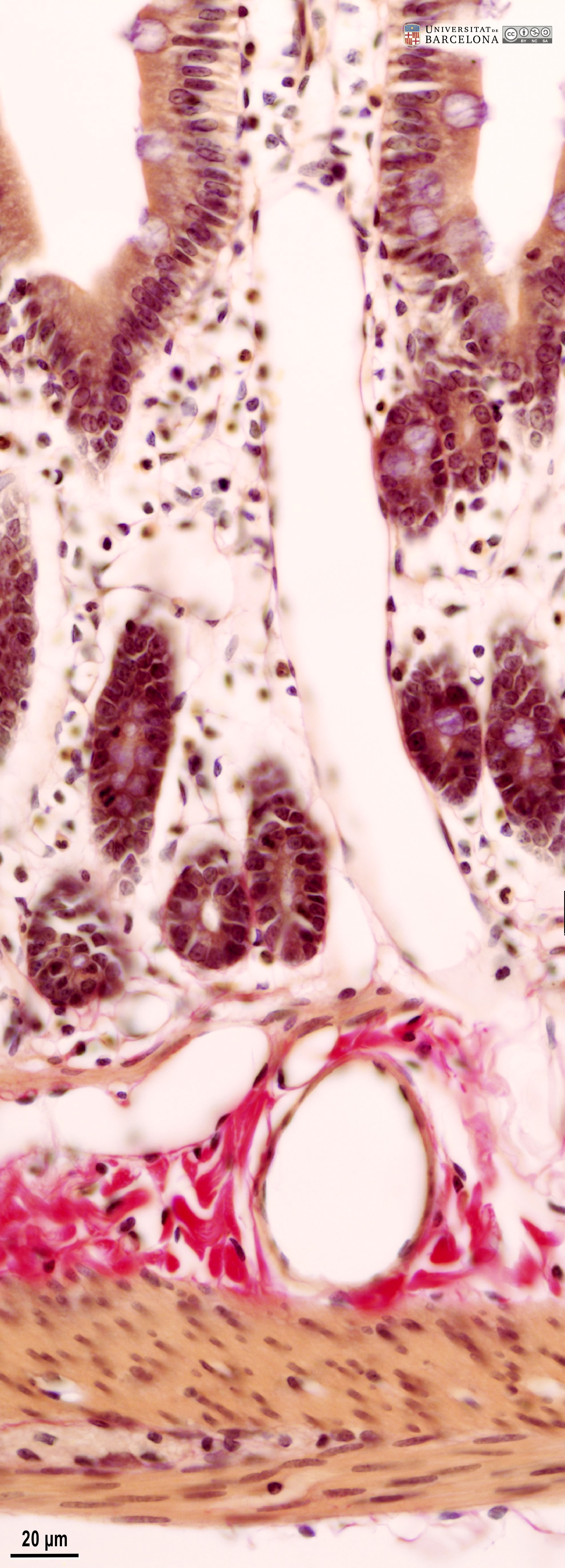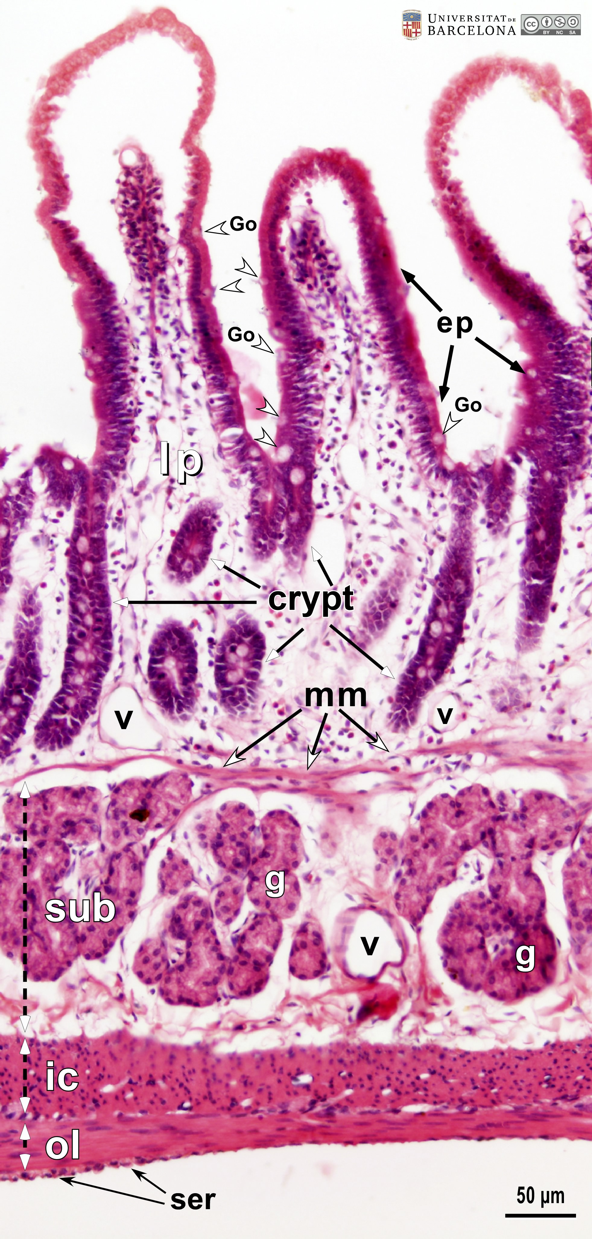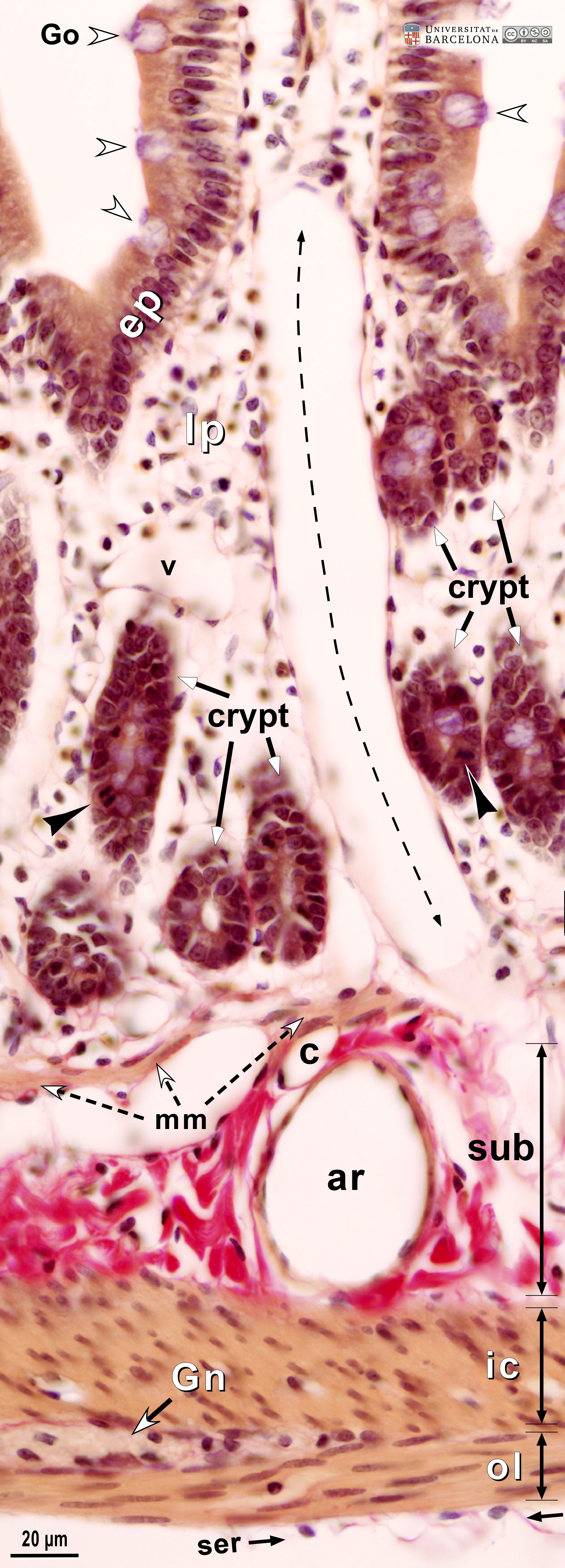 P_O_duodenum_vanGieson_50x_19_23_collage_LETTERS.jpg | Detail of the layers in the small intestine in a rat (collage of micrographs allowing detailed zoom). The base of a villus is seen at the top: it is lined with a simple columnar epithelium (ep) containing absorptive cells with a dark nucleus and pale brown cytoplasm, and goblet cells with a round accumulation of mucus located apically and stained lilac (Go). The surface epithelium invaginates into the mucosa, forming crypts, in which proliferative cells undergo mitosis (black arrowheads) to constantly renew the epithelium of the villi. Inside the villi and between the crypts, a palely stained lamina propria (lp) is present: a lightly stained matrix accommodates darkly stained cells and numerous blood vessels (v and bidirectional dashed segment). The inner border of the mucosa consists of a thin layer of smooth muscle cells: the muscularis mucosae (mm). Beneath this lies the submucosa (sub) containing many blood vessels – arteries (ar), veins, and capillaries (c) –, scattered cells, and a dense matrix of collagen fibres vividly stained with acid fuchsin. Underneath, a thick layer of smooth muscle cells is observed, with a pale brown cytoplasm and dark nucleus. According to the cell orientation, this layer is divided into two: an inner or circular layer (ic) and an outer or longitudinal layer (ol). In this longitudinal section of the intestine, the elongated cell nuclei appear as round sections in the inner/circular layer, while they can be seen at full length in the outer/longitudinal layer. Between these two muscular layers, ganglia of the myenteric – Auerbach's – plexus can be observed (Gn). A thin serosa (ser) forms the external envelope of the tube. Paraffin section, van Gieson trichrome. | 1.39 MB | JPEG | ![]() View/Open |