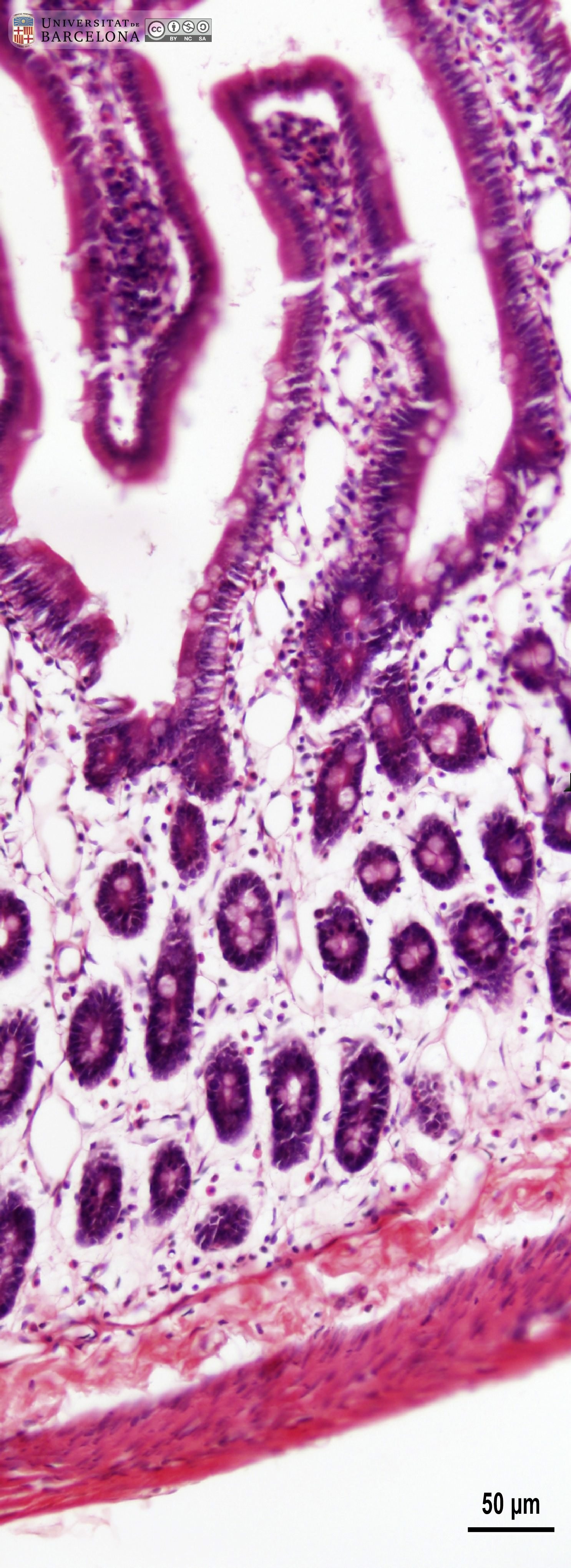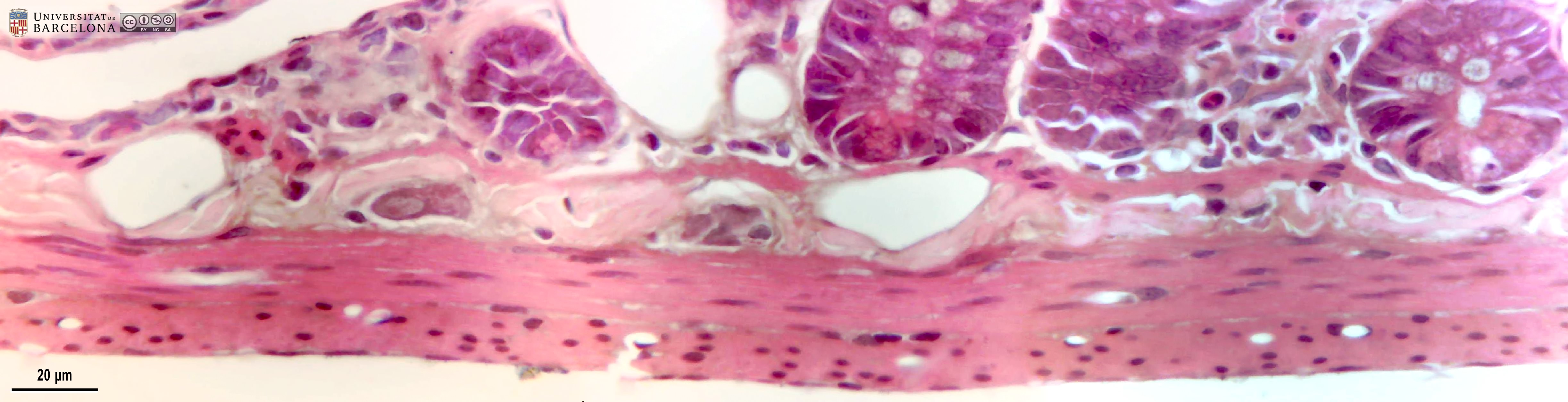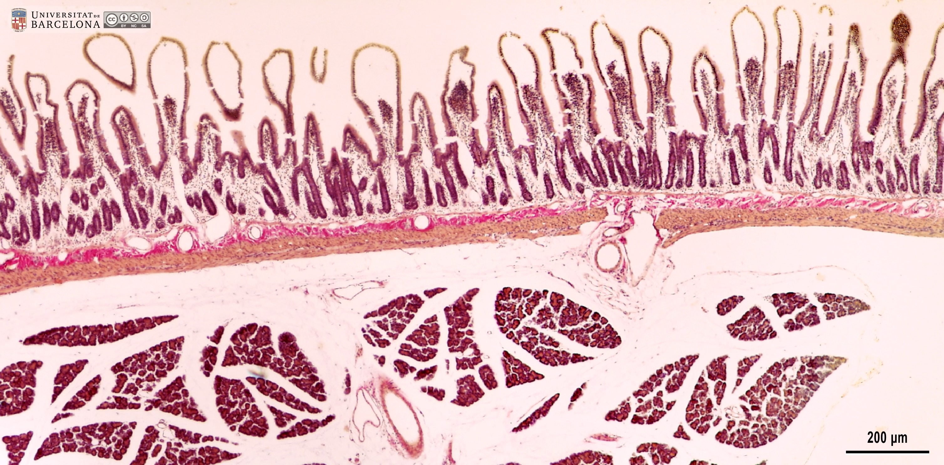 P_O_duodenum_vanGieson_50x_19_23_collage_LETTERS.jpg | Detail of the layers in the small intestine in a rat (collage of micrographs allowing detailed zoom). The base of a villus is seen at the top: it is lined with a simple columnar epithelium (ep) containing absorptive cells with a dark nucleus and pale brown cytoplasm, and goblet cells with a round accumulation of mucus located apically and stained lilac (Go). The surface epithelium invaginates into the mucosa, forming crypts, in which proliferative cells undergo mitosis (black arrowheads) to constantly renew the epithelium of the villi. Inside the villi and between the crypts, a palely stained lamina propria (lp) is present: a lightly stained matrix accommodates darkly stained cells and numerous blood vessels (v and bidirectional dashed segment). The inner border of the mucosa consists of a thin layer of smooth muscle cells: the muscularis mucosae (mm). Beneath this lies the submucosa (sub) containing many blood vessels – arteries (ar), veins, and capillaries (c) –, scattered cells, and a dense matrix of collagen fibres vividly stained with acid fuchsin. Underneath, a thick layer of smooth muscle cells is observed, with a pale brown cytoplasm and dark nucleus. According to the cell orientation, this layer is divided into two: an inner or circular layer (ic) and an outer or longitudinal layer (ol). In this longitudinal section of the intestine, the elongated cell nuclei appear as round sections in the inner/circular layer, while they can be seen at full length in the outer/longitudinal layer. Between these two muscular layers, ganglia of the myenteric – Auerbach's – plexus can be observed (Gn). A thin serosa (ser) forms the external envelope of the tube. Paraffin section, van Gieson trichrome. | 1.39 MB | JPEG | ![]() View/Open |