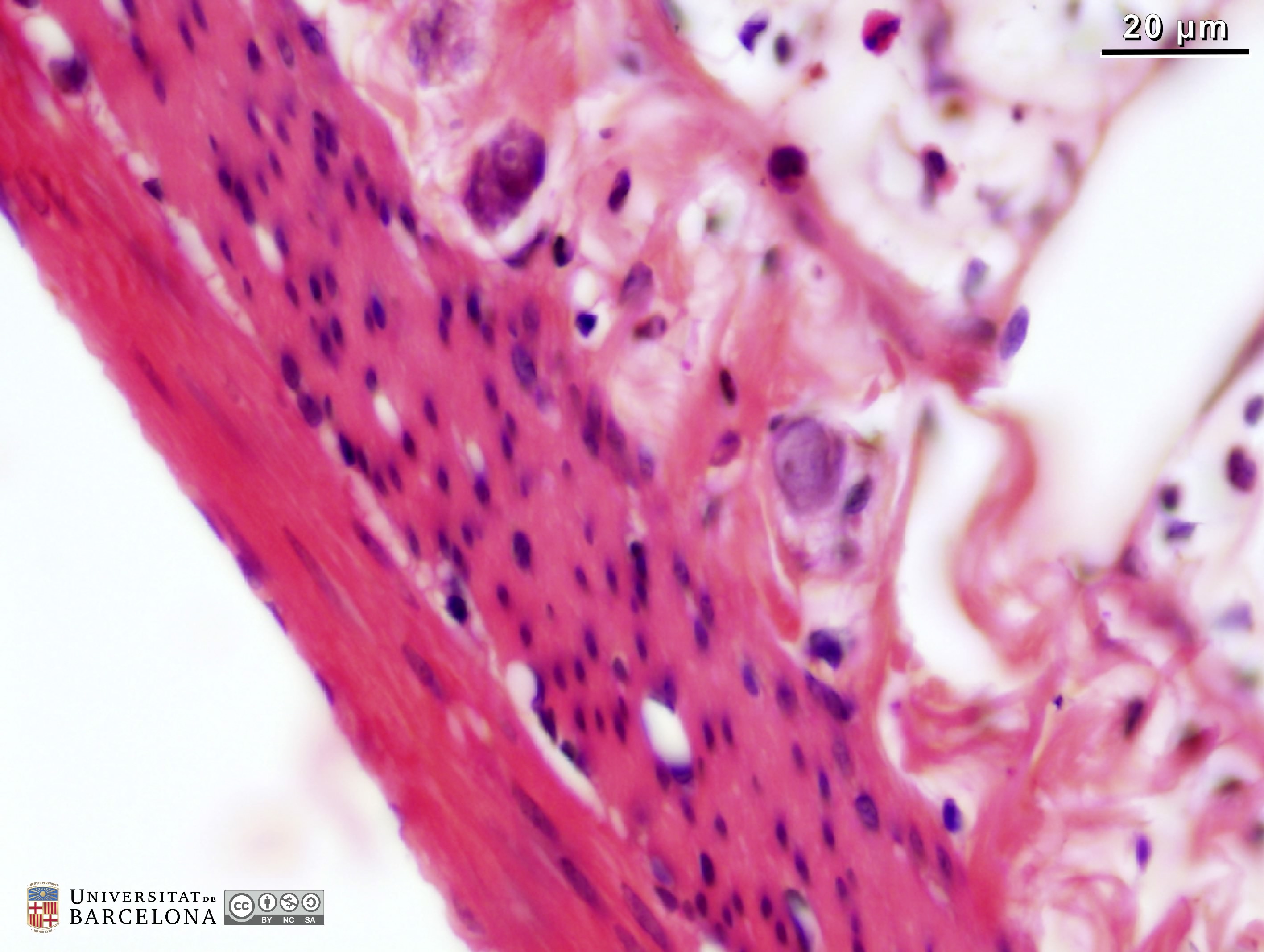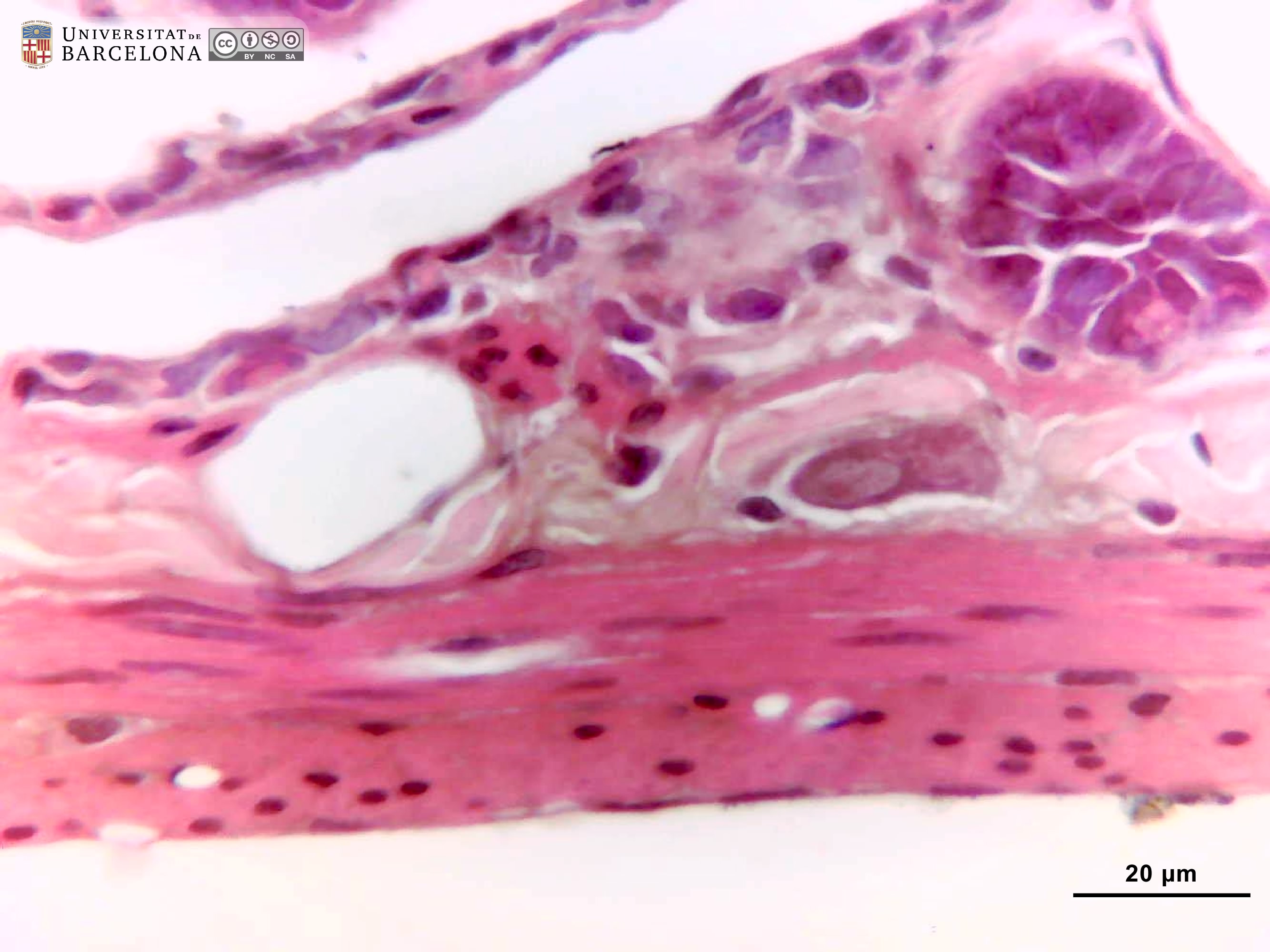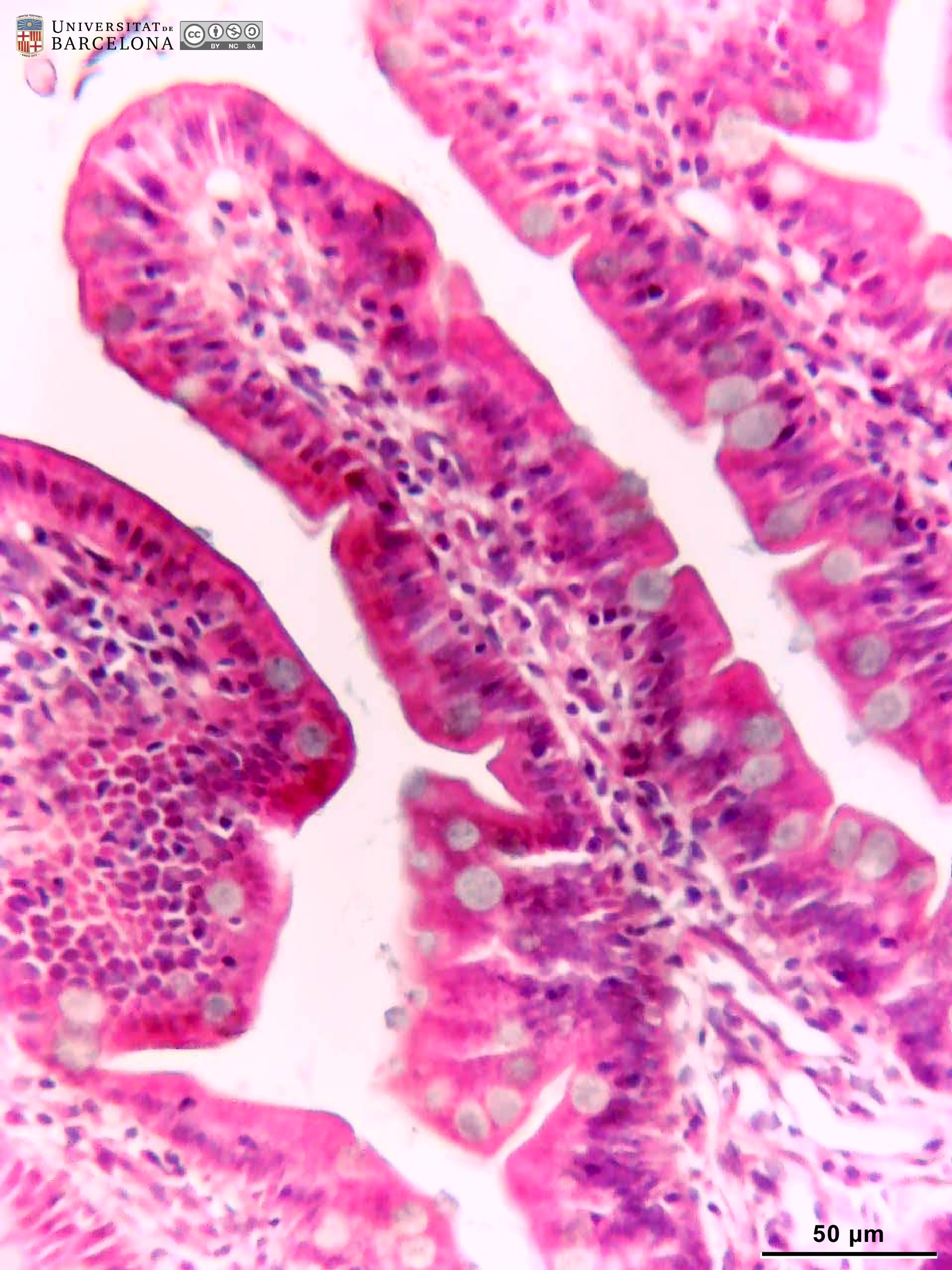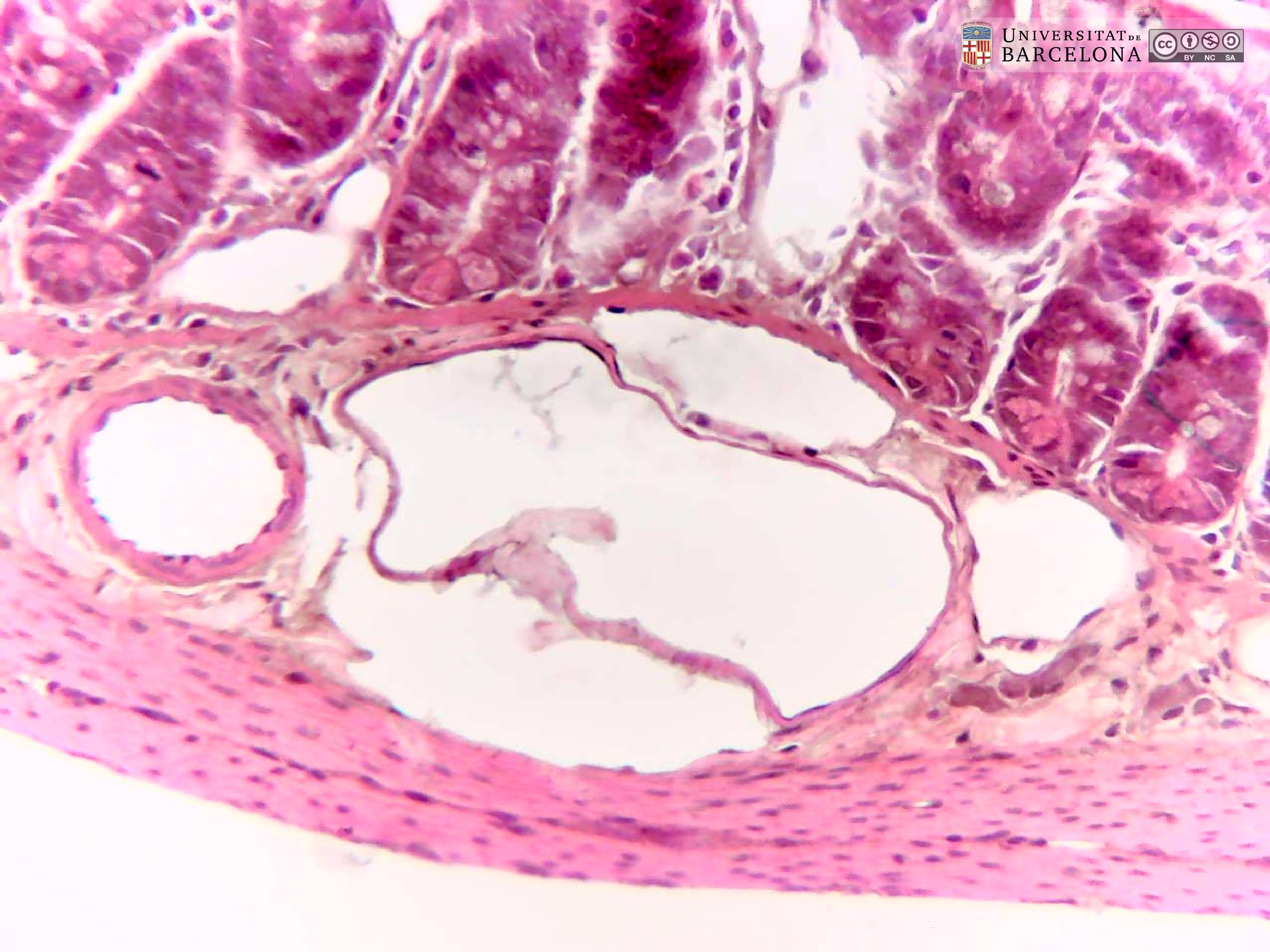 P_O_duodenum_vanGieson_50x_19_23_collage_LETTERS.jpg | Detail of the layers in the small intestine in a rat (collage of micrographs allowing detailed zoom). The base of a villus is seen at the top: it is lined with a simple columnar epithelium (ep) containing absorptive cells with a dark nucleus and pale brown cytoplasm, and goblet cells with a round accumulation of mucus located apically and stained lilac (Go). The surface epithelium invaginates into the mucosa, forming crypts, in which proliferative cells undergo mitosis (black arrowheads) to constantly renew the epithelium of the villi. Inside the villi and between the crypts, a palely stained lamina propria (lp) is present: a lightly stained matrix accommodates darkly stained cells and numerous blood vessels (v and bidirectional dashed segment). The inner border of the mucosa consists of a thin layer of smooth muscle cells: the muscularis mucosae (mm). Beneath this lies the submucosa (sub) containing many blood vessels – arteries (ar), veins, and capillaries (c) –, scattered cells, and a dense matrix of collagen fibres vividly stained with acid fuchsin. Underneath, a thick layer of smooth muscle cells is observed, with a pale brown cytoplasm and dark nucleus. According to the cell orientation, this layer is divided into two: an inner or circular layer (ic) and an outer or longitudinal layer (ol). In this longitudinal section of the intestine, the elongated cell nuclei appear as round sections in the inner/circular layer, while they can be seen at full length in the outer/longitudinal layer. Between these two muscular layers, ganglia of the myenteric – Auerbach's – plexus can be observed (Gn). A thin serosa (ser) forms the external envelope of the tube. Paraffin section, van Gieson trichrome. | 1.39 MB | JPEG | ![]() View/Open |