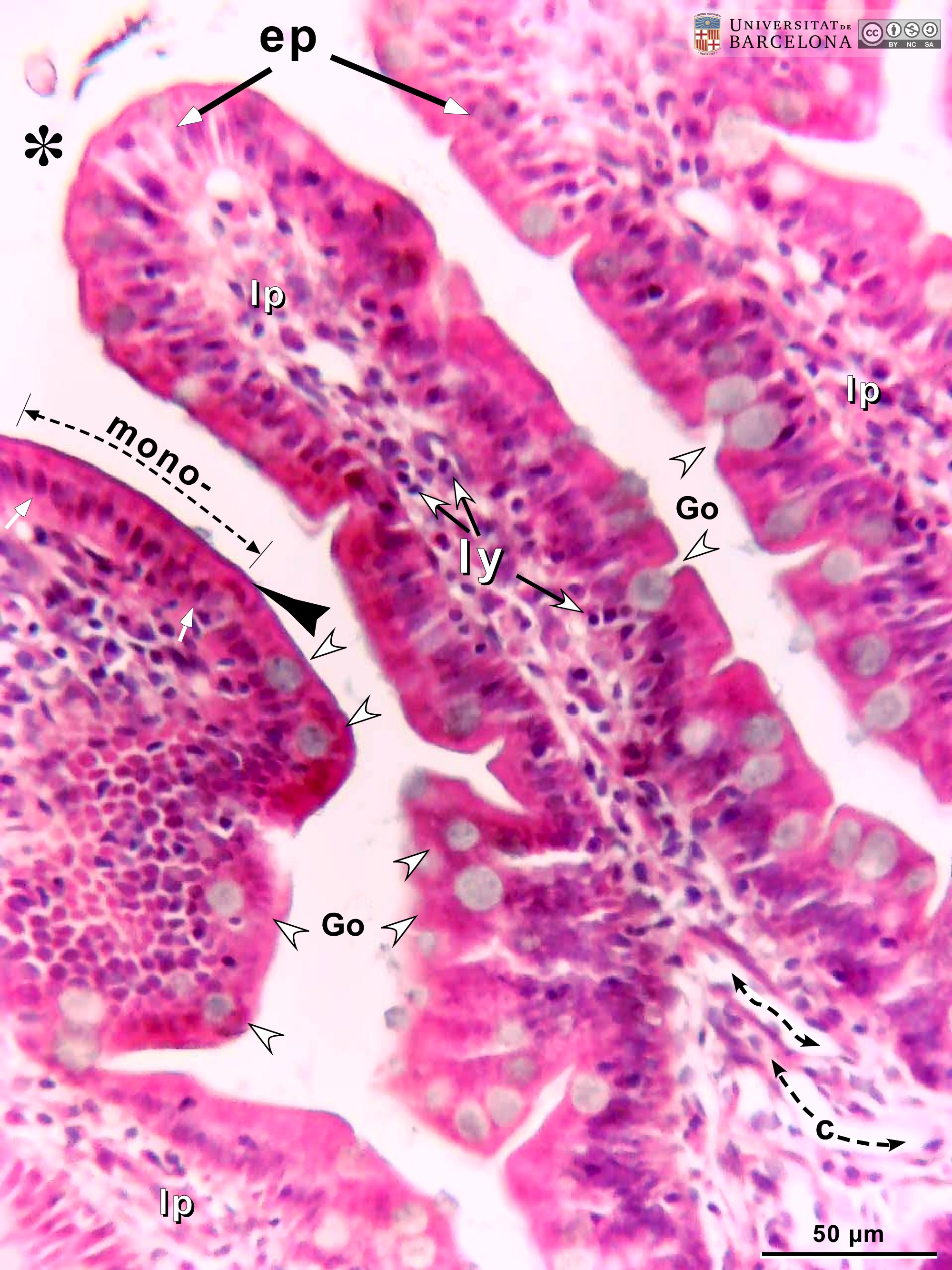 P_intestine_Heosin_vessels_16x_09_LETTERS.jpg | Villi in the small intestine in mice. The villus at the centre (asterisk) exhibits the typical finger-like form, with a thin epithelium (ep) lining the surface and staining dark pink, and a lamina propria (lp) in the core of the villus. This lamina propria contains numerous capillaries (c, bidirectional dashed segments) and dispersed cells, some of which are stained dark purple and are likely lymphocytes (ly). In the villus to the left, the simple – mono-layered – epithelium is readily recognised (mono-), with the cell nuclei stained dark purple (white arrows) and located in deep zones of the cells. In contrast, the cytoplasm in the apical portions of the cells is stained dark pink, and the border – the brush border (black arrowhead) – is seen as a dark line at this magnification. Goblet cells (Go) are dispersed between the other epithelial cells, and their round mass of mucous secretory granules stains greyish (Go, and white arrowheads). Paraffin section, hæmatoxylin-eosin stain. | 791.65 kB | JPEG | ![]() View/Open |