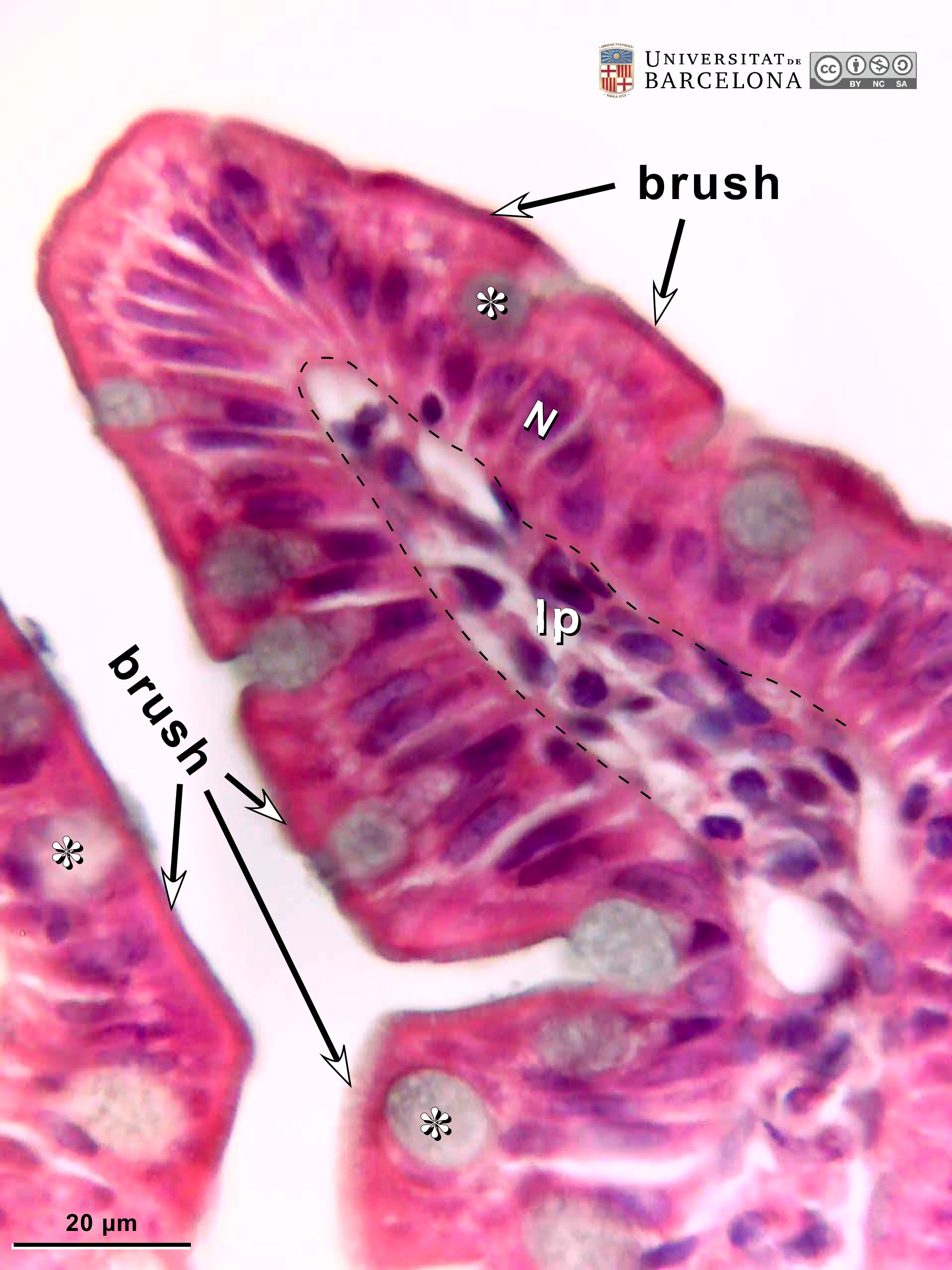 P_intestine_Heosin_brush_40x_16_LETTER.jpg | Tip of a villus in the small intestine in mice. The epithelium is tall and spans from the lamina propria (lp, dashed line) to the surface. Nuclei (N) are stained dark purple and lie in deep portions of the cells, forming a single row of nuclei: a simple or mono-layered epithelium. Cells are tall and their cytoplasm is dark pink. They are absorptive cells, and electron microscopy reveals that the apical surface presents a dense band of microvilli, which are not visible as such in light microscopy, but appear as a dark rim called the "brush border" (arrows). Intercalated between the absorptive cells, there are mucus-secreting cells – the goblet cells – with a round area accumulating mucous secretory granules that appear as round grey masses (asterisks). When the image is enlarged, individual mucous secretory granules are faintly perceptible there. Paraffin section, hæmatoxylin-eosin stain. | 538.01 kB | JPEG | ![]() View/Open |