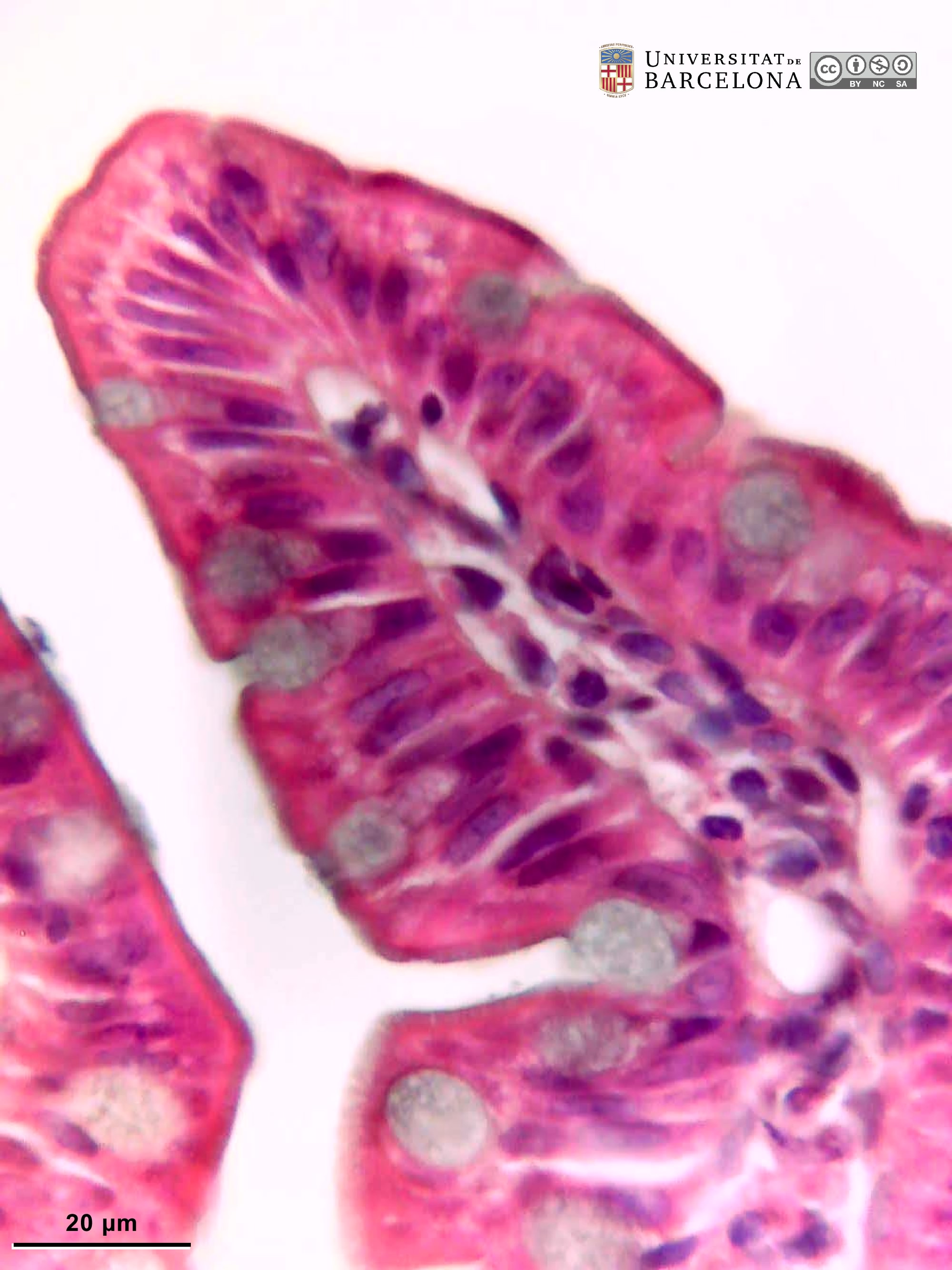 P_O_duodenum2_HEosin_20X_67_69_collageB_LETTERS.jpg | Oblique section of the small intestine in a rat (collage of micrographs allowing moderate zoom). In the labelled villus (centre), the lamina propria (lp) contains numerous vessels (v) and is surrounded by a simple columnar epithelium (ep) consisting of tall cells (white bidirectional arrows) with dark pink cytoplasm and dark purple nuclei, which are aligned in a single row at the basal portion of the cells. Intercalated between these cells, goblet cells (Go) with round, palely-stained accumulations of mucus are observed (white arrowheads). In deeper portions of the mucosa, crypts are cut transversely and appear discontinuous from the surface epithelium, although they are indeed connected. The inner border of the mucosa is defined by the thin muscularis mucosæ (mm) consisting of smooth muscle cells, which stain intensely pink. The submucosa (sub) is thin in this portion of the intestine, but rich in collagenous fibres, and stains dark pink. In the muscularis externa, the two layers – inner (ic) and outer (ol), or circular and longitudinal – can be distinguished, although cell nuclei appear elongated in both cases because of the oblique plane of sectioning in this preparation. Paraffin section, hæmatoxylin-eosin stain. | 1.02 MB | JPEG | ![]() View/Open |