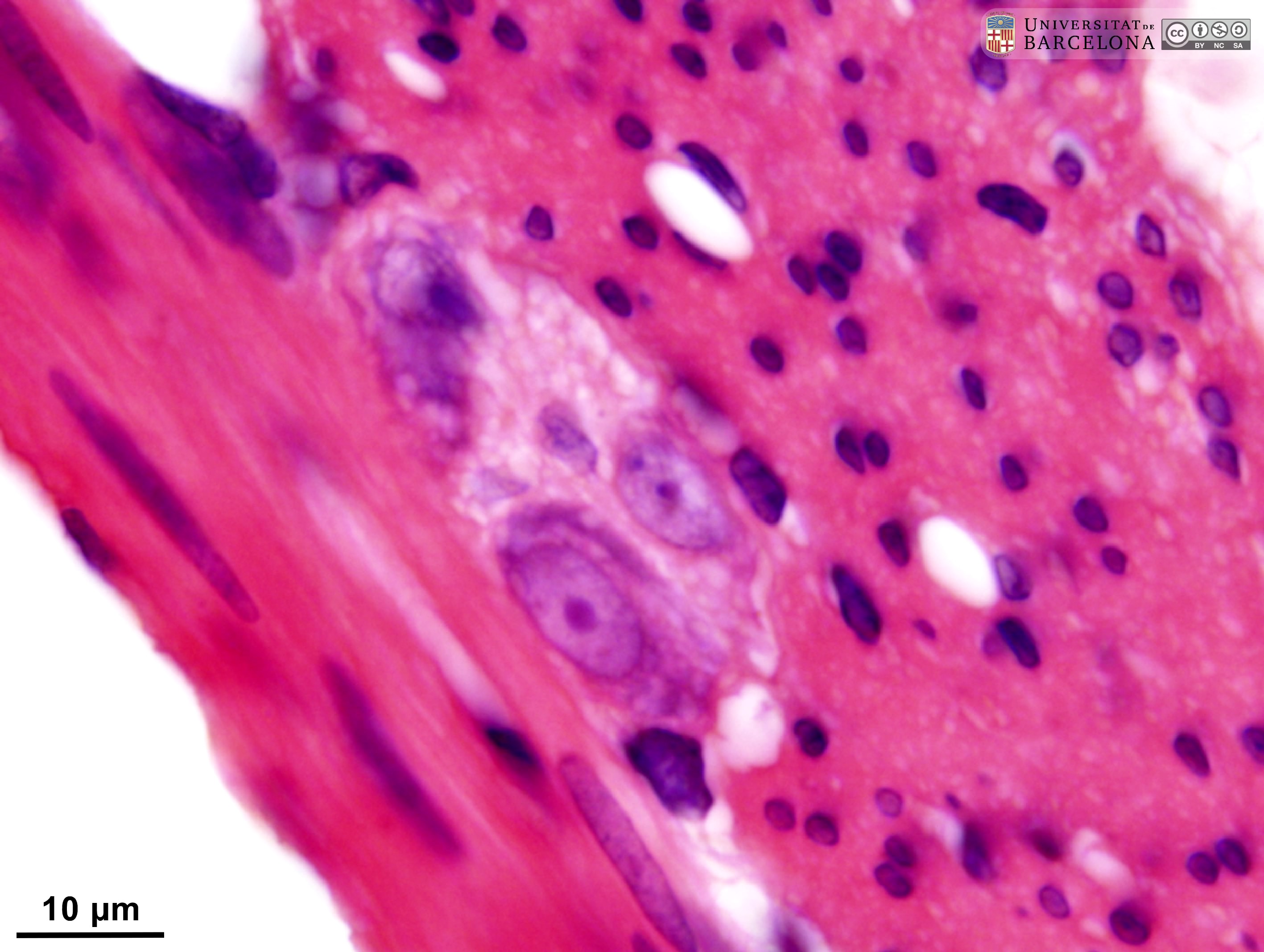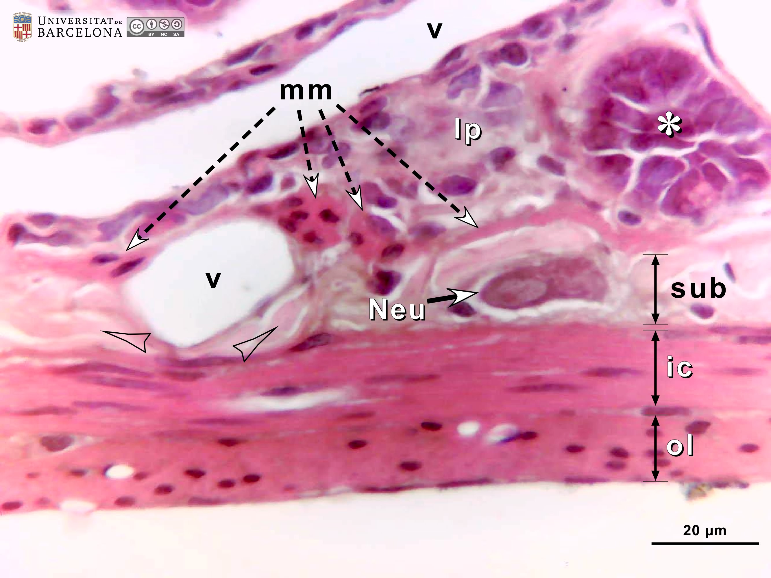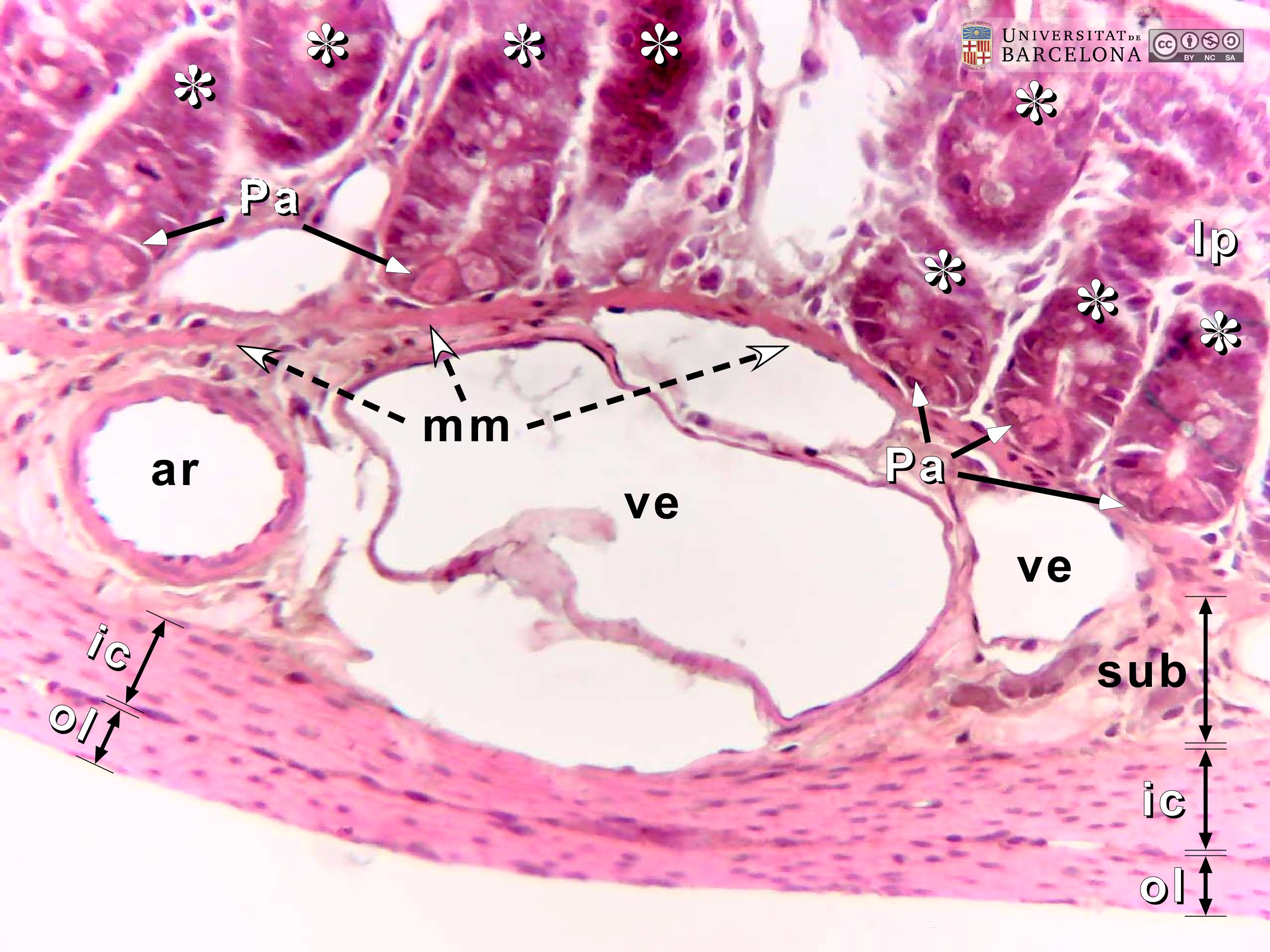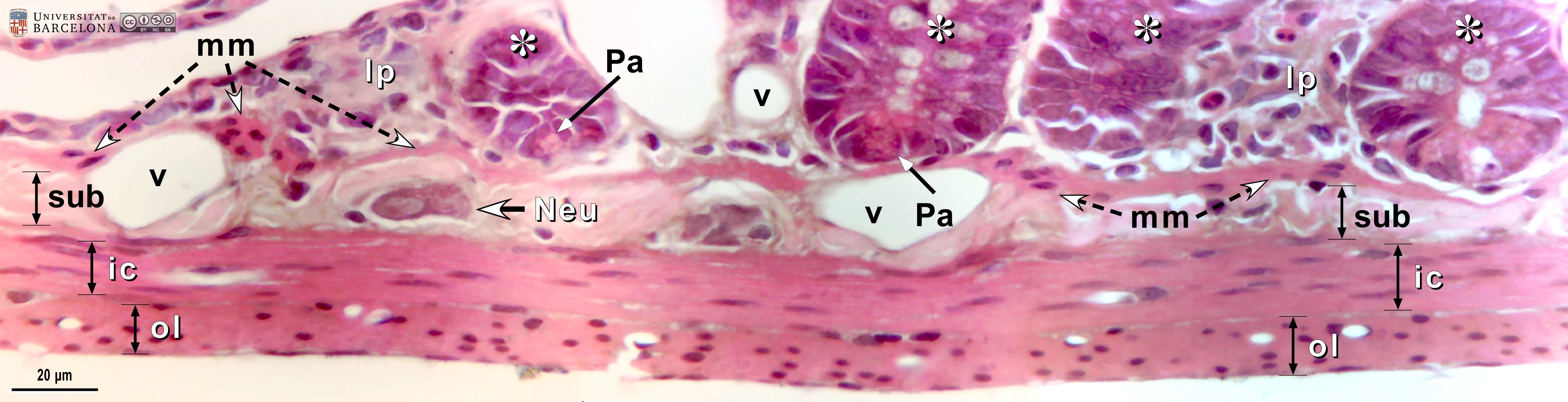 P_intestine_Heosin_40x_12_14_collage_LETTERS.jpg | Deep layers in the small intestine in mice (collage of micrographs allowing detailed zoom). The inner portion of the mucosa is observed containing the bottom of some crypts (asterisks). There, cells are stained purple except for some with mucous secretory granules – stained light grey – and the Paneth cells (Pa), located at the bottom of the crypts and containing bright pink secretory granules. Between the crypts, dispersed cells of the lamina propria (lp) are visible. The deepest portion of the mucosa consists of the muscularis mucosæ layer (mm), composed of smooth muscle cells stained bright pink. Between the muscularis mucosæ and the muscularis externa, a narrow submucosa (sub) is located containing blood vessels (v) and neurones (Neu) of the submucosal – or Meissner's – plexus. In the muscularis externa, the nuclei of the smooth muscle cells in the inner/circular layer (ic) are elongated in this transverse section of the intestine, while those in the outer/longitudinal layer (ol) appear rounded in section, although they are also elongated. Paraffin section, hæmatoxylin-eosin stain. | 811.21 kB | JPEG | ![]() View/Open |