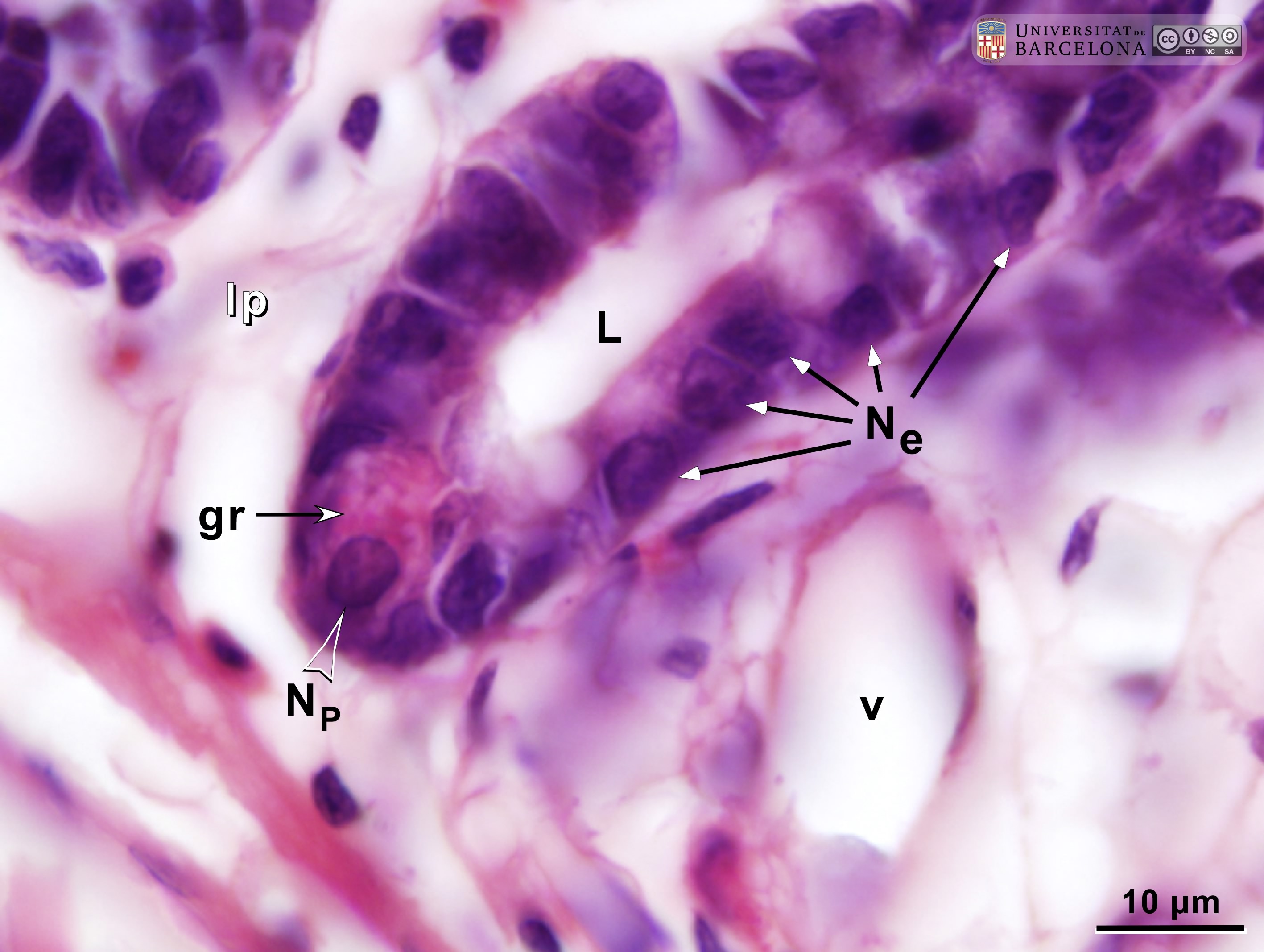 P_O_duodenum2_HEosin_100X_73_Paneth_LETTERS.jpg | Paneth cell in deep portions of a crypt in the rat intestine. The deep end of this crypt is surrounded by the lightly-stained lamina propria (lp). Paneth cells have a dark purple nucleus (NˬP) in the basal part of the cell, and bright pink secretory granules (gr) in the apical part. Enterocytes – the absorptive cells – also have dark purple nuclei (Nˬe) in the basal part but – in contrast to Paneth cells – lack secretory granules in the apical region. Paraffin section, hæmatoxylin-eosin stain. L, lumen of the crypt; v, blood vessels. | 480.32 kB | JPEG | ![]() View/Open |