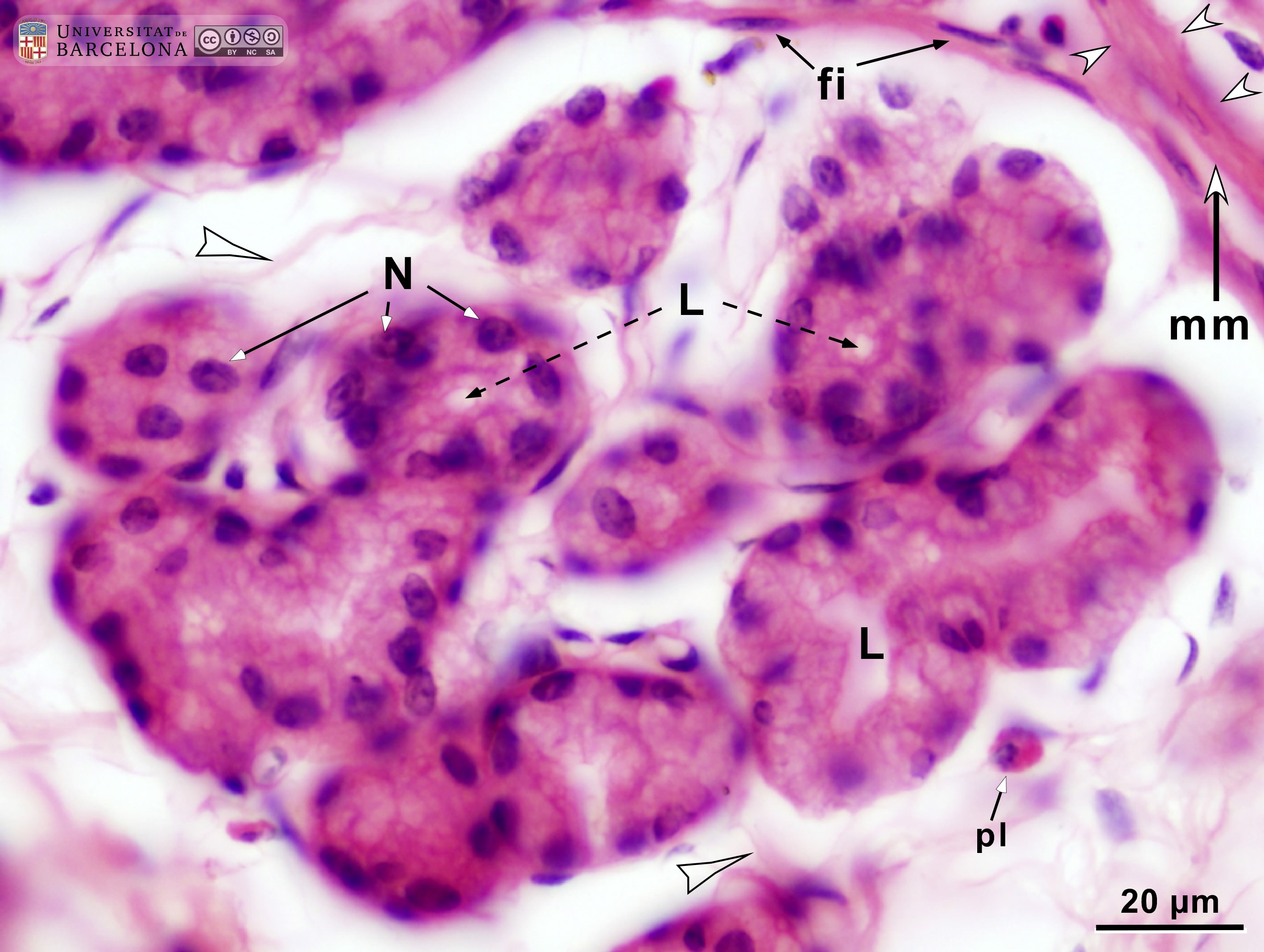 P_O_duodenum2_HEosin_50X_75_submuc_glands_LETTERS.jpg | Islet of Brunner's glands in the submucosa of the duodenum in a rat. These glands are generally described as tubular. This islet is located just underneath the muscularis mucosæ (mm, in the upper right corner). The centre of each secretory mass in the islet presents a lumen (L) which can be wider (compatible with a tubular gland) or narrower. Cell nuclei (N) are located in the periphery (basal part of the cells) and are stained dark purple, with a darker nucleolus noticeable in some of them. The apical part of the cells, towards the lumen, appears to contain large secretory granules with mucus, which are lightly stained. The islet is surrounded by delicate collagen fibres (empty arrowheads) and some connective tissue cells: fibroblasts (fi) and a likely plasma cell (pl). Paraffin section, hæmatoxylin-eosin stain. | 625.83 kB | JPEG | ![]() View/Open |
