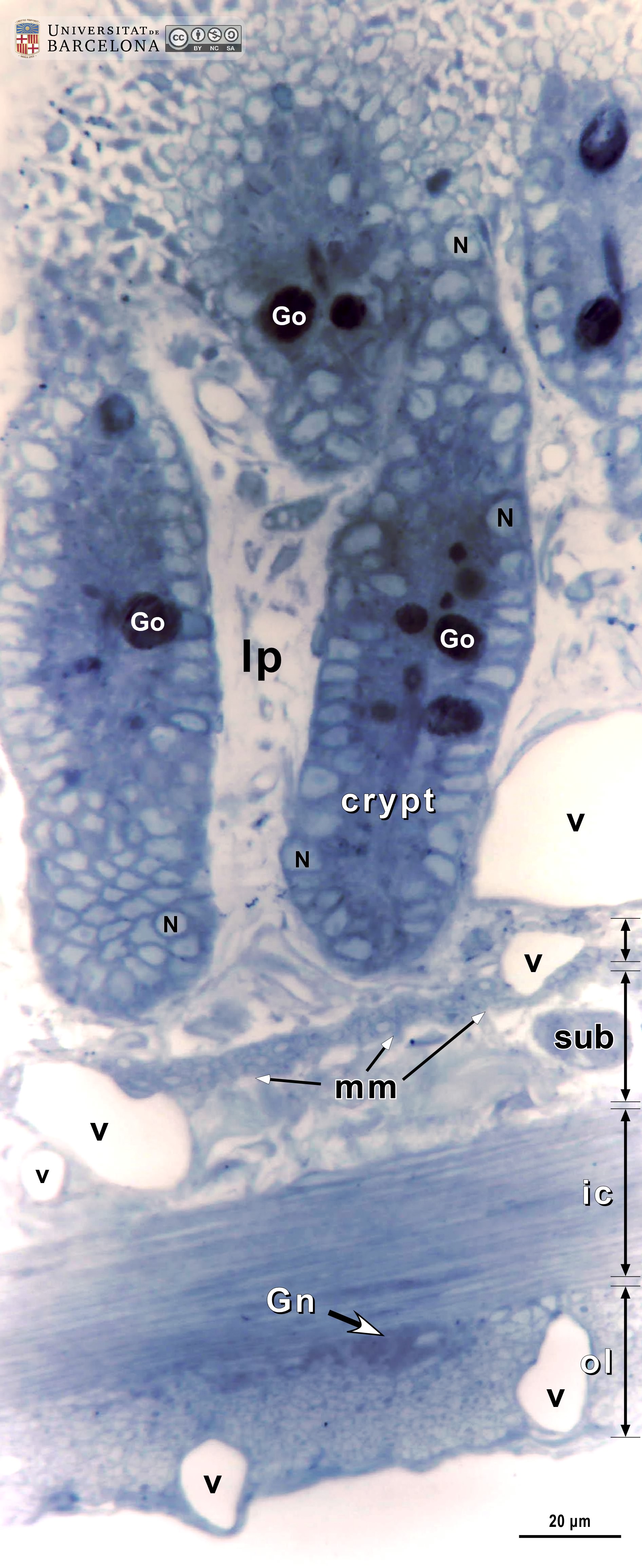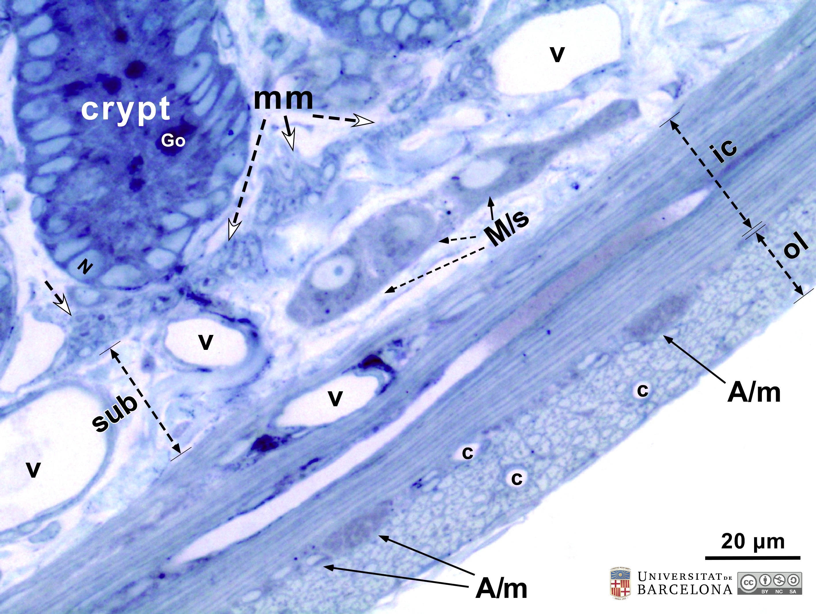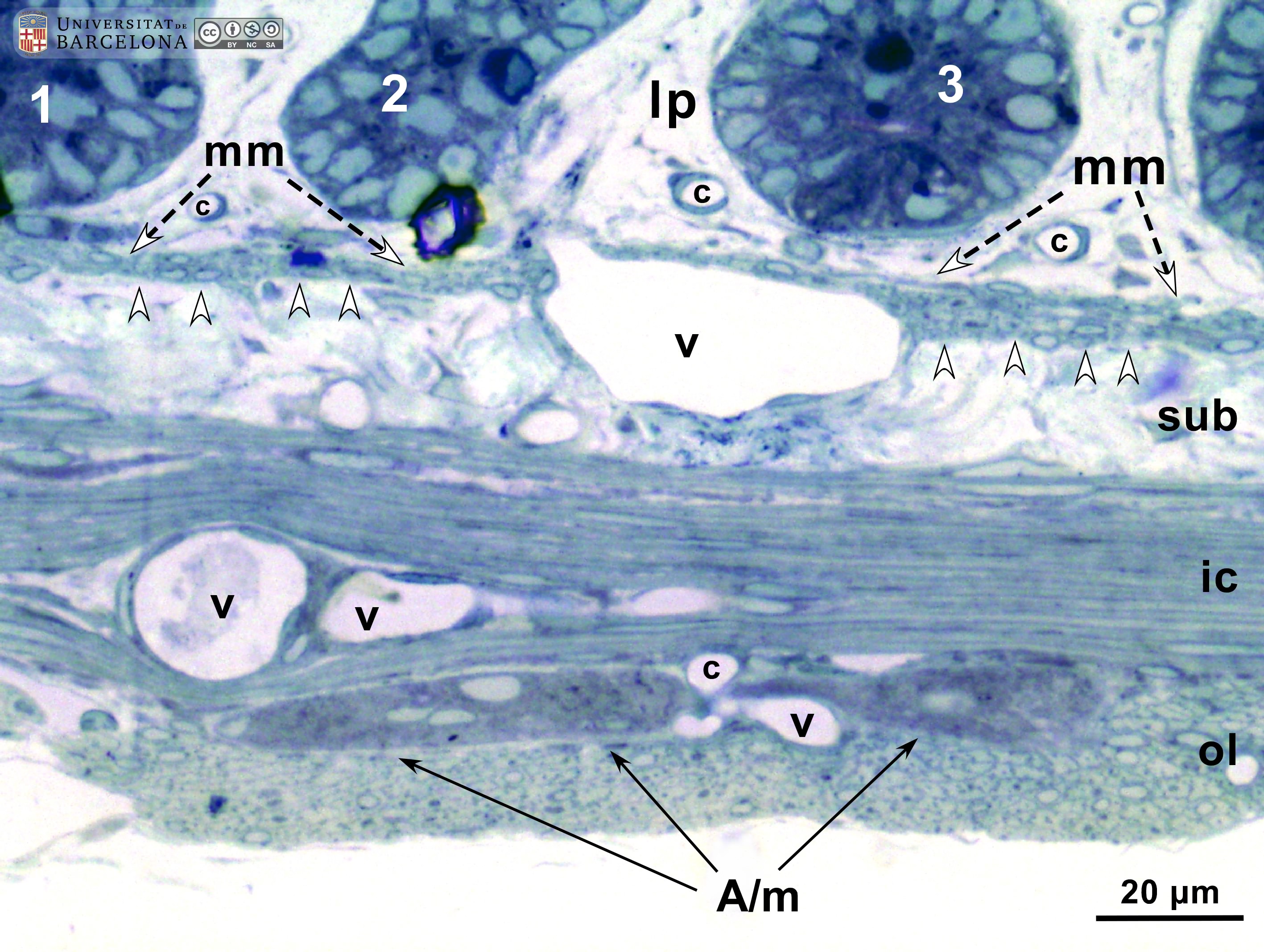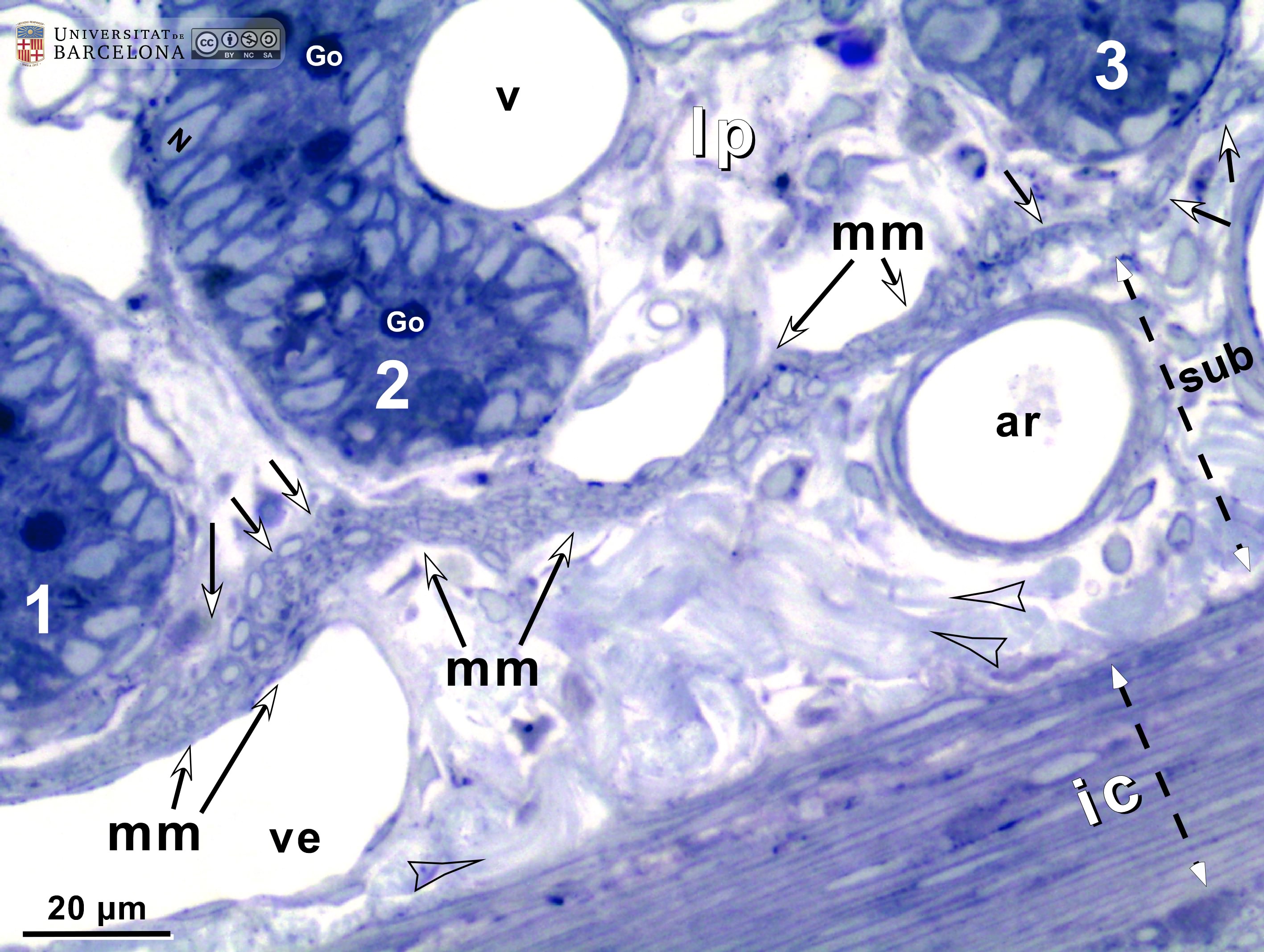 P_O_duodenum2_semithin2um_50X_47_mmucosae_LETTERS.jpg | Deep layers in the duodenal wall in a rat. The muscularis mucosæ (mm, arrows) is sharply delimited. In this layer, smooth muscle cells were sectioned transversally and are arranged in three or four layers of round profiles. Overlying the muscularis mucosa, a pale lamina propria (lp) and the bottom of three crypts (1, 2, 3) are observed. Beneath the muscularis mucosæ lies the submucosa (sub), a layer of connective tissue with thick collagen fibres (empty arrowheads) and various vessels: arterioles (ar) and veins (ve). The previously mentioned lamina propria is also a connective tissue with blood vessels (v) but it lacks the thick collagen fibres characteristic of the submucosa. Beneath the submucosa, the inner – circular – layer of smooth muscle (ic) is observed with cells cut longitudinally. Osmium tetraoxide postfixation, epoxy section 2 µm thick, toluidine blue stain. Go, mucous granules in goblet cells; N, nucleus in an epithelial cell in a crypt. | 883 kB | JPEG | ![]() View/Open |