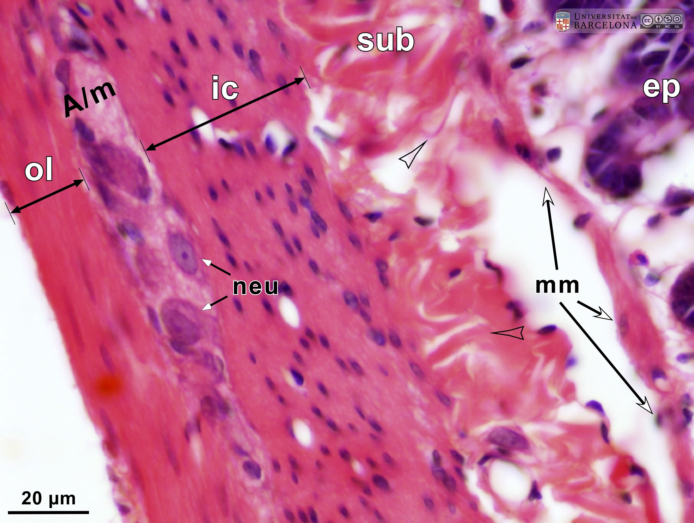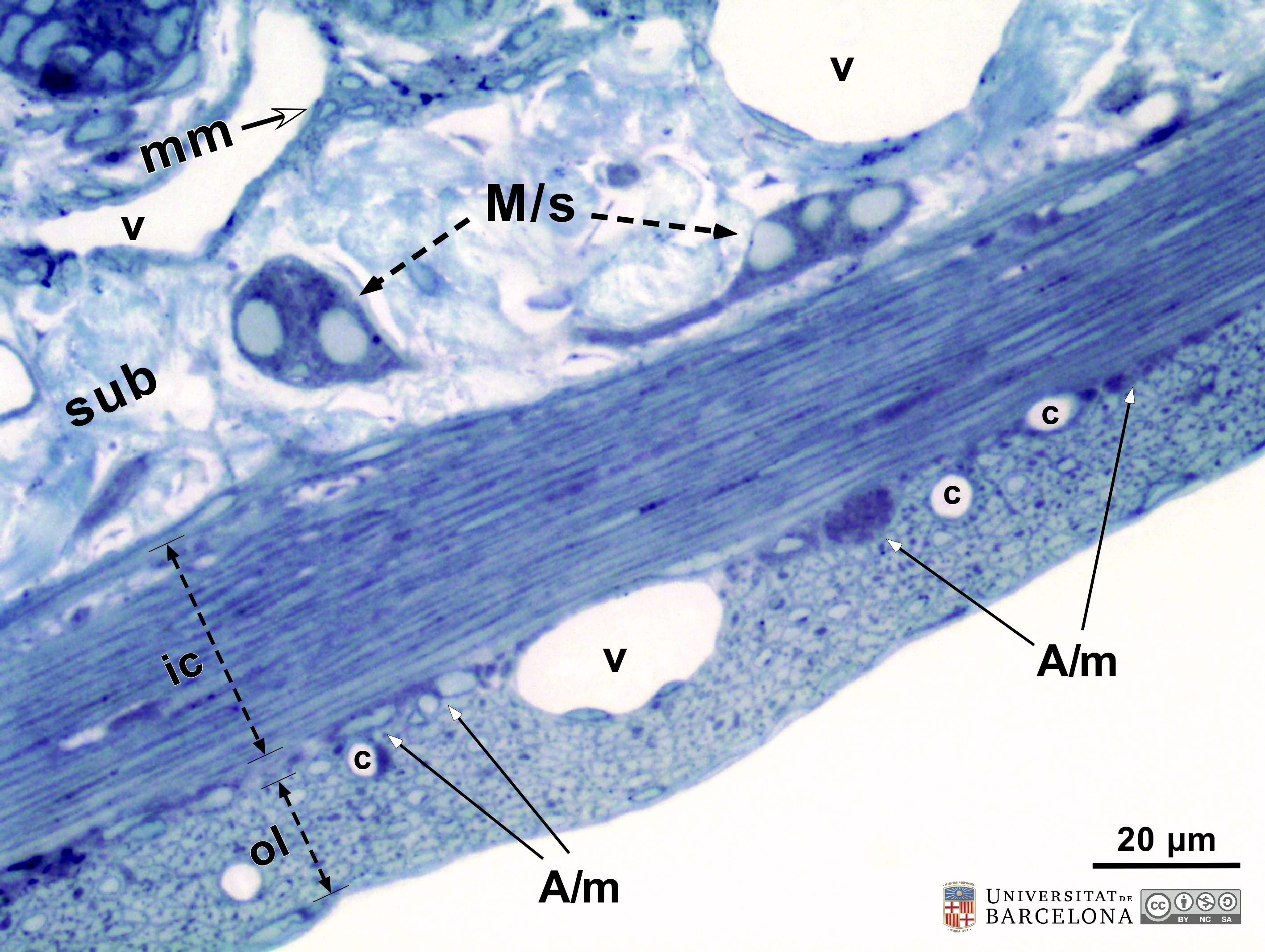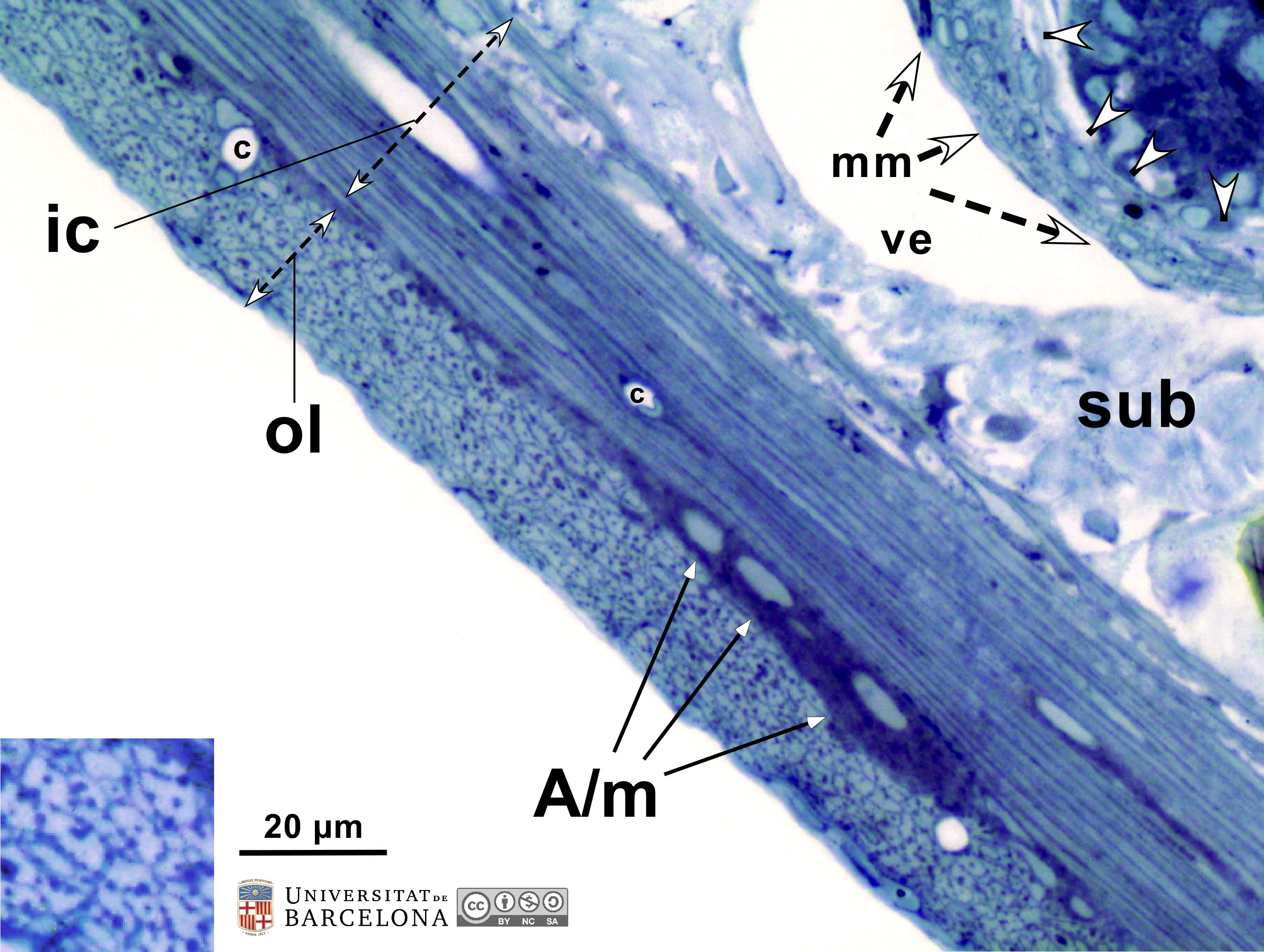 P_O_duodenum2_semithin2um_50X_47_mmucosae_LETTERS.jpg | Deep layers in the duodenal wall in a rat. The muscularis mucosæ (mm, arrows) is sharply delimited. In this layer, smooth muscle cells were sectioned transversally and are arranged in three or four layers of round profiles. Overlying the muscularis mucosa, a pale lamina propria (lp) and the bottom of three crypts (1, 2, 3) are observed. Beneath the muscularis mucosæ lies the submucosa (sub), a layer of connective tissue with thick collagen fibres (empty arrowheads) and various vessels: arterioles (ar) and veins (ve). The previously mentioned lamina propria is also a connective tissue with blood vessels (v) but it lacks the thick collagen fibres characteristic of the submucosa. Beneath the submucosa, the inner – circular – layer of smooth muscle (ic) is observed with cells cut longitudinally. Osmium tetraoxide postfixation, epoxy section 2 µm thick, toluidine blue stain. Go, mucous granules in goblet cells; N, nucleus in an epithelial cell in a crypt. | 883 kB | JPEG | ![]() View/Open |