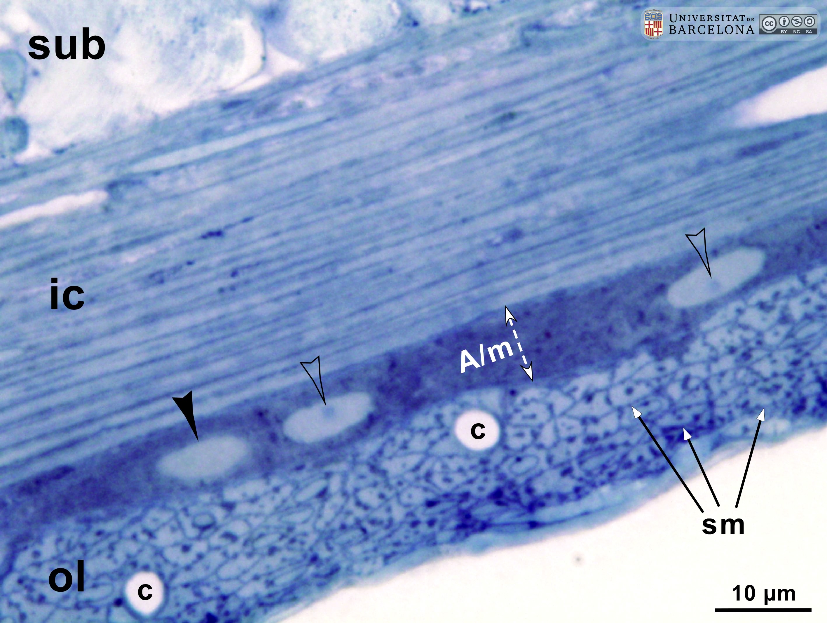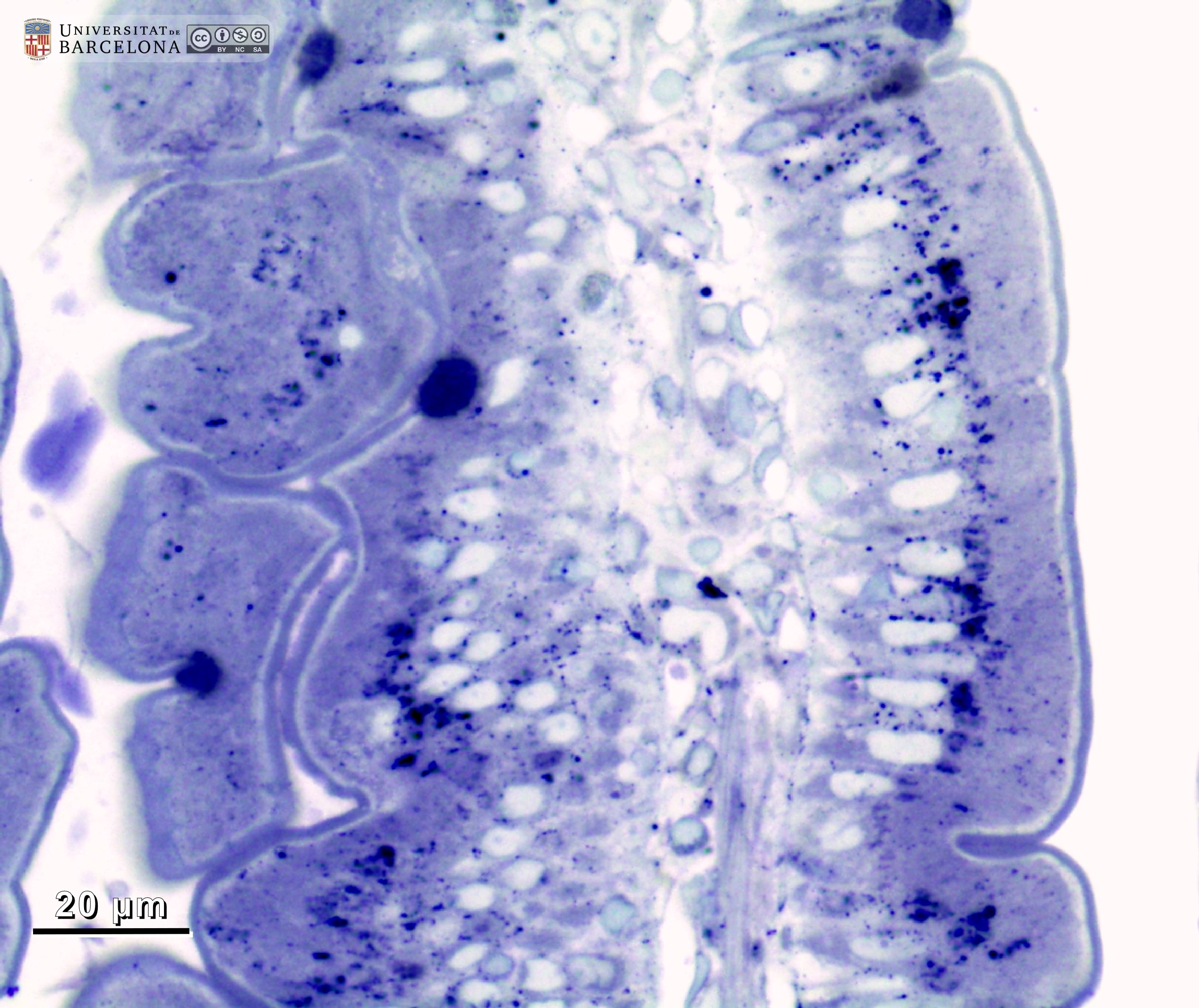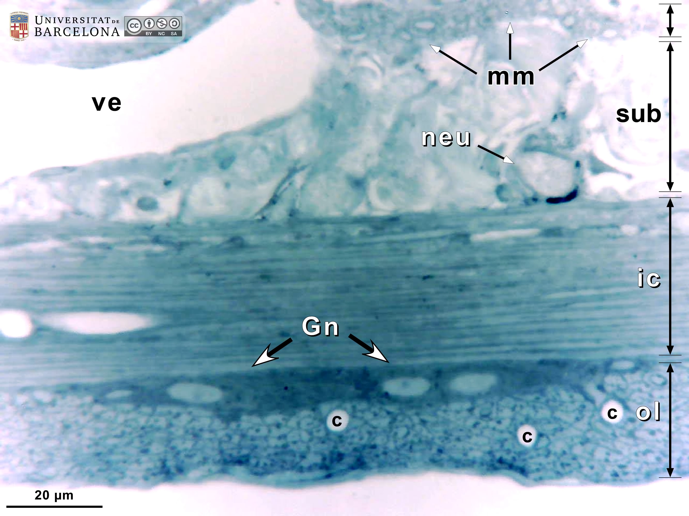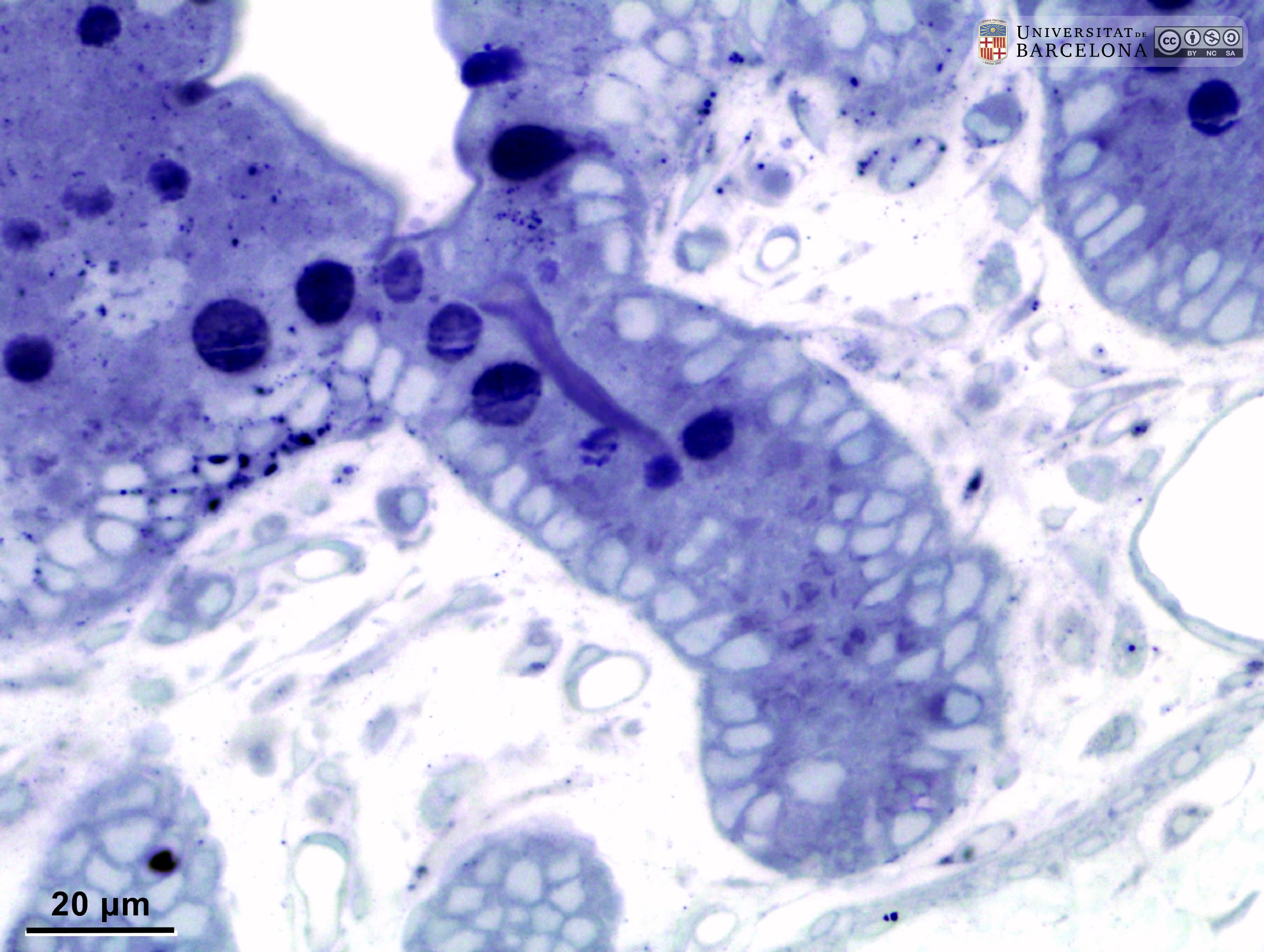 P_O_duodenum2_semithin2um_50X_47_mmucosae_LETTERS.jpg | Deep layers in the duodenal wall in a rat. The muscularis mucosæ (mm, arrows) is sharply delimited. In this layer, smooth muscle cells were sectioned transversally and are arranged in three or four layers of round profiles. Overlying the muscularis mucosa, a pale lamina propria (lp) and the bottom of three crypts (1, 2, 3) are observed. Beneath the muscularis mucosæ lies the submucosa (sub), a layer of connective tissue with thick collagen fibres (empty arrowheads) and various vessels: arterioles (ar) and veins (ve). The previously mentioned lamina propria is also a connective tissue with blood vessels (v) but it lacks the thick collagen fibres characteristic of the submucosa. Beneath the submucosa, the inner – circular – layer of smooth muscle (ic) is observed with cells cut longitudinally. Osmium tetraoxide postfixation, epoxy section 2 µm thick, toluidine blue stain. Go, mucous granules in goblet cells; N, nucleus in an epithelial cell in a crypt. | 883 kB | JPEG | ![]() View/Open |