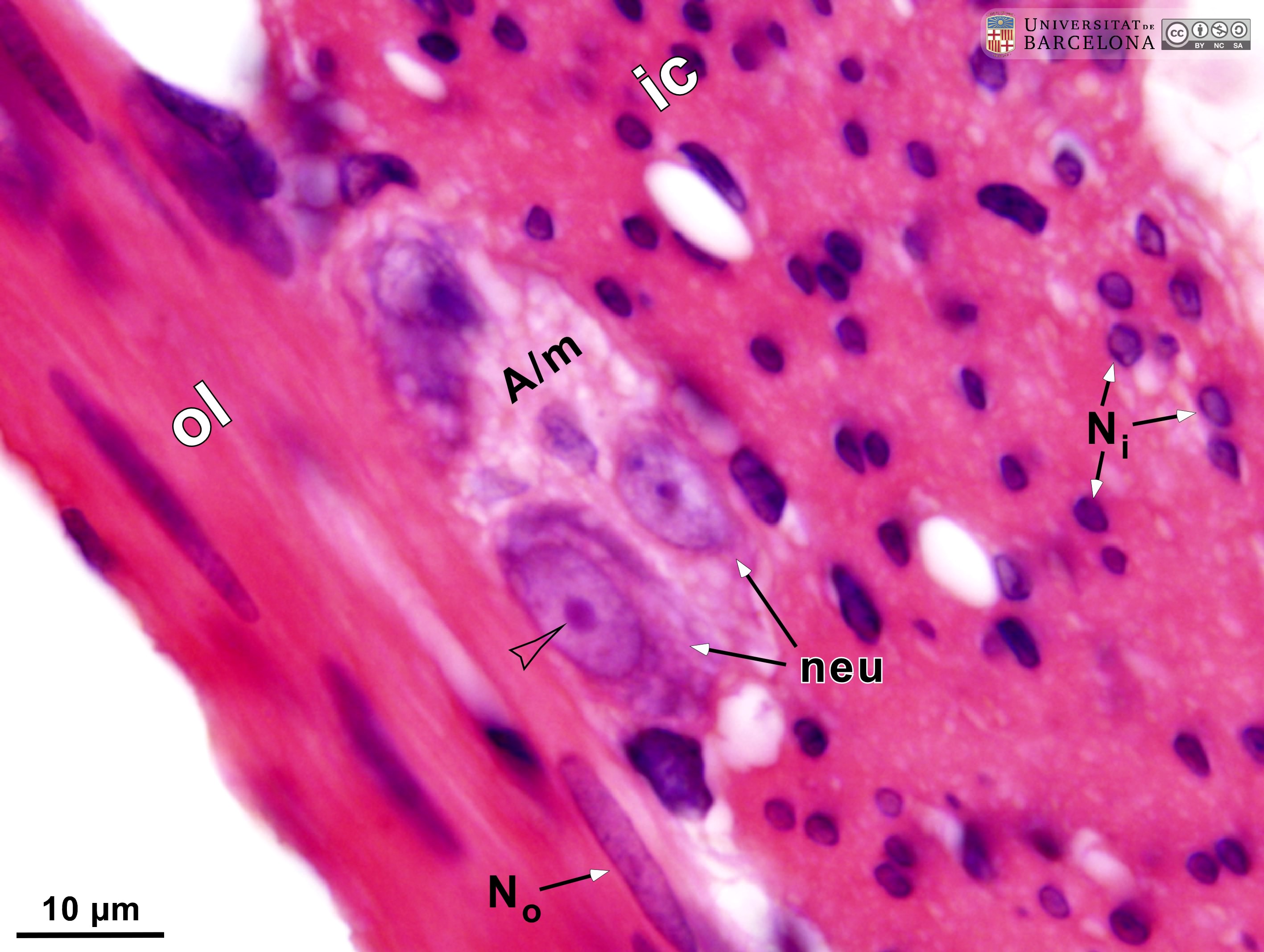 P_O_duodenum2_HEosin_100X_78_ganglion_LETTERS.jpg | Detail of a nerve ganglion in the small intestine in a rat. The two layers of the muscularis externa can be distinguished by the profiles of the sectioned nuclei of the smooth muscle cells. Nuclear sections in the inner/circular layer (ic) appear round (Nˬi) while those in the outer/longitudinal layer (ol) appear elongated (Nˬo), as they are sectioned along their longitudinal axis. Between these layers, a nerve ganglion of Auerbach's – myenteric – plexus (A/m) is located. Neurones are large (neu), with a lightly stained nucleus and a dark purple nucleolus. Paraffin section, hæmatoxylin-eosin stain. | 607.51 kB | JPEG | ![]() View/Open |