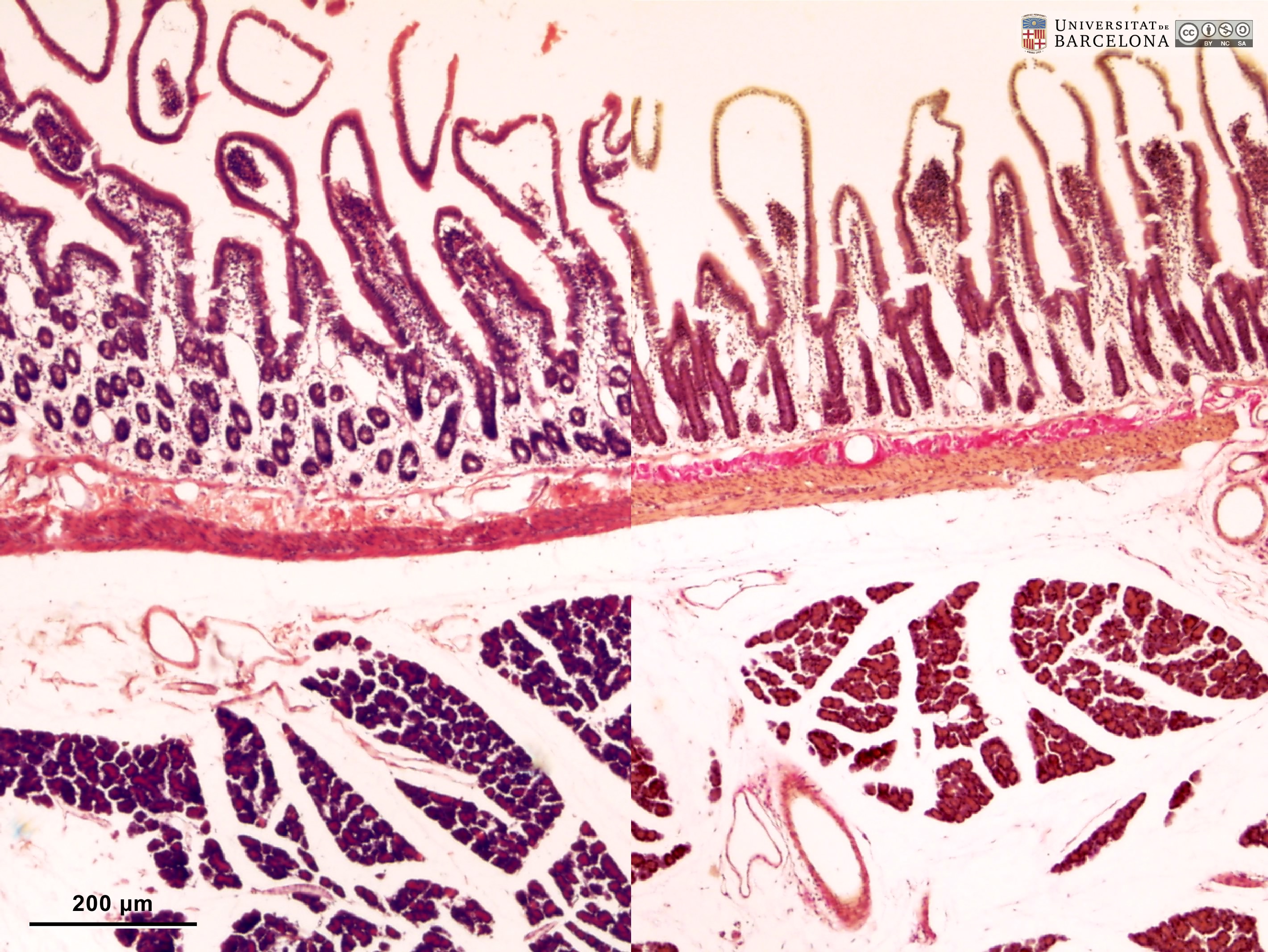 P_O_duodenum_4x_HEosin47_vGieson01_LETTERS.jpg | Rat duodenum and adjoining pancreas: comparison of hæmatoxylin-eosin stain (left) and van Gieson trichrome (right). Intestinal villi (black arrowheads) appear as finger-shaped projections. They are lined with a simple – single-layered – epithelium, which is darkly stained and extends into the mucosa, forming crypts. The core of the villi is occupied by the palely stained lamina propria (lp), which also extends between the crypts. The deeper border of the mucosa consists of a thin layer of smooth muscle cells termed the muscularis mucosæ (mm), which stains pink with eosin (left) and light brown with van Gieson trichrome (right). Beneath the muscularis mucosæ lies the submucosa (sub), a connective tissue layer rich in collagen fibres that stain pink with eosin (left) and bright fuchsia with van Gieson's acid fuchsin (right). The underlying muscularis externa (me) is a compact layer of muscle cells that stain dark pink with hæmatoxylin-eosin (left), and pale brown with van Gieson trichrome, which allows a clear distinction between the muscular layers and the submucosa. The duodenal wall is linked to the pancreatic acini by the mesenterium and its blood vessels: arteries (ar) and veins (ve). Paraffin section. | 1.3 MB | JPEG | ![]() View/Open |