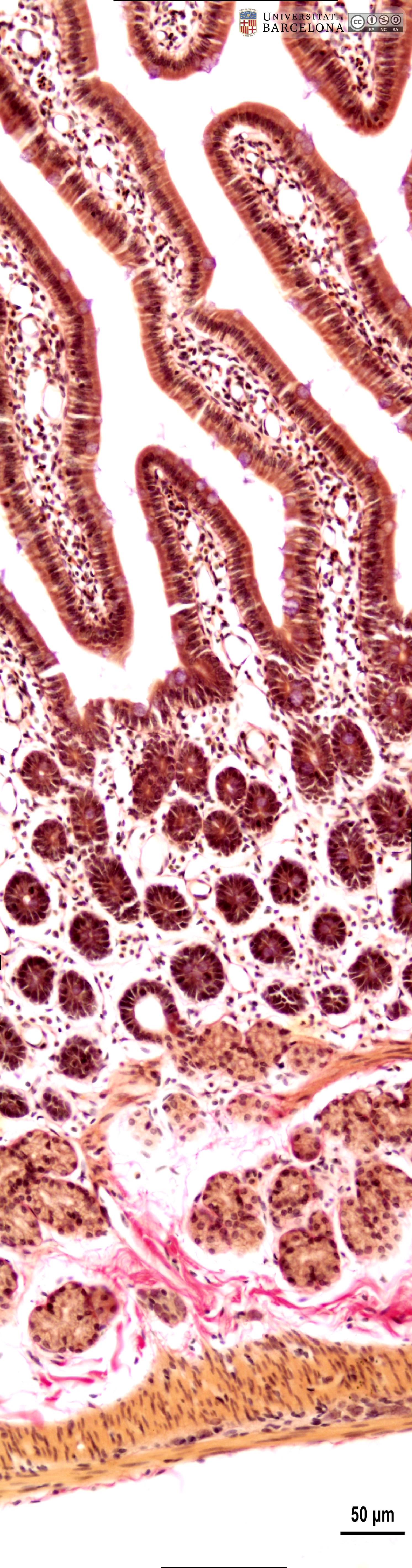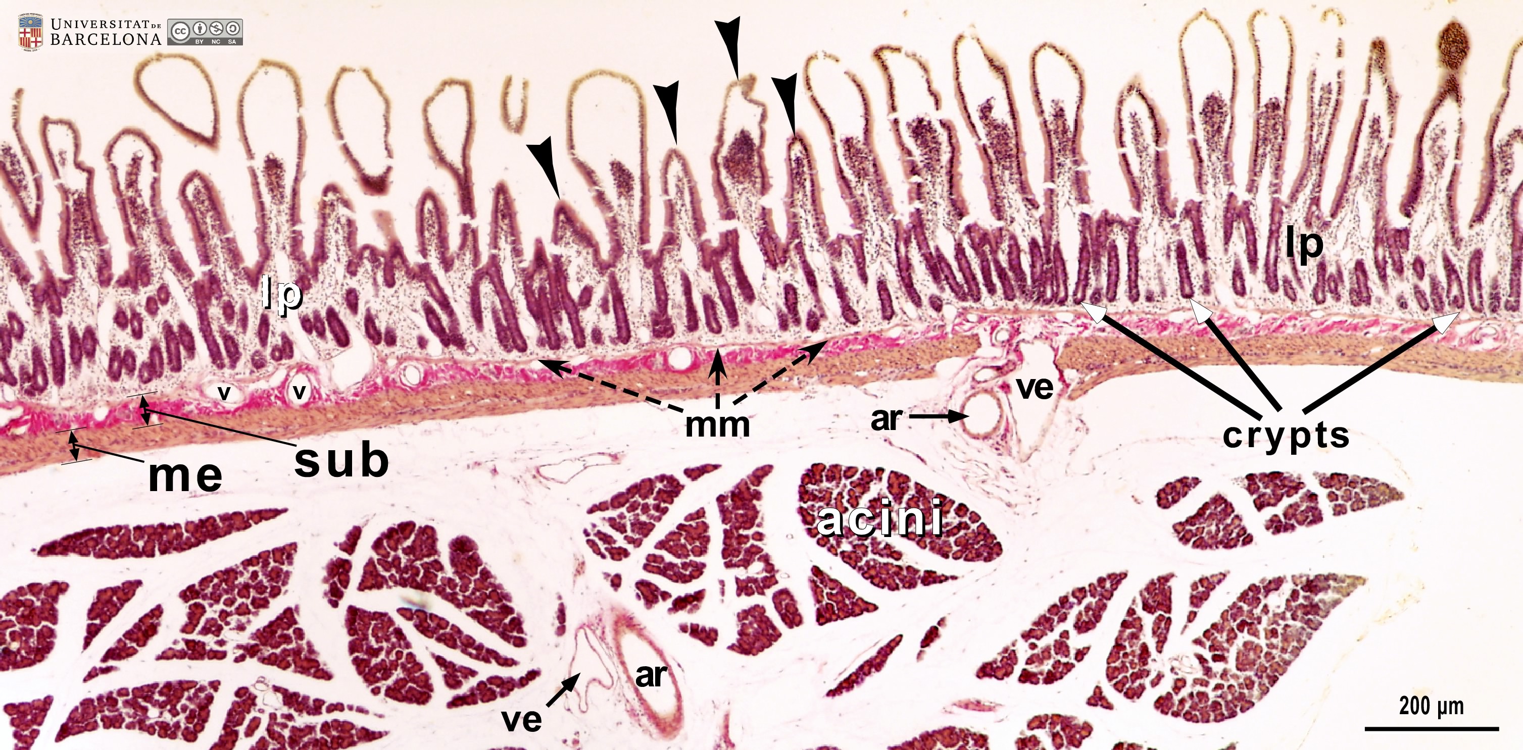 P_O_duodenum_vanGieson_4x_01_02_collage_LETTERS.jpg | Longitudinal section of the duodenum and the adjoining pancreas in a rat (collage of micrographs allowing moderate zoom). Mucosa forms finger-like projections termed villi (black arrowheads). They are lined with a darkly stained simple epithelium that also invaginates into the mucosa, forming crypts. In the core of the villi and surrounding the crypts lies a loose connective tissue that stains palely: the lamina propria (lp). A thin muscularis mucosæ (mm) defines the deepest border of the intestinal mucosa. Beneath it, the submucosa (sub) stands out for its numerous collagen fibres, which stain bright fuchsia, and its blood vessels (v). Beneath the submucosa lies the muscularis externa (me), which is divided into two sublayers – inner and outer – although not distinguishable at this magnification. On the right, branches of the pancreaticoduodenal arteries (ar) and veins (ve) can be seen crossing the muscularis externa to branch into the submucosa. Next to this portion of the duodenum, pancreatic acini are grouped in numerous lobules separated by loose connective tissue that appears virtually unstained. Paraffin section, van Gieson trichrome. | 1.06 MB | JPEG | ![]() View/Open |