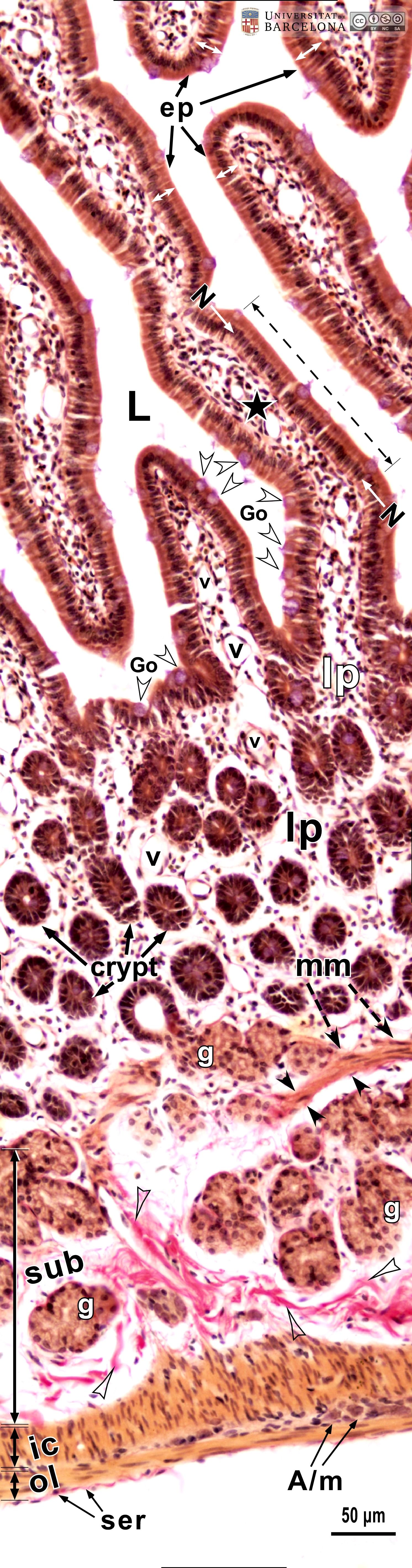 P_O_duodenum2_vGieson_20X_80_83_collage_LETTERS.jpg | Layers in the duodenal wall in a rat (collage of micrographs allowing detailed zoom). Villi are lined with a simple columnar epithelium (ep): a single-layered epithelium of tall cells (white bidirectional arrows) with a light brown cytoplasm. In the villus at the centre (black star), it is evident that the dark oval cell nuclei (N) are aligned in a single row at the base of the cells. Interspersed between the absorptive cells – stained brown – lie the goblet cells, which contain a round mass of mucous secretory granules that stain light violet or lilac (Go, white arrowheads). The core of the villi consists of a loose connective tissue – the lamina propria (lp) – with a light matrix, blood vessels (v), and scattered cells. In deep portions of the mucosa, crypts are observed: they are folds of the surface epithelium, although here they were cut obliquely and the continuity with the surface is not observed. The deepest part of the mucosa is the muscularis mucosæ (mm): a thin layer of smooth muscle cells with dark elongated nuclei and light brown cytoplasm. The submucosa (sub) lies just beneath the muscularis mucosae. It contains thick collagen fibres (empty arrowheads), which stain dark fuchsia with van Gieson trichrome. In this micrograph, the submucosa contains islets of Brunner's glands (g), which cover most of the submucosa and, in some regions, interrupt the muscularis mucosæ and extend into the lamina propria. Underlying the submucosa, the two layers of the muscularis externa are observed: the inner or circular layer (ic) of smooth muscle cells and the outer or longitudinal layer (ol). A nerve ganglion of the myenteric – Auerbach's – plexus (A/m) appears to be located between these two layers (to the right), but is difficult to identify at this magnification. Paraffin section, van Gieson trichrome. | 1.72 MB | JPEG | ![]() View/Open |