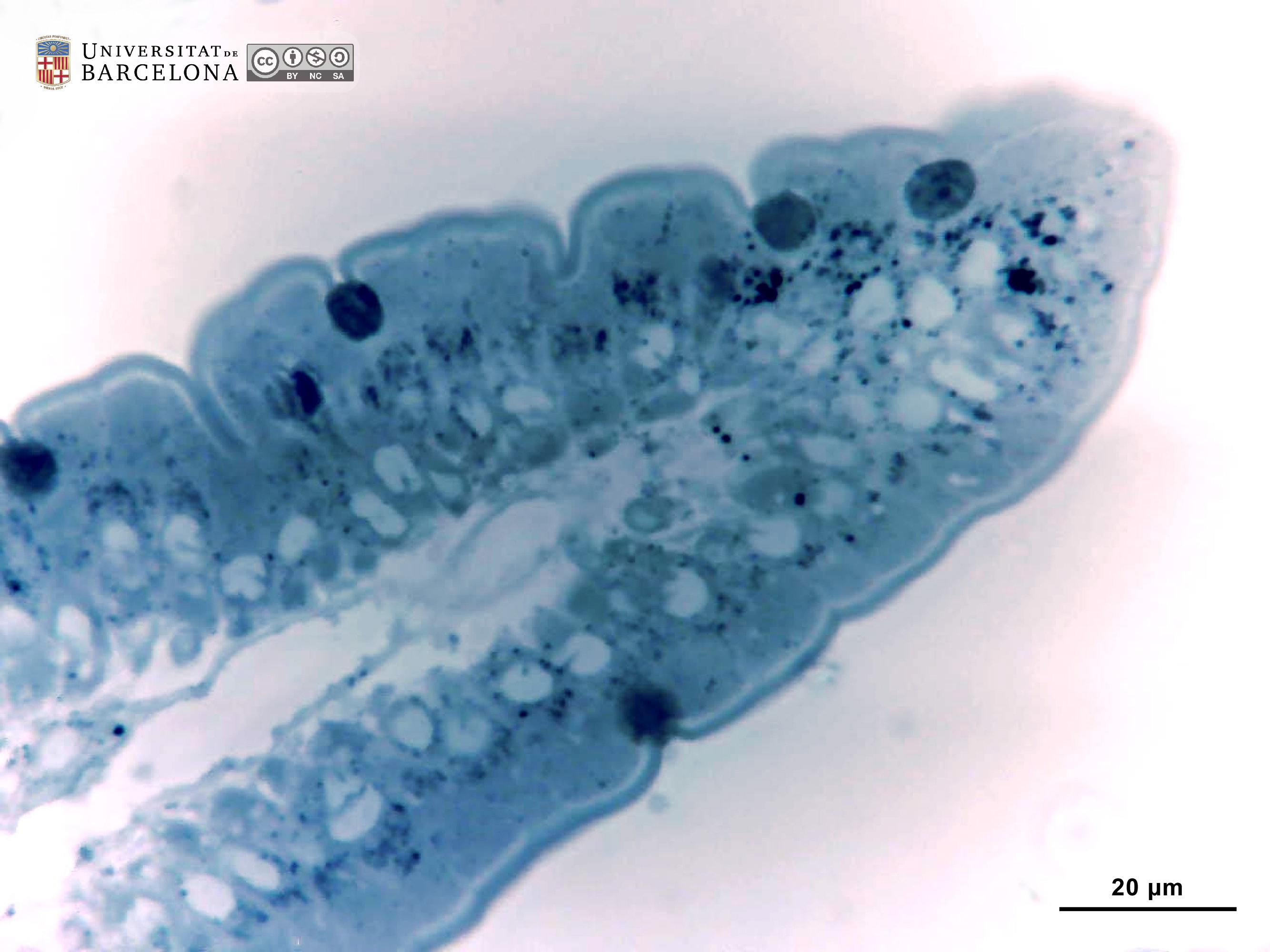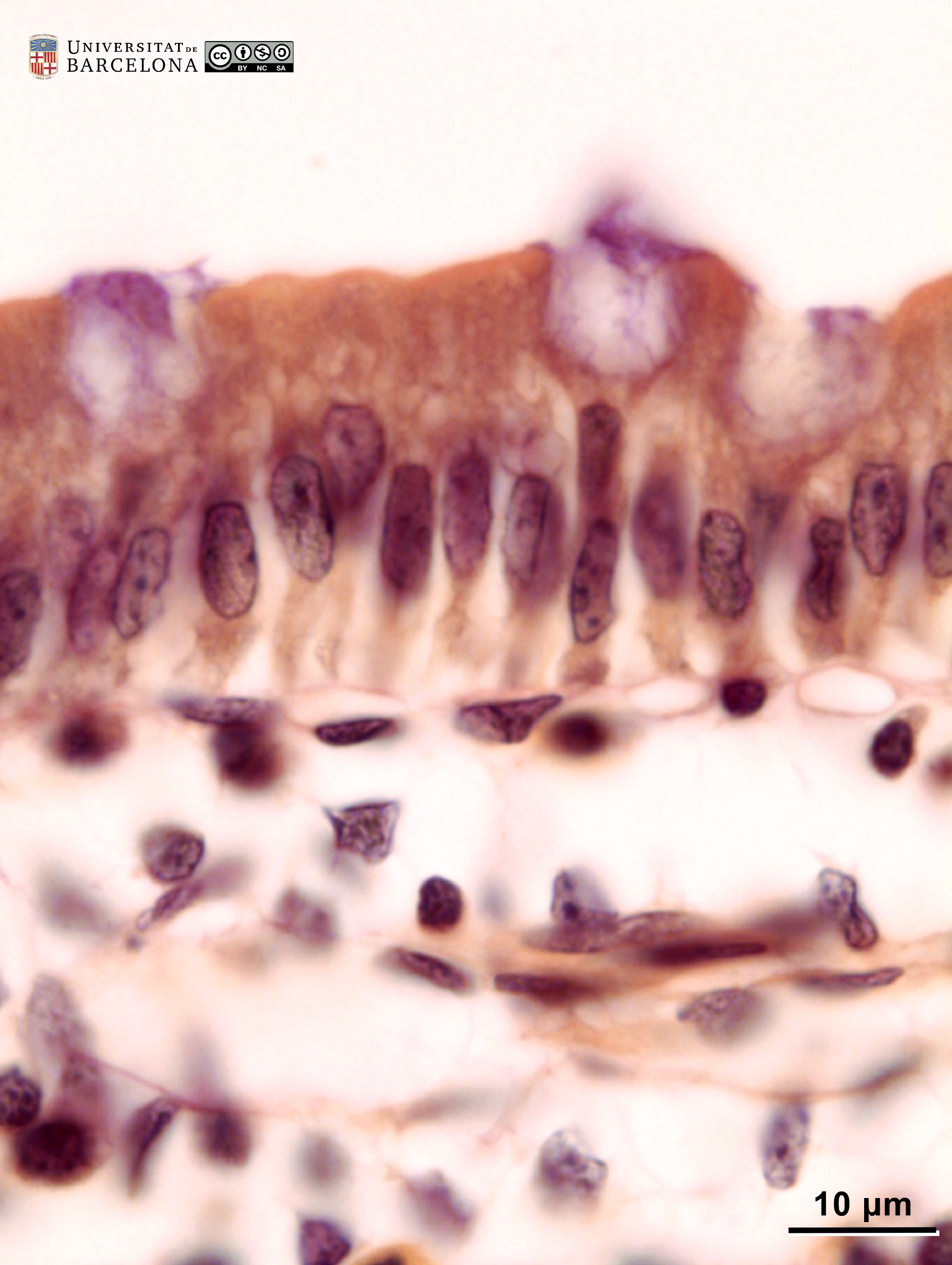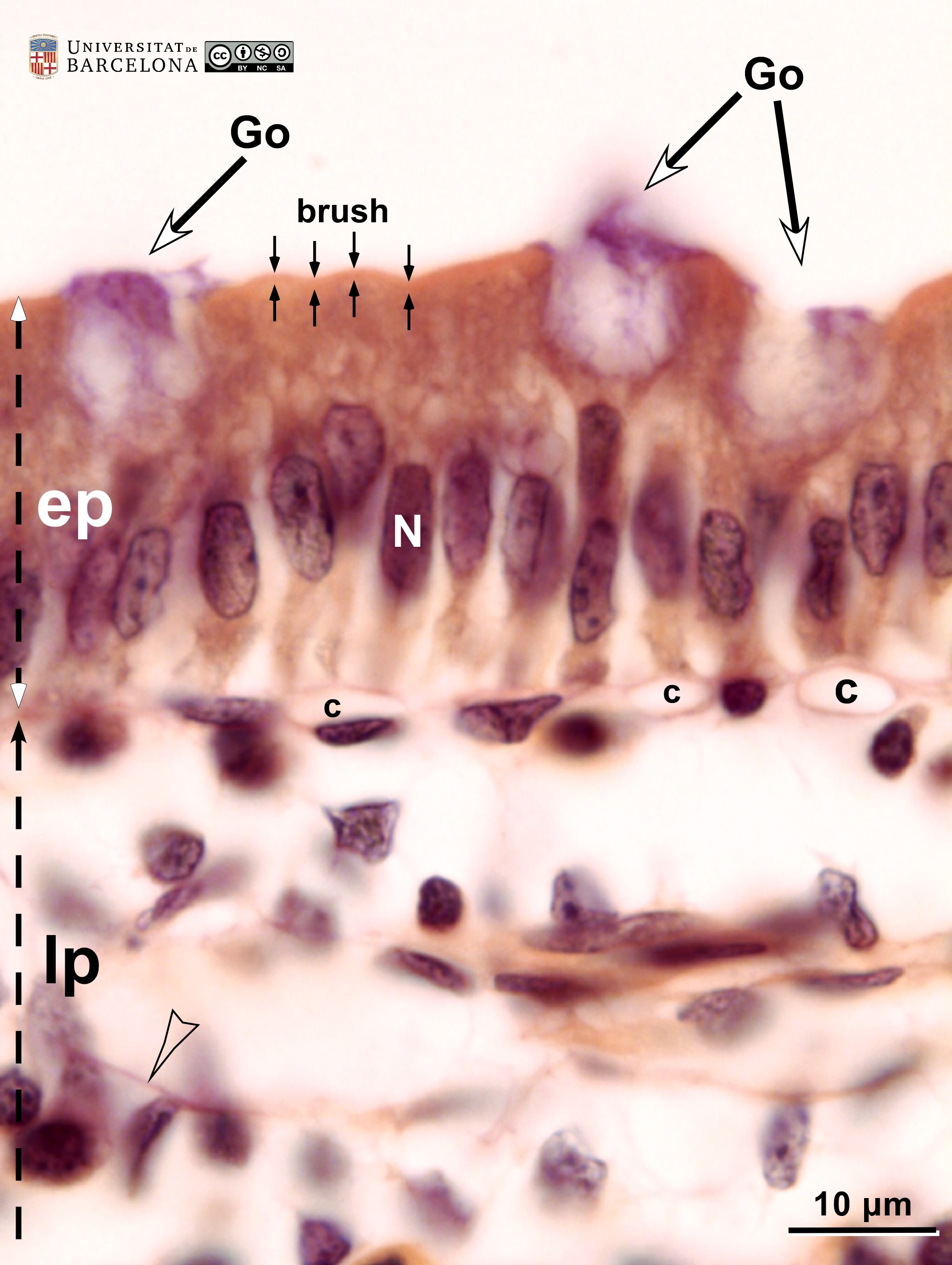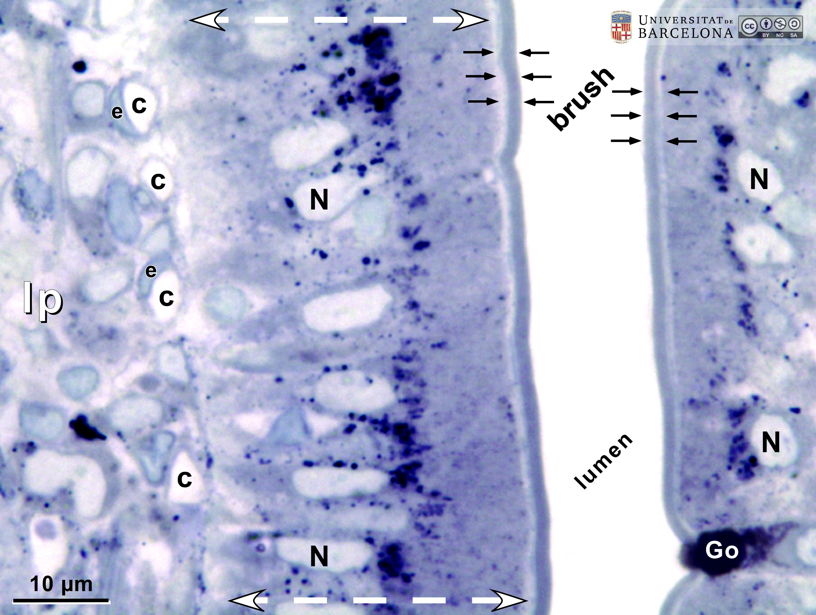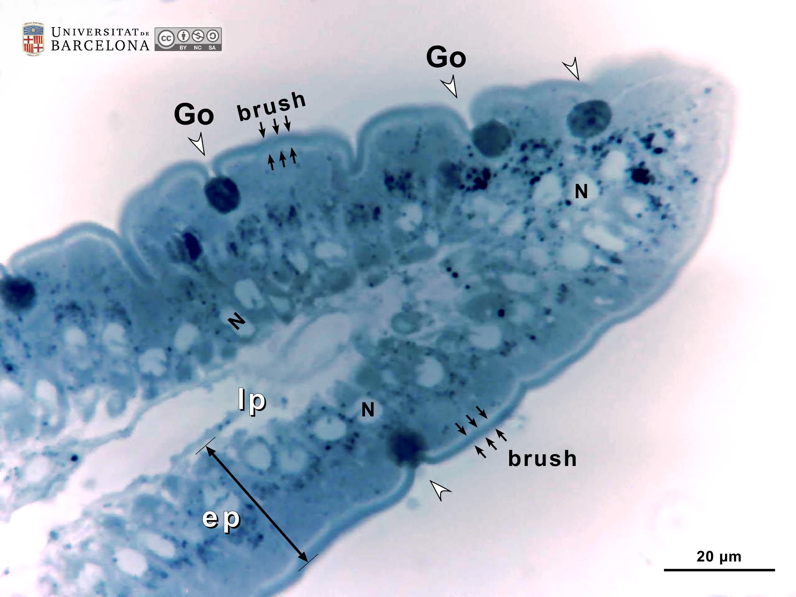 P_duodenum_semithin_2um_40x_13_LETTERS.jpg | Tip of a villus in the rat duodenum. The epithelium consists of a single layer of tall cells (ep, bidirectional arrows ↔). The cell nucleus is lightly stained and located at the base of the cell, while the cytoplasm is darker. At the apical surface of the epithelial cells, the brush border is clearly observed: it corresponds to the thousands of microvilli seen in electron microscopy. Dark accumulations of mucous granules are observed in the apical part of goblet cells (Go, white arrowheads). Beneath the epithelium, a light lamina propria (lp) is observed. Osmium tetraoxide postfixation, epoxy section 2 µm thick, toluidine blue stain. | 430.94 kB | JPEG | ![]() View/Open |