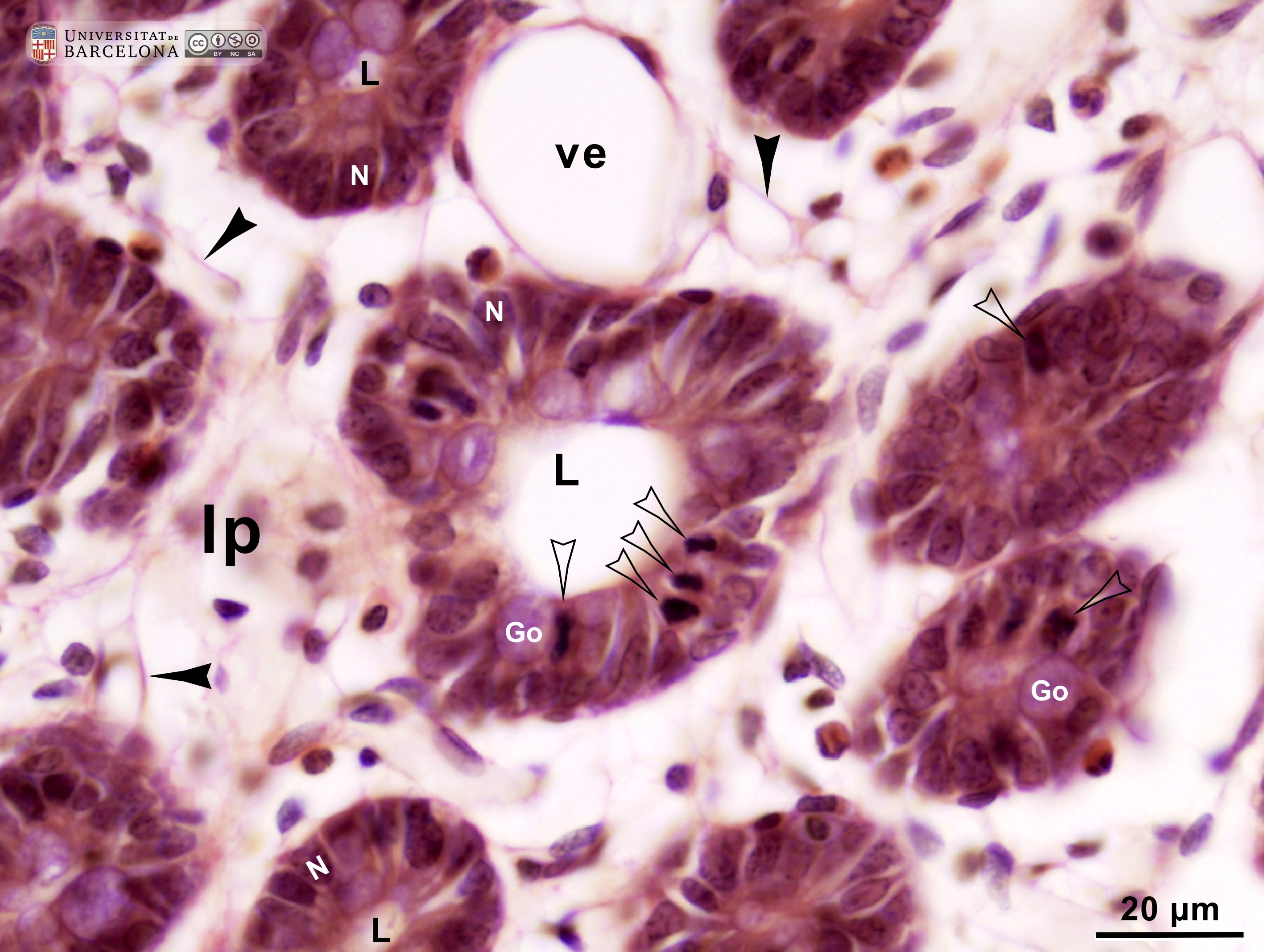 P_O_duodenum2_vGieson_50X_89_crypt_LETTERS.jpg | Crypts in deep portions of the intestinal mucosa in a rat. The epithelium forms pits into the mucosa – the crypts – with the intestinal lumen at the centre (L) and the single-layered epithelium around it, with dark oval cell nuclei (N). Mucus accumulations in goblet cells are stained light violet (Go). Proliferative cells in various crypts are undergoing mitosis and display condensed chromosomes (empty arrowheads). The lamina propria (lp) fills the space between the crypts and contains scattered cells, a matrix with delicate collagen fibres stained light pink (black arrowheads), and blood vessels. Paraffin section, van Gieson trichrome. ve, vein. | 697.95 kB | JPEG | ![]() View/Open |