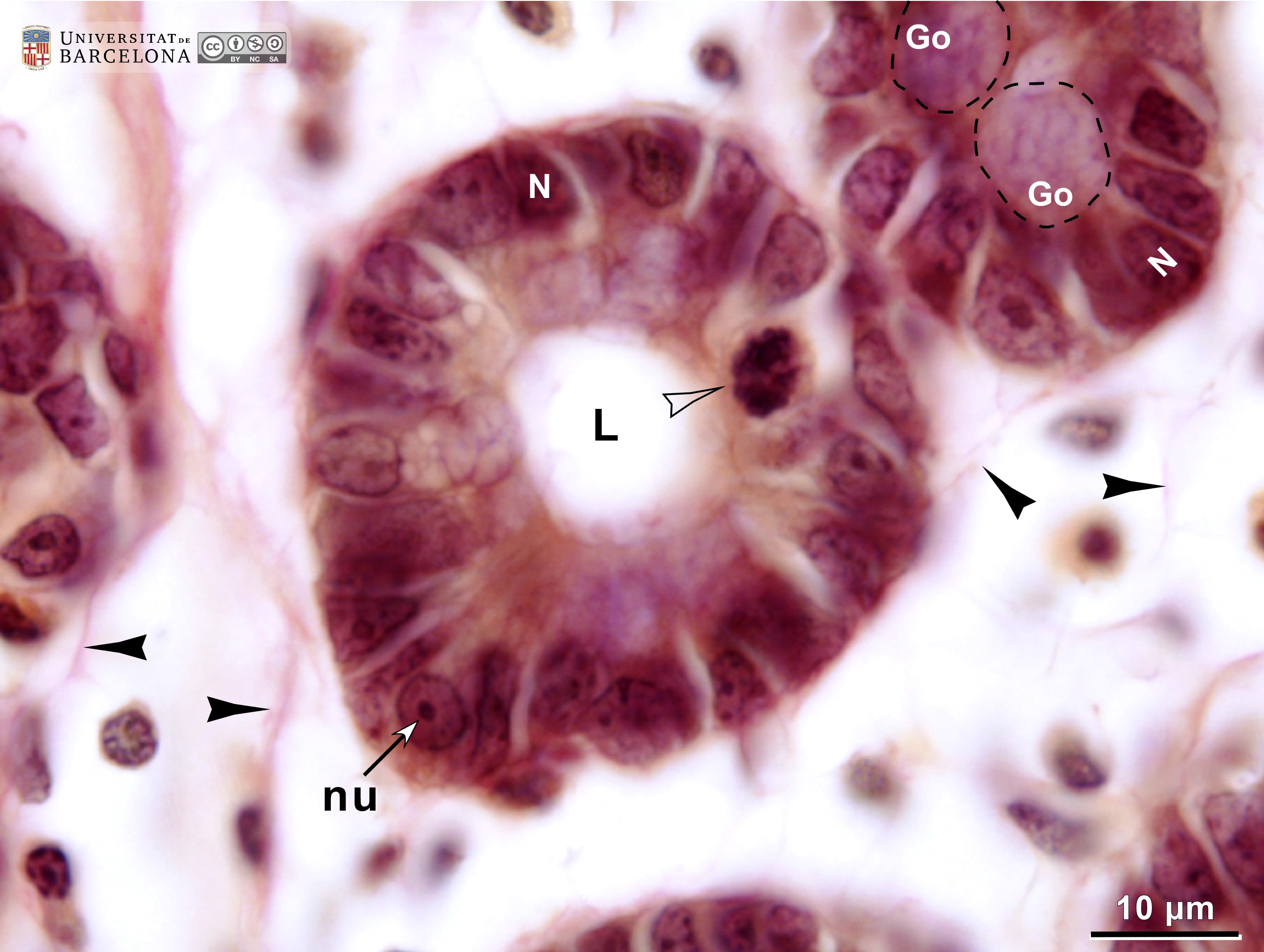 P_O_duodenum2_vGieson_100X_95_crypt_LETTERS.jpg | Crypts in the intestinal mucosa in a rat. The epithelium in the crypts consists of a single layer of tall – columnar – cells. The nucleus (N) is located at the base (periphery of the crypt) and contains dark chromatin granules and a nucleolus (nu). A cell in mitosis (empty arrowhead) – probably in anaphase – is present and exhibits condensed chromosomes. Round accumulations of mucous secretory granules in goblet cells are observed (Go, dashed circles; lilac tint), and the individual granules are faintly delineated. In the lamina propria enveloping the crypts, delicate collagen fibres can be seen stained light pink (black arrowheads). Paraffin section, van Gieson trichrome. | 550.73 kB | JPEG | ![]() View/Open |