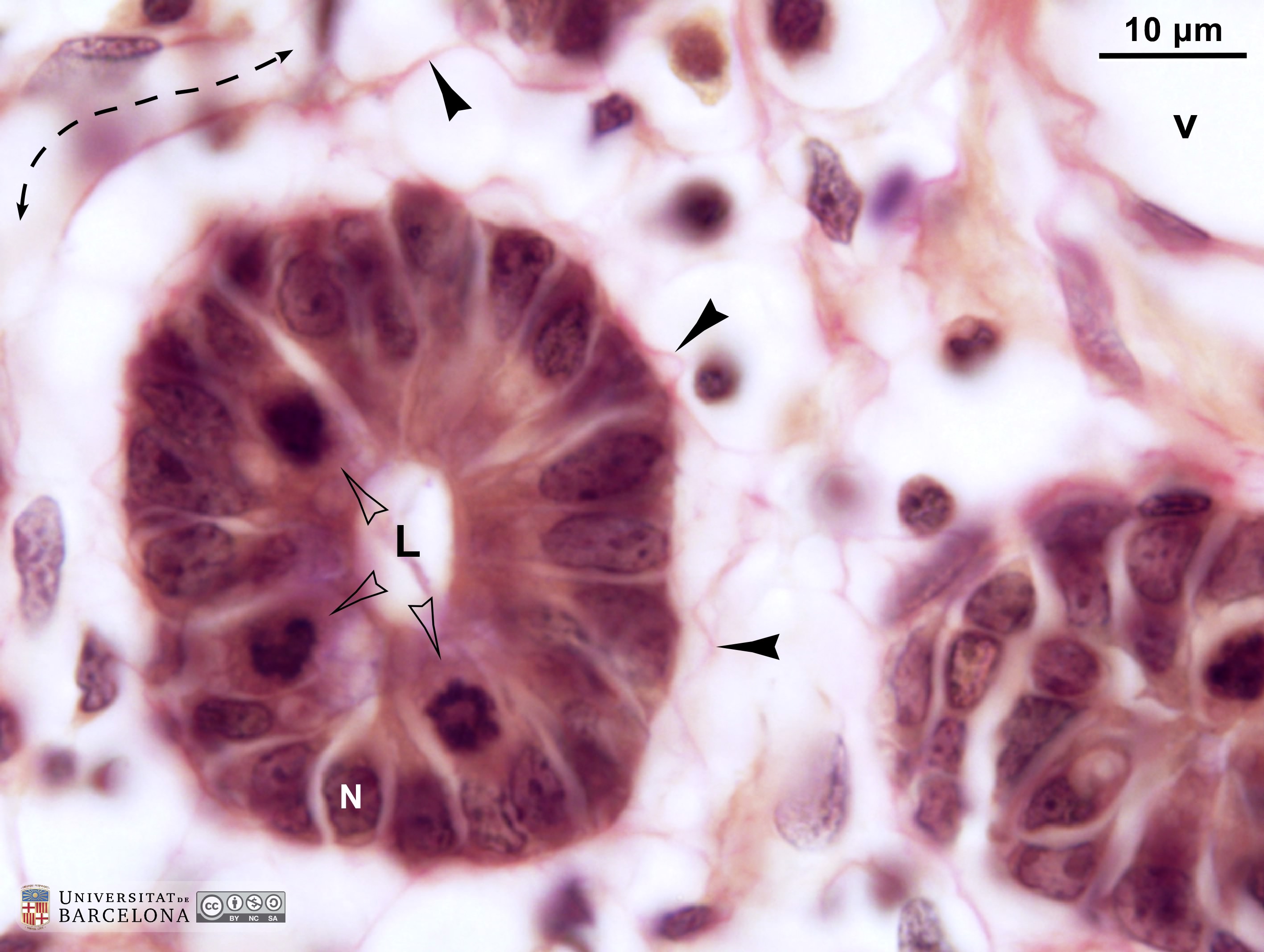 P_O_duodenum2_vGieson_100X_96_crypt_LETTERS.jpg | Crypts in the intestinal mucosa in a rat: mitotic cells. A narrow lumen is seen in the centre of the crypt, surrounded by a simple columnar epithelium with cell nuclei (N) located in basal portions of the cells (in the periphery of the crypt). In many nuclei, dark and small chromatin clumps are observed, including a nucleolus. Cells undergoing mitosis show condensed chromosomes (empty arrowheads). Crypts are enveloped by the lamina propria, which contains thin collagen fibres stained light pink (black arrowheads), scattered cells, capillaries (bidirectional dashed segment), and larger blood vessels (v). Paraffin section, van Gieson trichrome. | 536.93 kB | JPEG | ![]() View/Open |