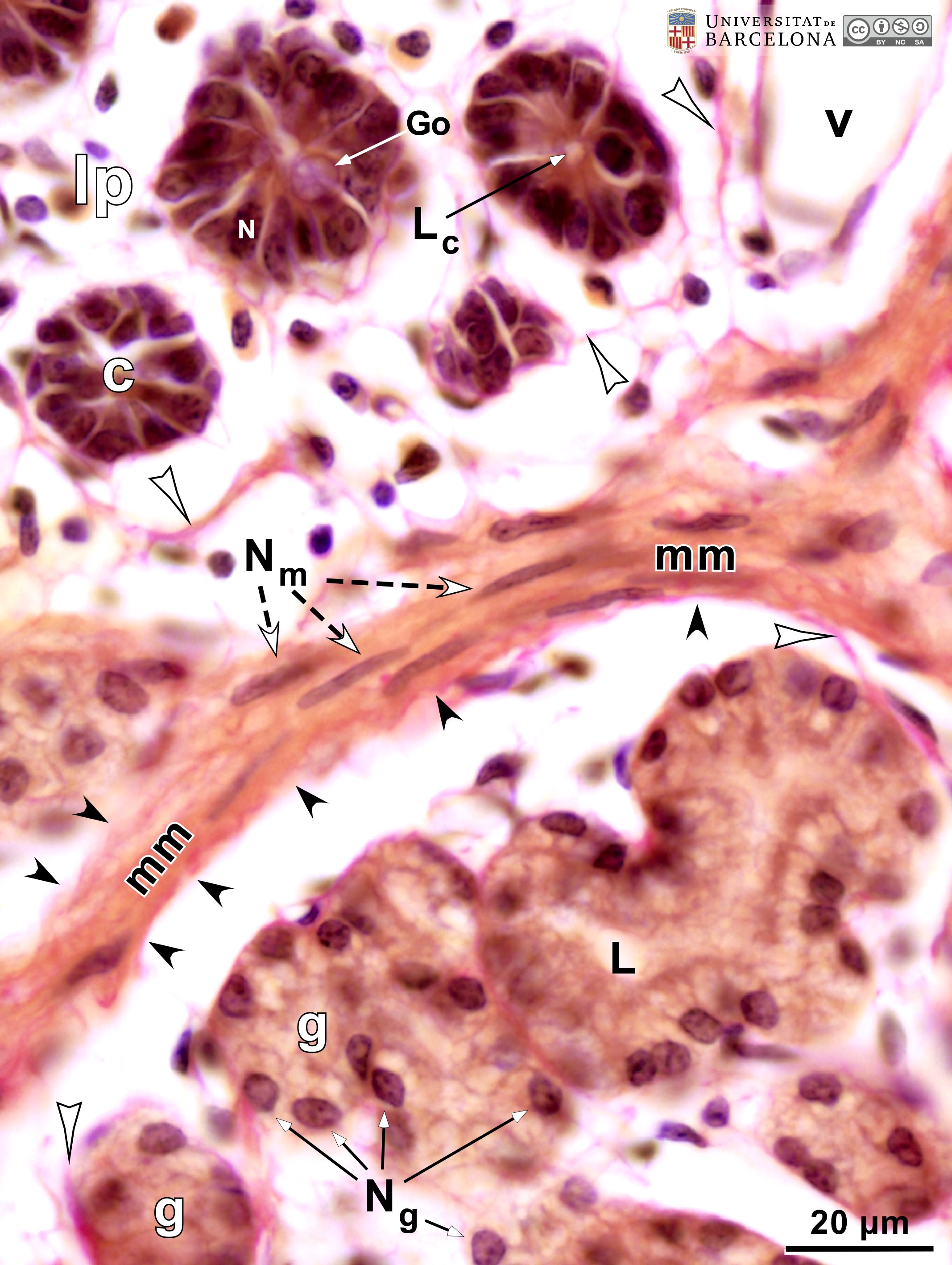 P_O_duodenum2_vGieson_50X_98_muscularis_mucosae_LETTERS.jpg | Muscularis mucosæ (mm) in the rat duodenum. The smooth muscle cells were cut longitudinally, and the nuclei (Nˬm) appear elongated and moderately stained. In the overlying lamina propria (lp), thin collagen fibres are stained pink (empty arrowheads). Three crypts (c) appear transversely cut: epithelial cells are stained dark brown, except for the mucous mass of goblet cells (Go), which stains lilac. A small lumen (Lˬc) is seen in the centre of each crypt. Beneath the muscularis mucosa lies the submucosa, which contains islets of Brunner's glands (g) in this section. Their cells have a moderately dark nucleus (Nˬg) and a light brown cytoplasm, with some unevenness suggestive of secretory granules. Collagen fibres stained pink surround the islets (empty arrowheads). Paraffin section, van Gieson trichrome. L, lumen of Brunner's glands; N, nucleus of an epithelial cell; v, blood vessel. | 738.38 kB | JPEG | ![]() View/Open |