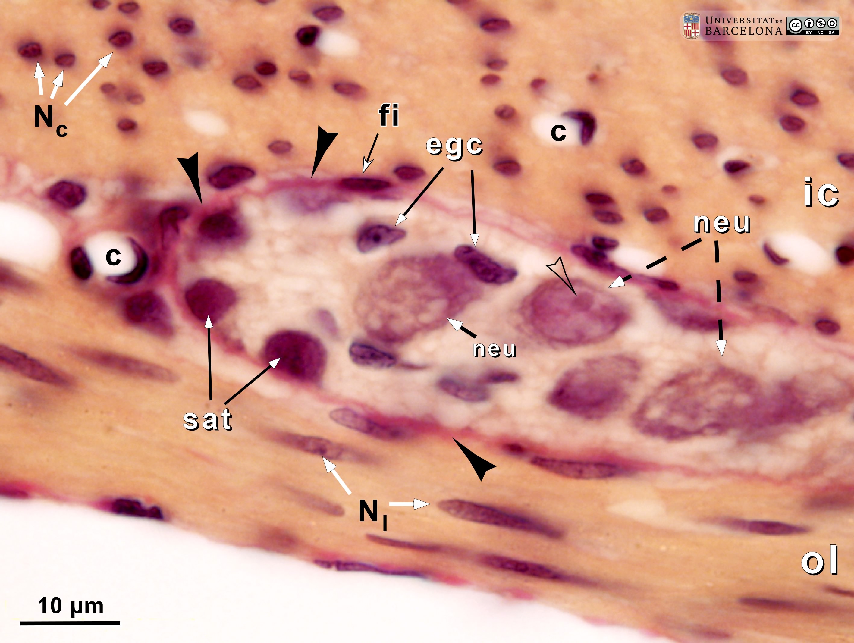 P_O_duodenum_vanGieson_neurones_100x_34_LETTERS.jpg | Ganglion of the myenteric plexus in the small intestine in a rat. The ganglion is located between the inner/circular (ic) and outer/longitudinal (ol) muscular layers. It is surrounded by a thin envelope of fibroblasts (fi) and collagen fibres (black arrowheads), which stain pink. Within the ganglion, large neurones (neu) can be seen with a large nucleus and a prominent nucleolus (empty arrowhead). Smaller cells with darker nuclei are likely to be enteric glial cells (egc). Large round satellite cells (sat) are seen at the periphery. Paraffin section, van Gieson trichrome. c, capillary; Nˬc, nuclei of muscle cells in the inner muscular layer; Nˬl, nuclei of muscle cells in the outer muscular layer. | 635.74 kB | JPEG | ![]() View/Open |