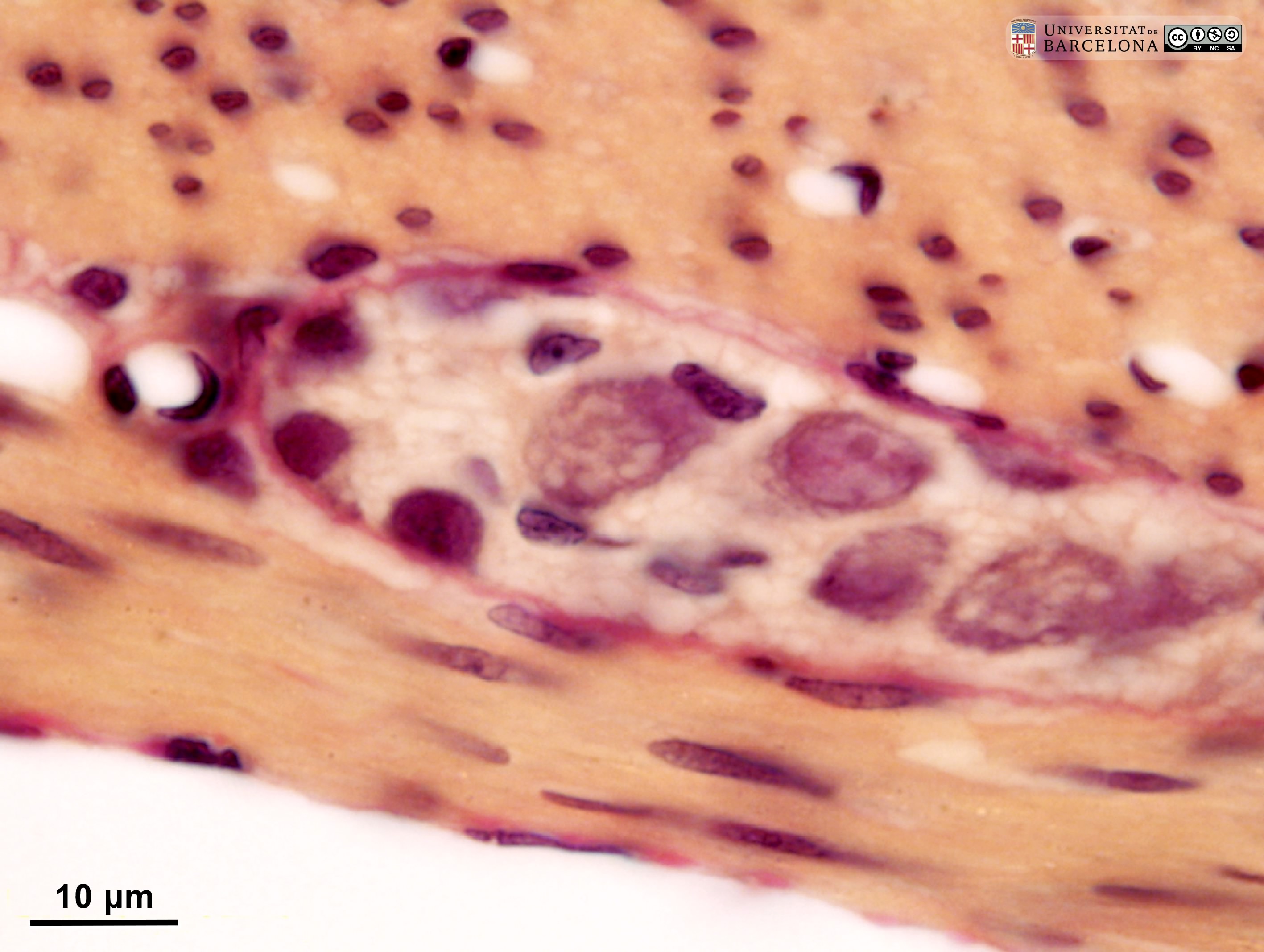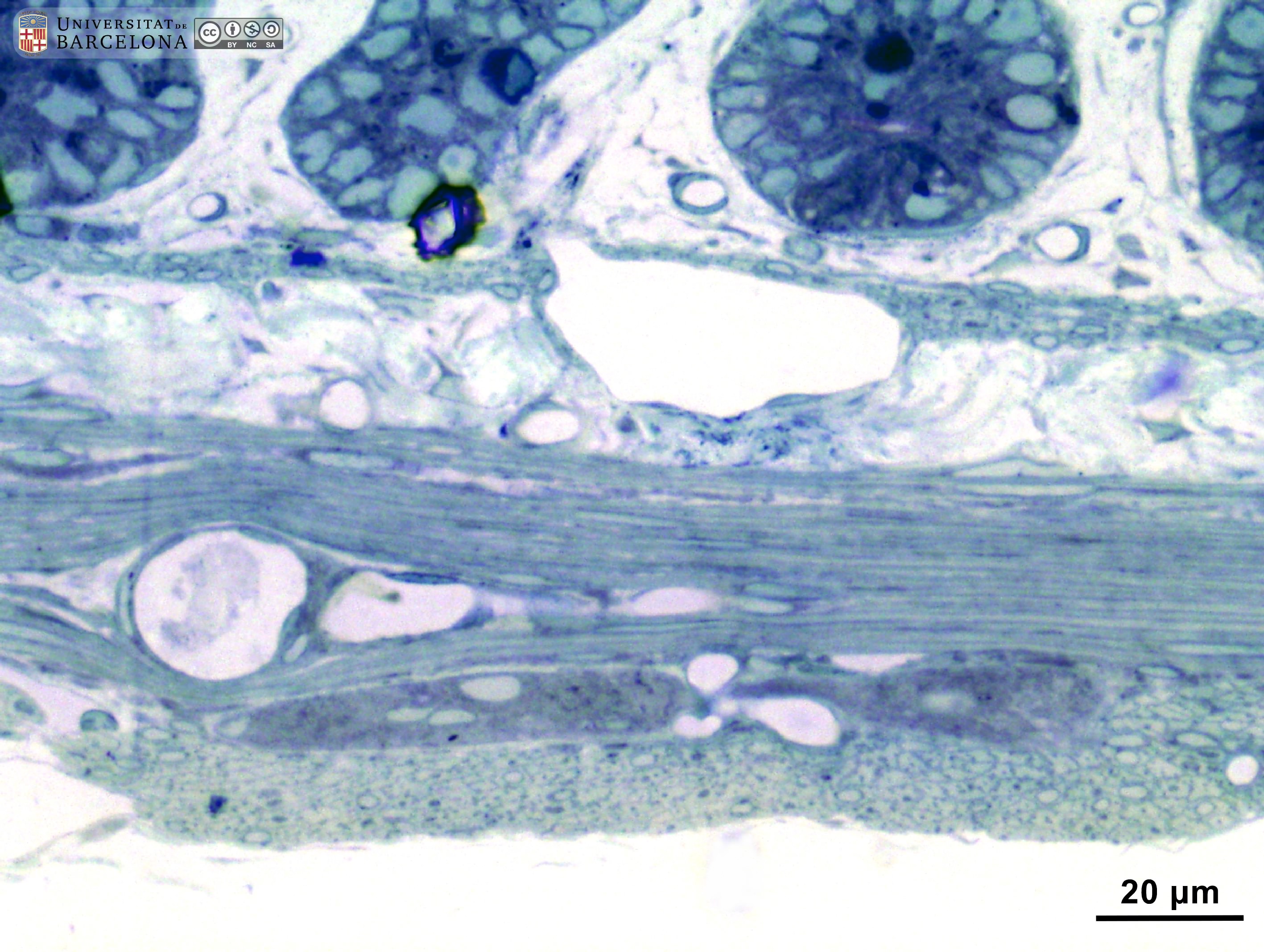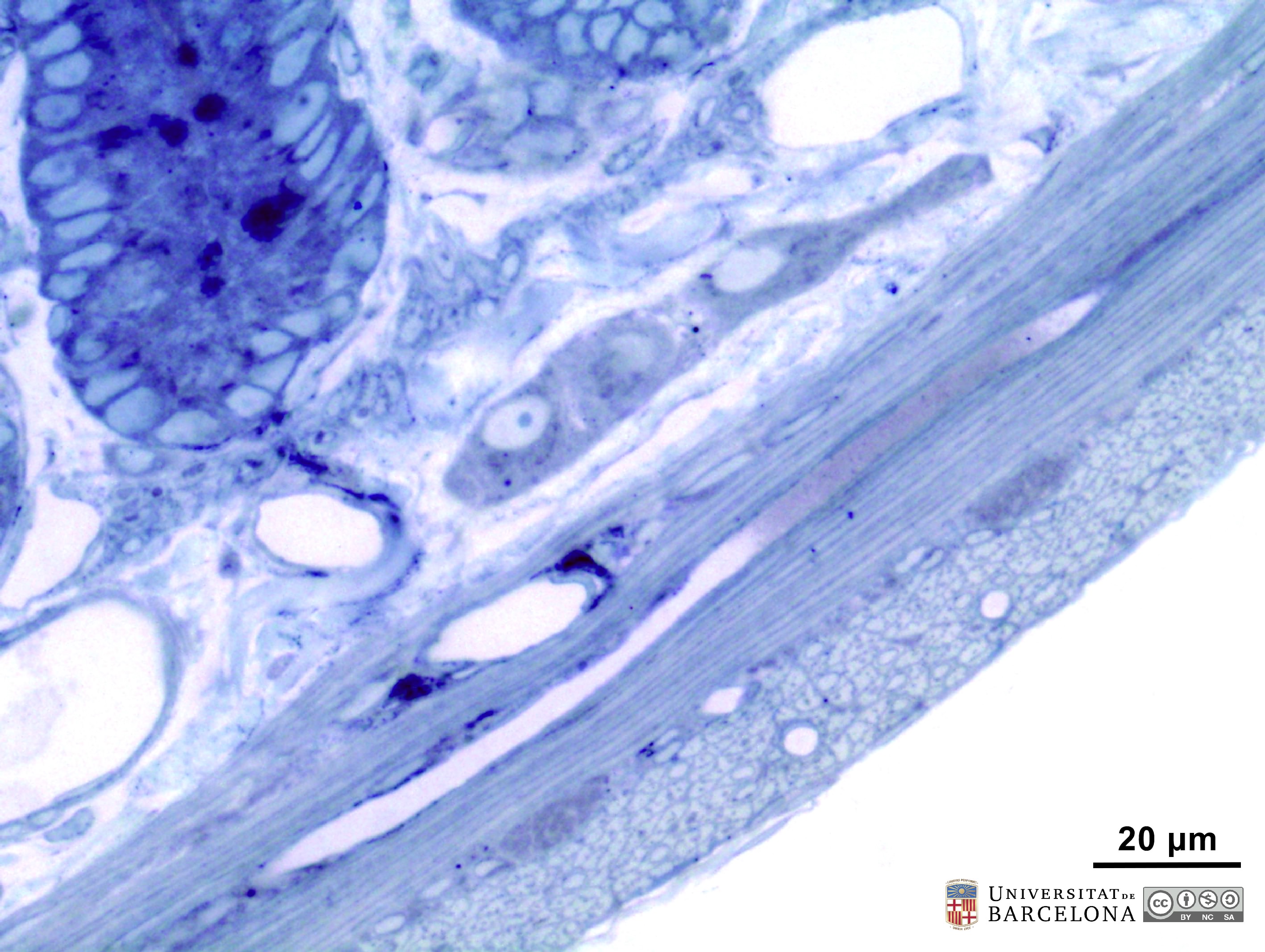 P_O_duodenum2_semithin2um_50X_16_Meissner_LETTERS.jpg | Meissner ganglion in the duodenal submucosa in a rat. The submucosa (sub) appears as a thin layer with numerous blood vessels (v). Here, a nerve ganglion of the submucosal – Meissner's – plexus (M/s) is observed. It contains three large neurones, the one on the left displaying a large nucleus and a distinct nucleolus, typical of neurones. The submucosa is limited internally by the muscularis mucosæ (mm) and externally by the muscularis externa that comprises an inner – circular – layer (ic) and an outer – longitudinal – layer (ol). Between them, elements of the myenteric – Auerbach's – plexus (A/m) can be observed. Osmium tetraoxide postfixation, epoxy section 2 µm thick, toluidine blue stain. c, capillary; Go, mucous granules in goblet cells; N, nucleus in an epithelial cell in a crypt. | 881.14 kB | JPEG | ![]() View/Open |