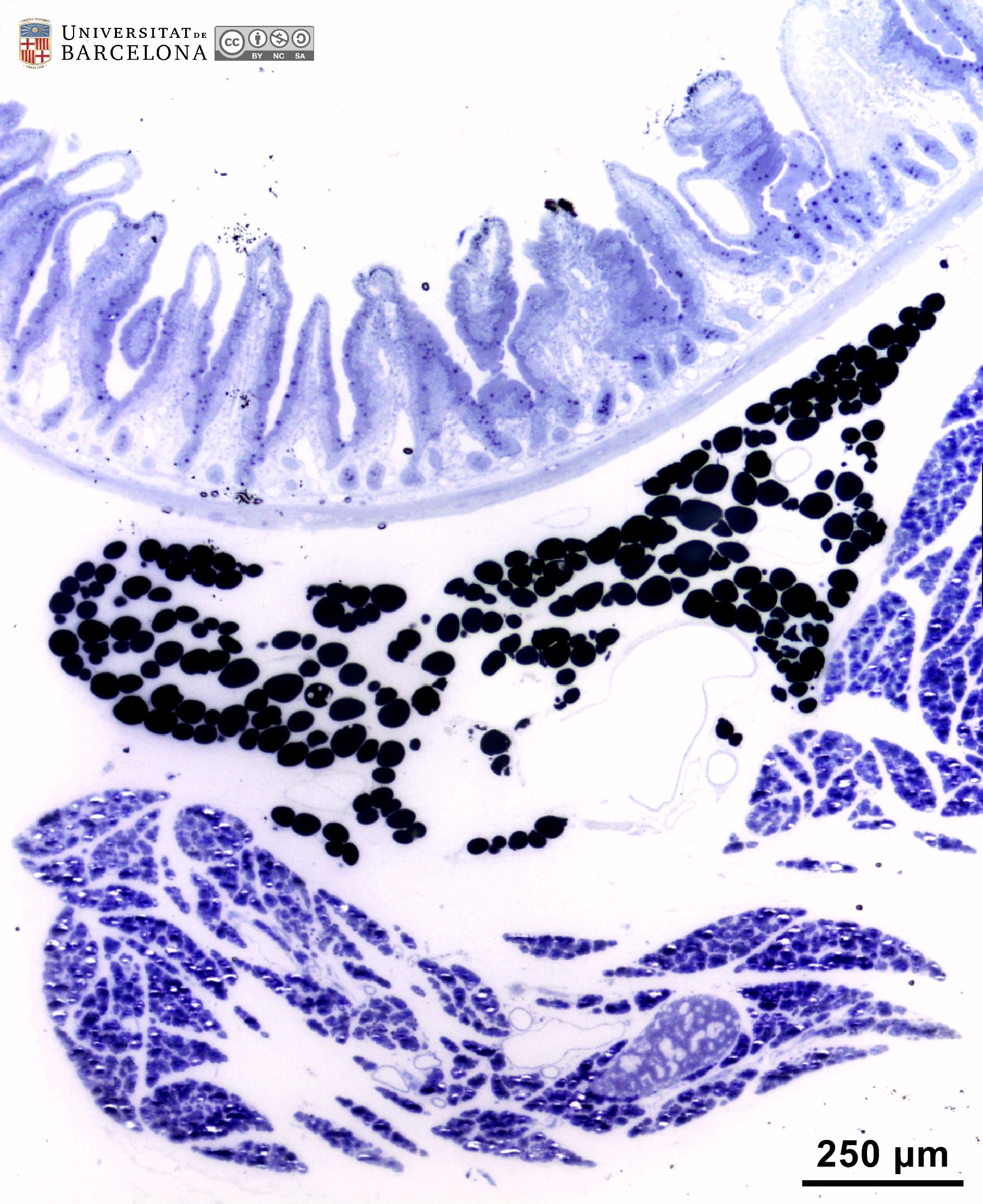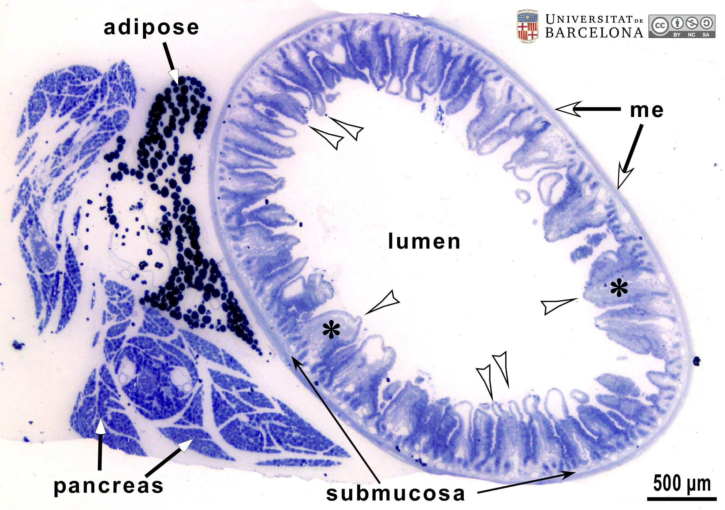 P_O_duodenum2_semithin2um_2x_06_07_collageC_LETTERS.jpg | General view of the duodenum and pancreas in a rat in a semi-thin section. The duodenum presents a mucosa that forms finger-like protrusions – the villi (empty arrowheads) –. These are lined by a single-layered epithelium and contain a loose connective tissue – the lamina propria (asterisks) –. The palely stained narrow layer beneath the mucosa is the submucosa, and the greyish external layer is the muscularis externa (me). In the mesenterium attached to the duodenum, masses of adipose tissue appear black due to osmium tetraoxide. Pancreatic lobules can also be observed. In rats, these are diffusely distributed along the duodenum and do not form a compact organ. Osmium tetraoxide postfixation, epoxy section 2 µm thick, toluidine blue stain. | 672.62 kB | JPEG | ![]() View/Open |