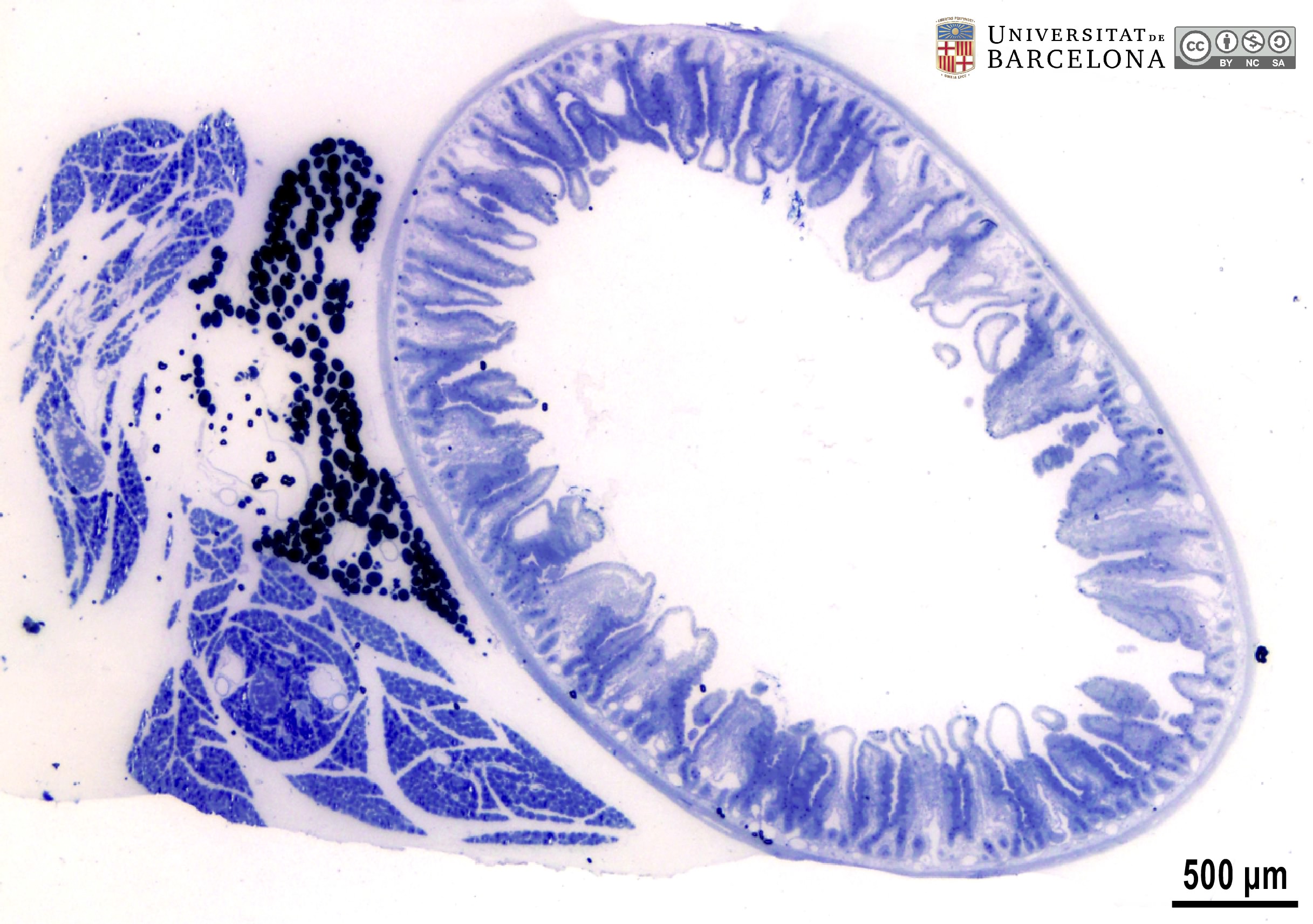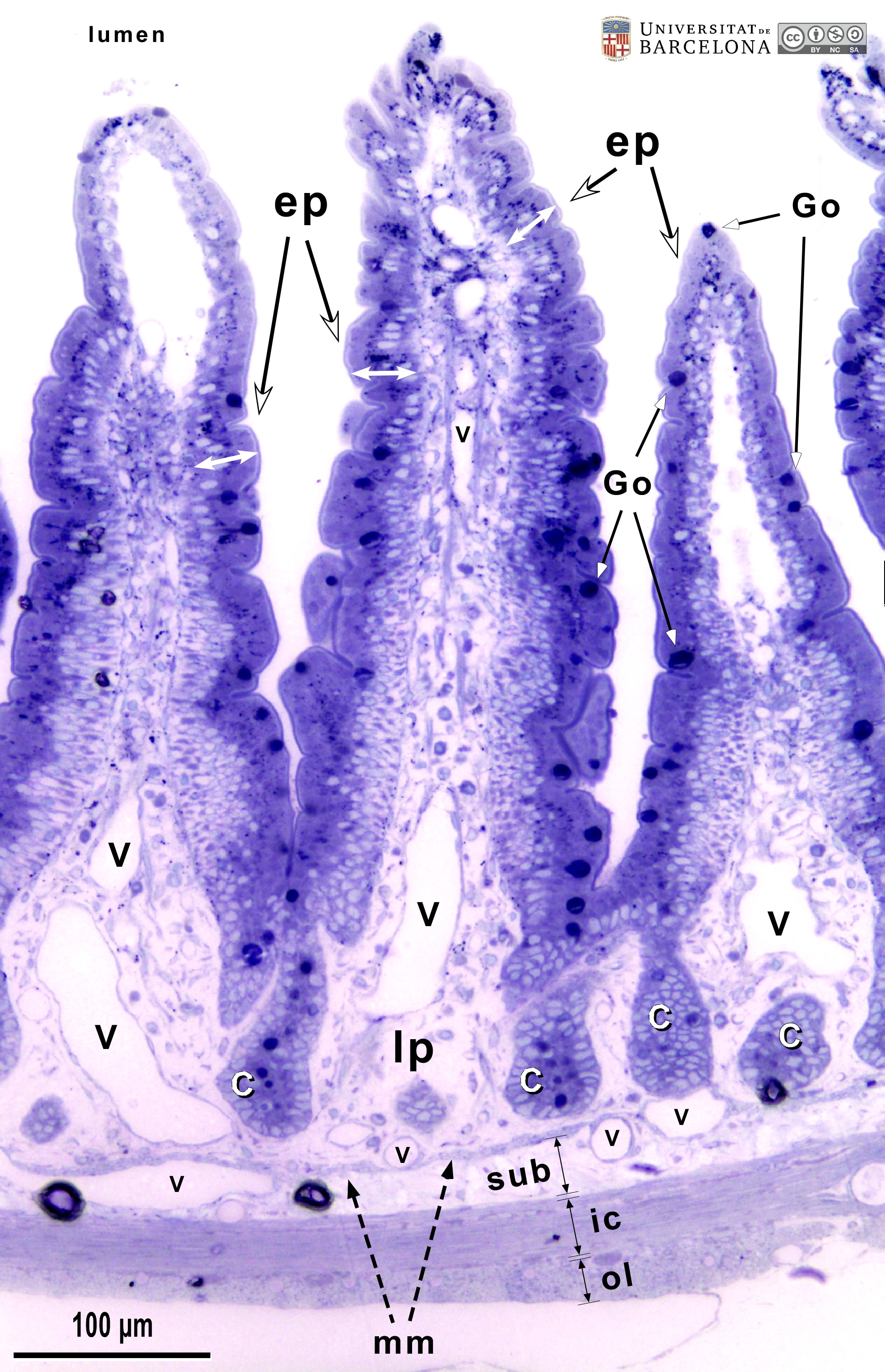 P_O_duodenum2_semithin2um_20x_11_13_collage_LETTERS.jpg | Organisation of the duodenal wall in a rat (collage of micrographs allowing moderate zoom). Three villi are observed. They are covered by a single-layered epithelium (ep) composed of tall cells (white bidirectional arrows, ↔), i.e. a simple columnar epithelium. Goblet cells in the epithelium contain a round mass of mucous granules (Go) stained dark blue. The epithelium also forms deep pits in the wall termed crypts (c). Within the villi, a lamina propria (lp) is present with scattered cells and numerous vessels (v). It also occupies the space between the crypts. The deepest border of the mucosa is a thin layer of smooth muscle cells: the muscularis mucosæ (mm). Beneath this lies the submucosa (sub) which is also rich in blood vessels. The muscularis externa is more darkly stained and can be divided into an internal – circular – layer (ic) and an outer – longitudinal – layer (ol). Osmium tetraoxide postfixation, epoxy section 2 µm thick, toluidine blue stain. | 1.07 MB | JPEG | ![]() View/Open |