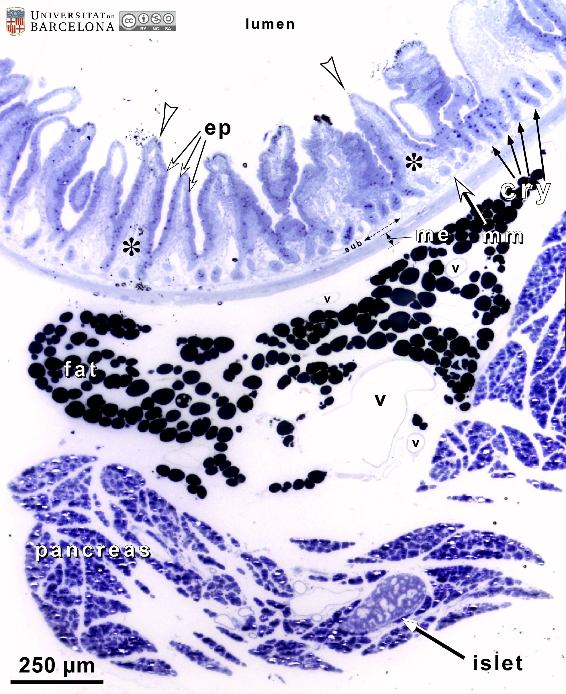 P_O_duodenum2_semithin2um_4x_03_04_collageB_LETTERS.jpg | Duodenal wall and adjoining pancreas in a rat. Villi protrude from the surface (empty arrowheads). They are lined by a simple epithelium (ep) and enclose the lamina propria (asterisks). The epithelium also extends into the mucosa, forming crypts (cry). A thin muscularis mucosae (mm) is barely noticeable at this magnification and forms the deepest limit of the mucosa. Adjacent to it lies the submucosa (sub), which is narrow and palely stained, and then the muscularis externa (me). In the loose connective tissue of the mesenterium, adipose tissue (fat) and blood vessels (v) are observed. In the pancreas, lobules containing secretory acini and some islets are present. Osmium tetraoxide postfixation, epoxy section 2 µm thick, toluidine blue stain. | 866.88 kB | JPEG | ![]() View/Open |