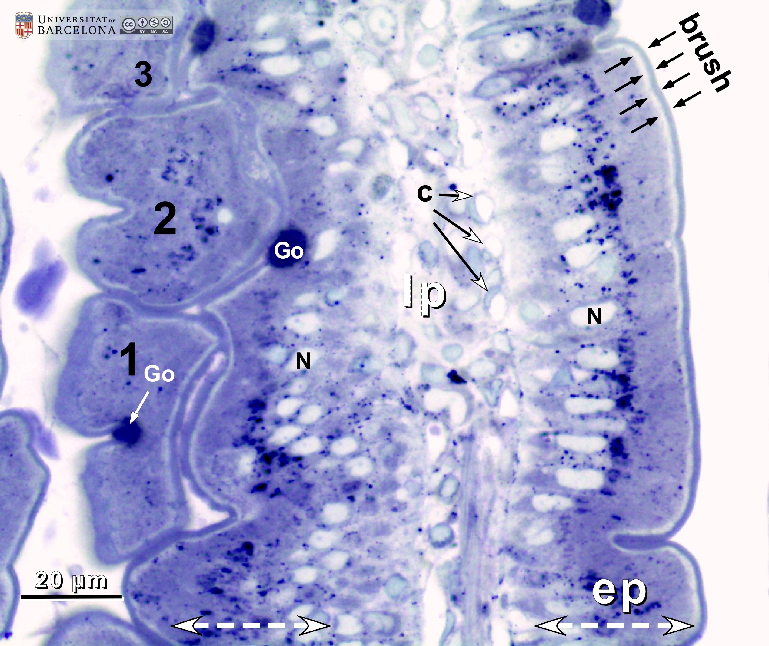 P_O_duodenum2_semithin2um_50X_40_epithelium_LETTERS.jpg | Villi in the rat duodenum. The epithelium consists of tall cells (ep, bidirectional dashed arrows) with a lightly stained nucleus (N) at the base and a darker cytoplasm. The apical surface displays the brush border, which corresponds to the microvilli seen in electron microscopy. The lamina propria (lp) lies in the core of the villus and contains numerous capillaries (c) just beneath the epithelium. On the left, three tangential sections of villi (1, 2, and 3) are observed, all delineated by a brush border. Osmium tetraoxide postfixation, epoxy section 2 µm thick, toluidine blue stain. brush, brush border; Go, mucous accumulation in the apical part of goblet cells. | 798.31 kB | JPEG | ![]() View/Open |