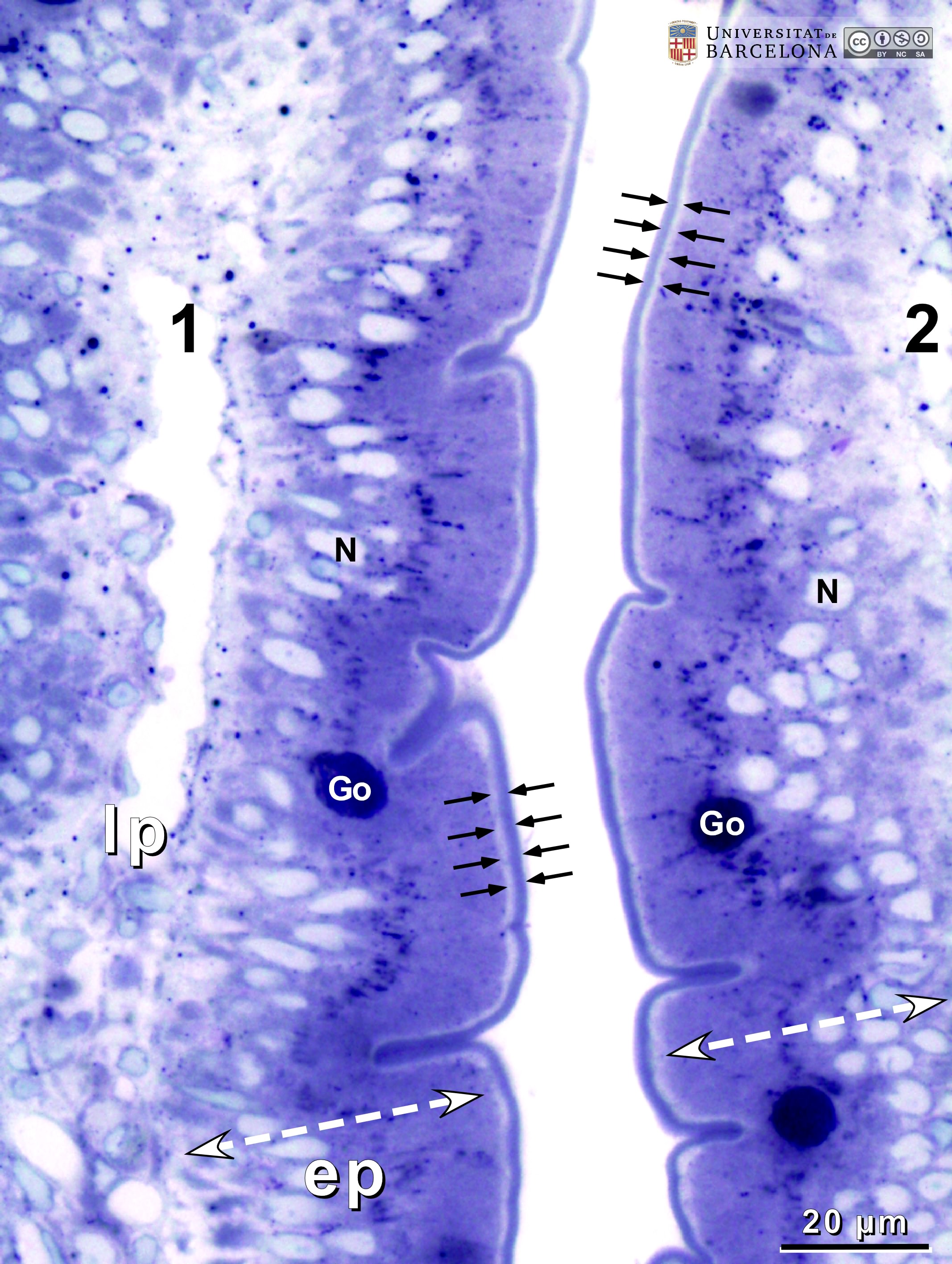 P_O_duodenum2_semithin2um_50X_22_epithelium_LETTERS.jpg | Absorptive epithelium in two neighbouring villi (1 and 2) in the rat duodenum. The epithelium (ep) consists of tall cells (white bidirectional dashed arrows) with a dark cytoplasm and a brush border at the surface (black arrows). In the apical part of goblet cells, round accumulations of mucus are stained dark blue (Go). Nuclei (N) are unstained and not perfectly aligned due to the tangential section of these villi. Inside villus 1, the lamina propria with scattered cells is observed. Osmium tetraoxide postfixation, epoxy section 2 µm thick, toluidine blue stain. | 890.41 kB | JPEG | ![]() View/Open |
