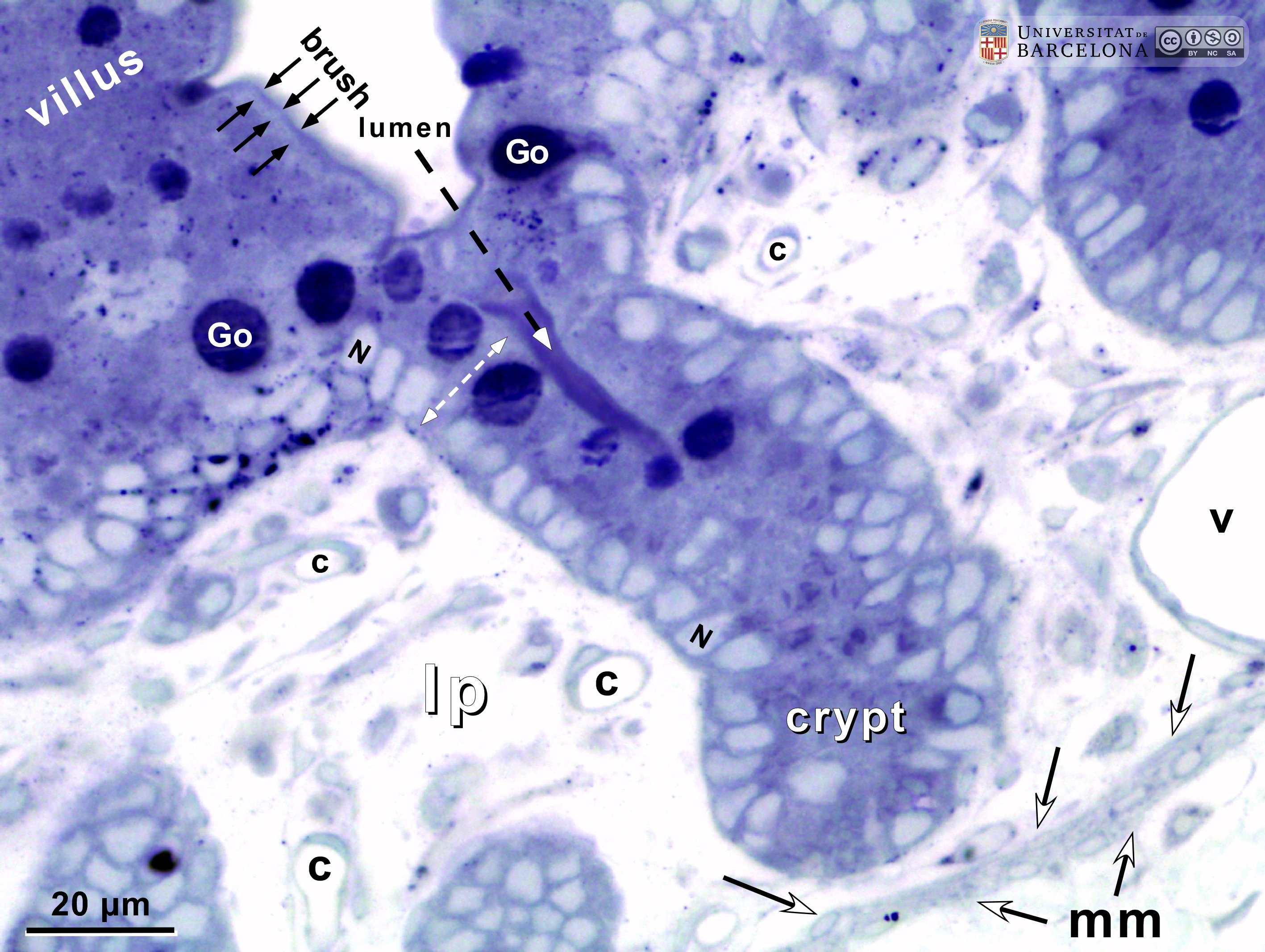 P_O_duodenum2_semithin2um_50X_24_crypt_LETTERS.jpg | Deep layers in the duodenal mucosa in a rat. The epithelium in the villus invaginates into the mucosa, forming a crypt. Cells are tall (white bidirectional arrows) and cell nuclei (N) are oval and arranged in a single row. In goblet cells, mucous secretory granules are grouped in a round mass stained dark blue (Go). The brush border can be observed in the cells located higher in the villus, but the lumen in the crypt was cut tangentially, preventing visualisation of the brush border. The lamina propria (lp) surrounds the crypts. It contains few cells, a light matrix, capillaries (c) and larger vessels (v). The deep border of the mucosa is marked by two rows of smooth muscle cells cut transversally (round profiles) which constitute the muscularis mucosæ (mm). Osmium tetraoxide postfixation, epoxy section 2 µm thick, toluidine blue stain. | 836.35 kB | JPEG | ![]() View/Open |