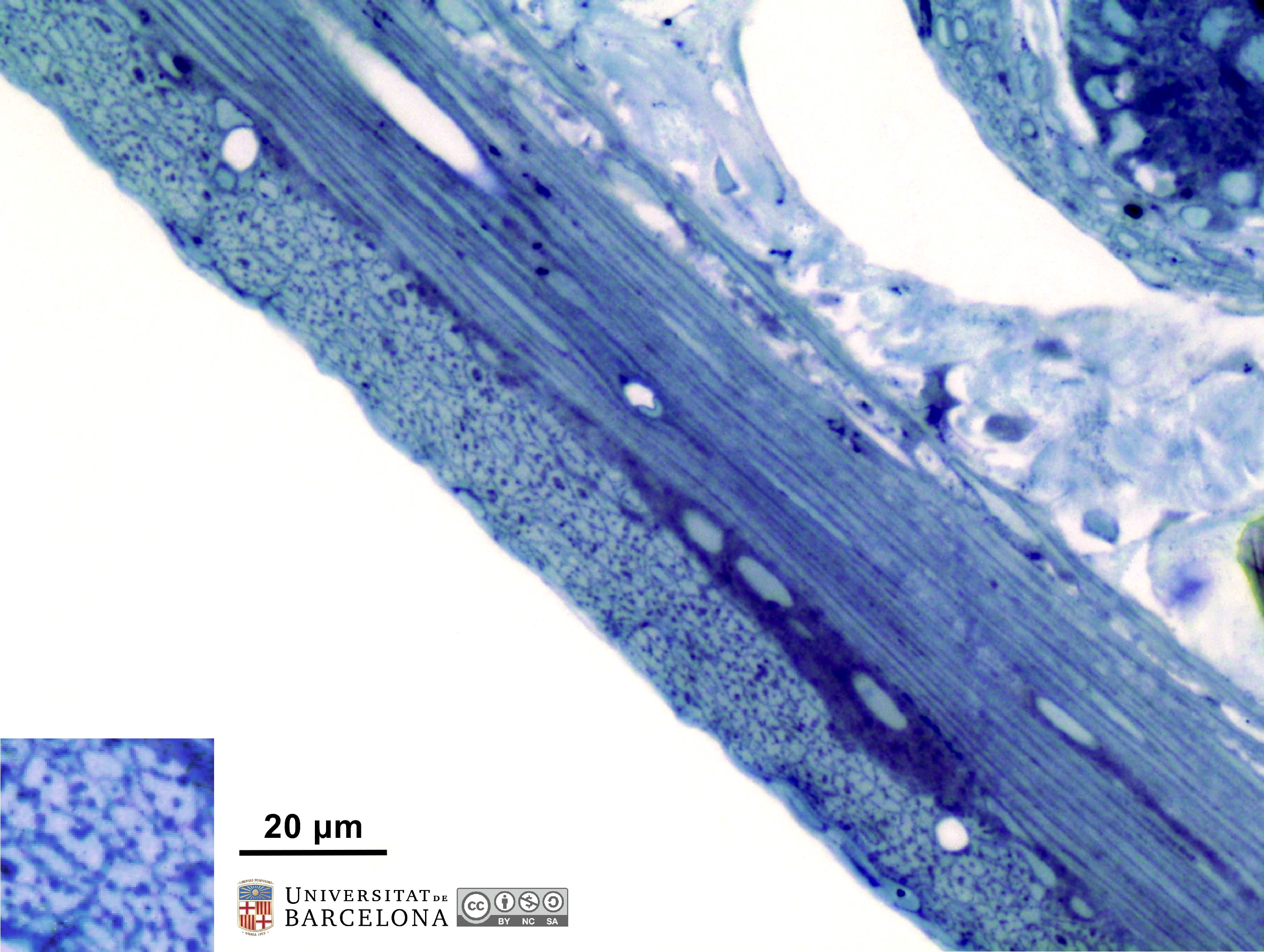 P_O_duodenum2_semithin2um_50X_34_ganglia_LETTERS.jpg | Myenteric ganglion in the duodenal wall in a rat. The muscularis externa is divided into two layers; an inner – circular – layer (ic) and an outer – longitudinal – layer (ol). The smooth muscle cells in the outer layer are cut transversally and appear as round or oval profiles (inset). Between these muscle layers, three neurones of a myenteric ganglion (A/m) are observed, each with a light nucleus and dark blue cytoplasm. Inset: Detail of the outer – longitudinal – layer of the muscularis externa. Osmium tetraoxide postfixation, epoxy section 2 µm thick, toluidine blue stain. c, capillary; mm, muscularis mucosae; sub, submucosa; ve, venule. | 854.1 kB | JPEG | ![]() View/Open |