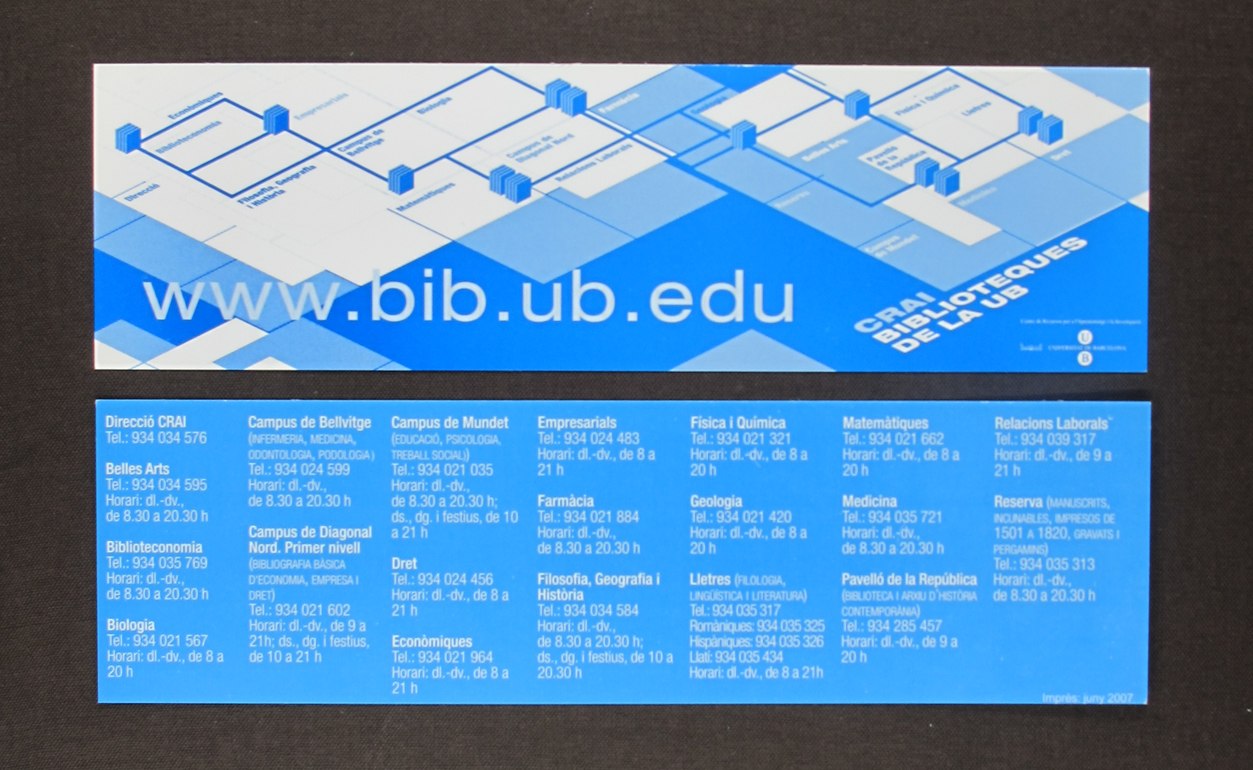 Objectiu: Facilitar els telèfons i horaris de les biblioteques del CRAI a tots els estudiants de la Universitat de Barcelona. Producte: Punt de llibre.