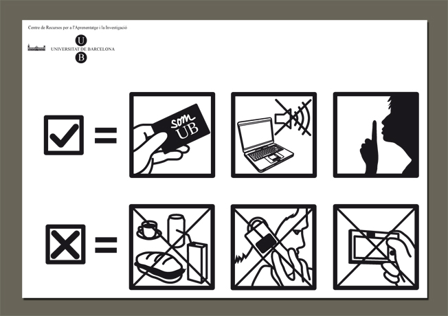 Objectiu: Informar i advertir sobre les normes de conducta que han d'observar els usuaris pel bon funcionament del CRAI Biblioteca. Producte: Cartell de vinil transparent amb imatges impreses de color negre per col·locar en lloc visible als CRAI Biblioteques.