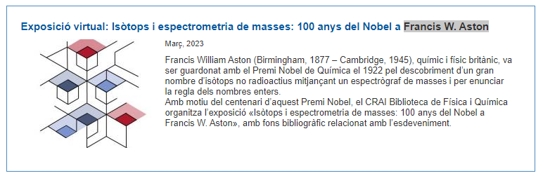 Isòtops i espectrometria de masses: 100 anys del Nobel a Francis W. Aston. Exposició virtual del CRAI Biblioteca de Física i Química. (Març 2023)