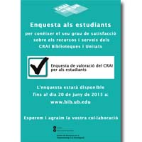 Objectiu de l'actuació: Incrementar la participació de la comunitat universitària en l'enquesta de satisfacció d'usuaris. // Descripció del producte: Bàner per al web del CRAI i Cartell per promoure les enquestes des dels CRAI Biblioteques.