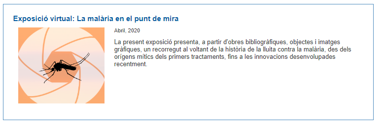 Universitat de Barcelona. CRAI. Exposició virtual: La malària en el punt de mira. (2020). [consulta: 24 de gener de 2026]. [Disponible a: https://hdl.handle.net/2445/152478]
