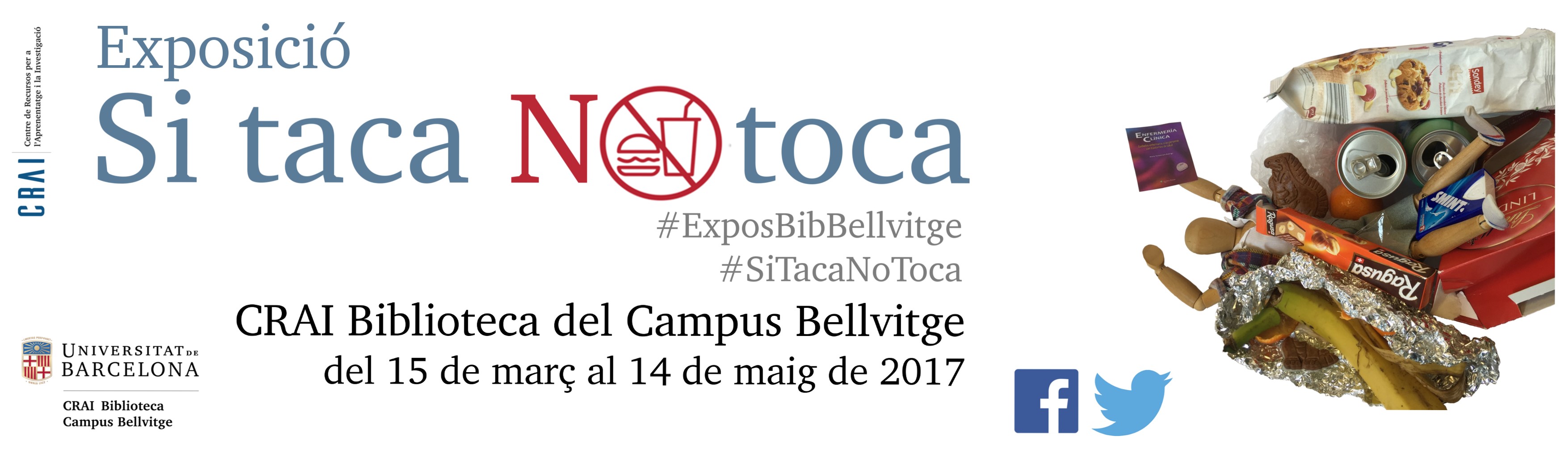 El CRAI Biblioteca del Campus Bellvitge presenta l’exposició «Si taca NO toca», una campanya que pretén sensibilitzar els usuaris de la biblioteca sobre els hàbits de menjar i beure en aquest espai. L’objectiu és promoure el bon ús de les nostres instal·lacions, equipaments i fons bibliogràfic. L'exposició fotogràfica evidencia, entre altres, la quantitat i varietat de deixalles que es poden arribar a acumular a la biblioteca en el període d’una setmana qualsevol.