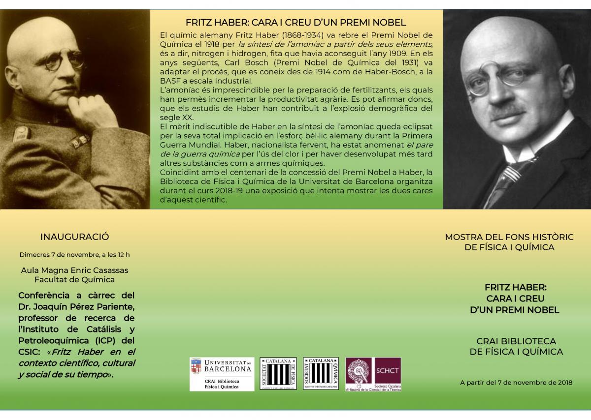 Coincidint amb el centenari de la concessió del Premi Nobel a Haber, la Biblioteca de Física i Química de la Universitat de Barcelona organitza durant el curs 2018-19 una exposició que intenta mostrar les dues cares d’aquest científic