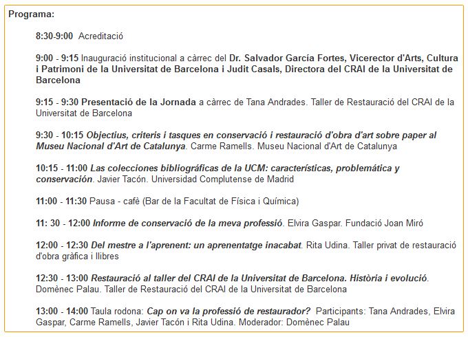 | dc.title | Jornada 20 anys del Taller de Restauració de la Universitat de Barcelona (Maig 2018) | ca |