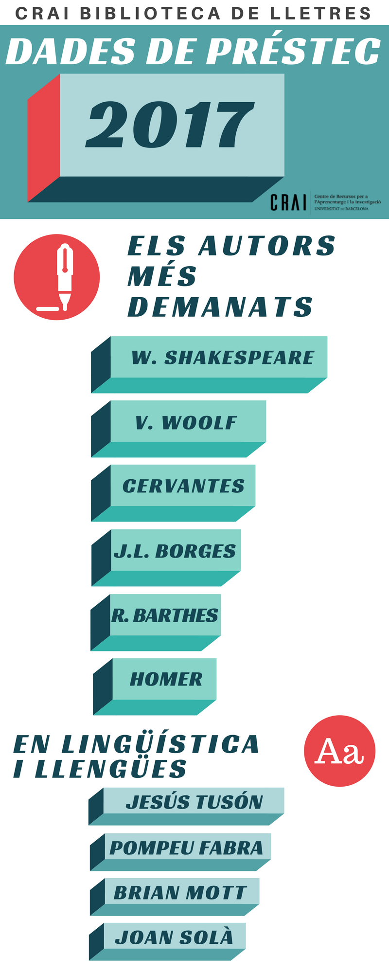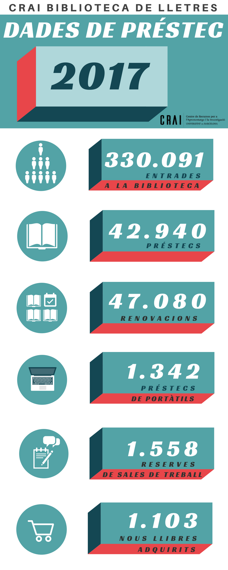 Universitat de Barcelona. CRAI Biblioteca de Lletres. CRAI Biblioteca de Lletres. Dades de préstec 2017 [Infografia]. [consulta: 25 de febrer de 2026]. [Disponible a: https://hdl.handle.net/2445/119478]