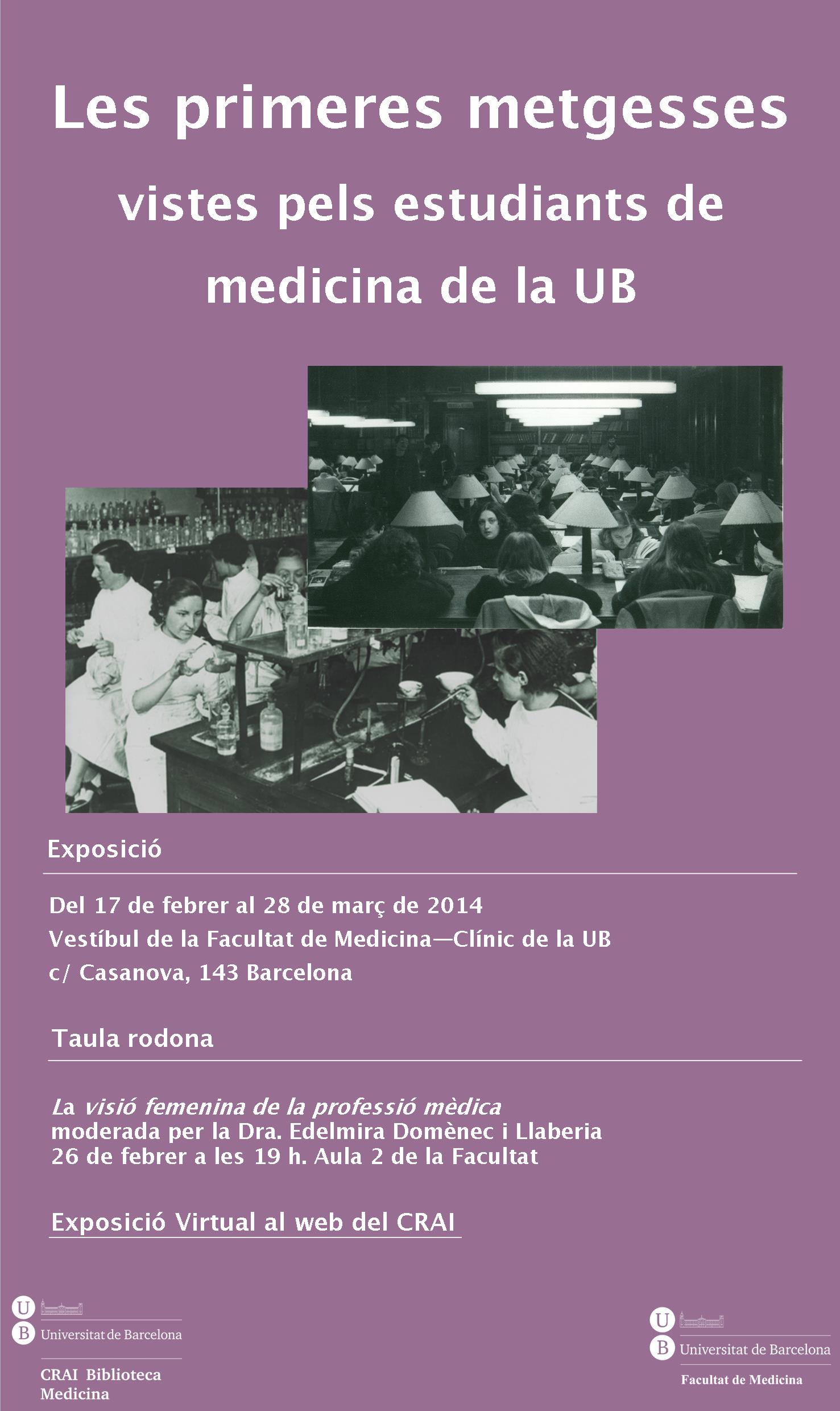 El CRAI Biblioteca de Medicina - Clínic juntament amb la Unitat d'Història de la Medicina i Ètica Mèdica organitzen l'exposició Les primeres metgesses vistes pels estudiants de medicina de la UB. La mostra s'emmarca dins del Cicle de Conferències i Exposicions "Medicina i Societat" del curs 2013-2014 que organitza la Facultat de Medicina (Campus Clínic) i es podrà visitar al vestíbul de la Facultat des del 17 de febrer al 28 de març de 2014. Les primeres metgesses ... vol mostrar els diferents punts de vista dels estudiants de medicina de la UB respecte a la feminització de la medicina, a través dels treballs dels alumnes de la Unitat d'Història de la Medicina, des de l'època clàssica fins als nostres dies. Complementa l'exposició una Taula rodona que tindrà lloc el dia 26 de febrer a les 19h a l'Aula 2 de la Facultat de Medicina (Campus Clínic), amb el tema La visió femenina de la professió mèdica i serà moderada per la Doctora Edelmira Domènec i Llaberia, Catedràtica de Psicopatologia de la Facultat de Psicologia de la Universitat Autònoma de Barcelona.