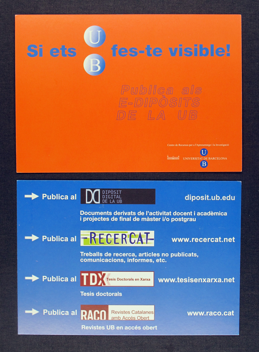 Objectiu: Informar de l'existència i accés als dipòsits digitals en els que participa el CRAI de la Universitat de Barcelona. Producte: Postal promocional.