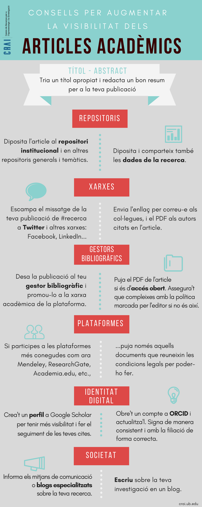 Universitat de Barcelona. CRAI Biblioteca de Lletres. Consells per augmentar la visibilitat dels articles de recerca [Infografia]. [consulta: 25 de febrer de 2026]. [Disponible a: https://hdl.handle.net/2445/110750]