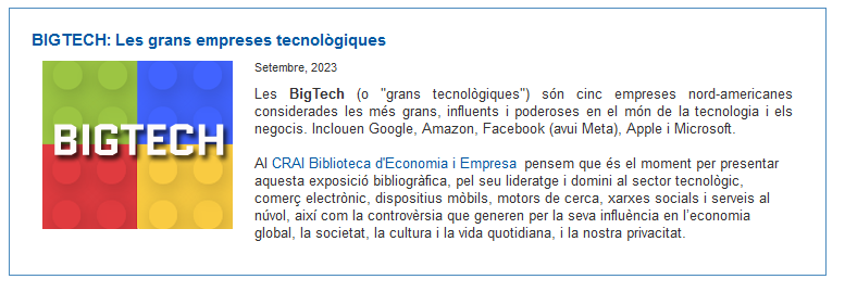 BigTech: les grans empreses tecnològiques. Exposició al CRAI Biblioteca d'Economia i Empresa . (Setembre 2023)